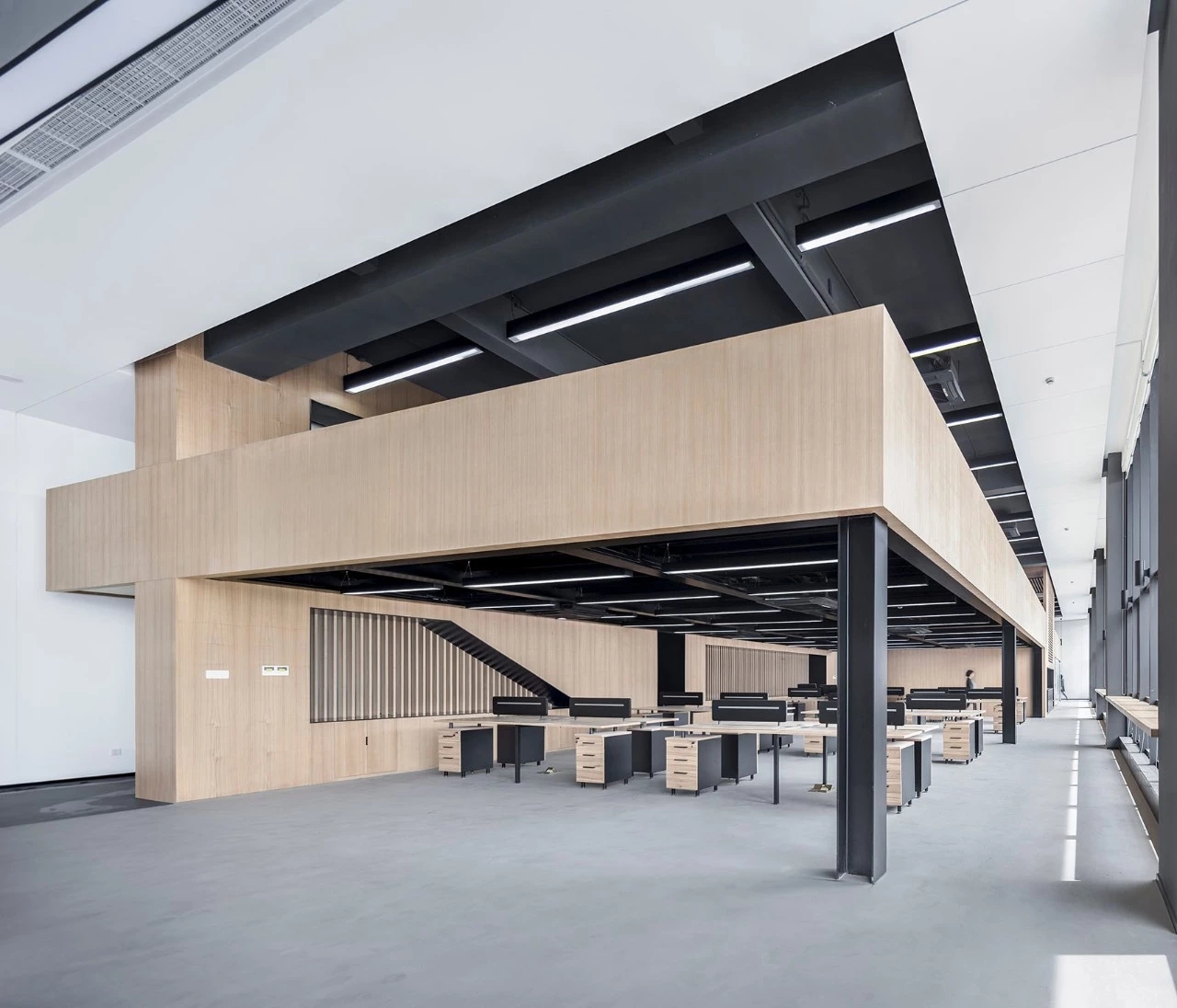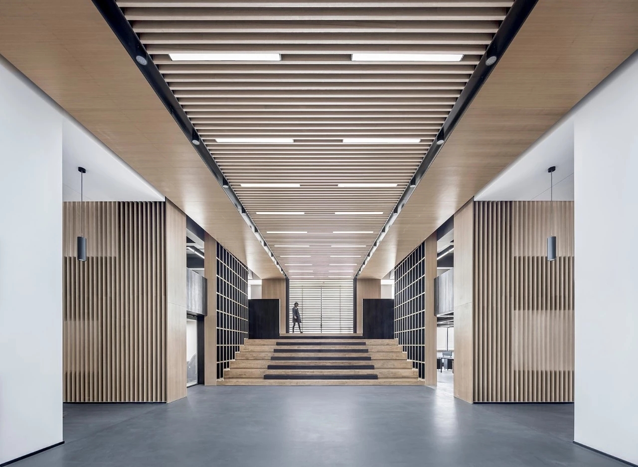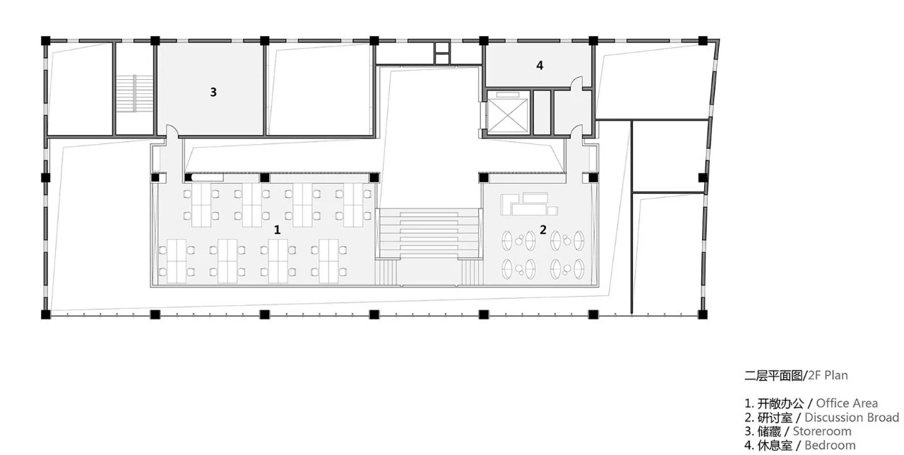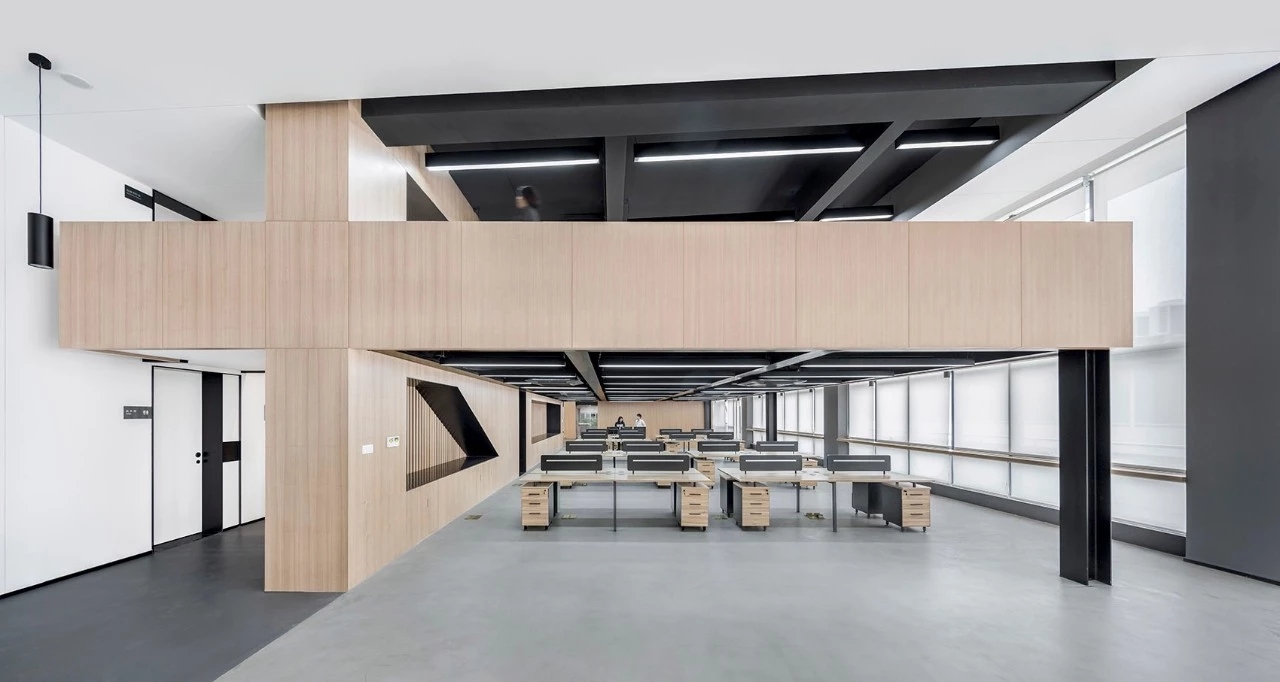 作为独栋式办公楼顶层空间,原建筑格局为传统中廊式办公模式,建筑层高介于5米至6米之间,四面墙面采用传统竖条窗设计。希望除了改善建筑的采光、通风等物理性能之外能创造一个带有开敞通透、具有时代感、面向未来的趣味性办公场所。