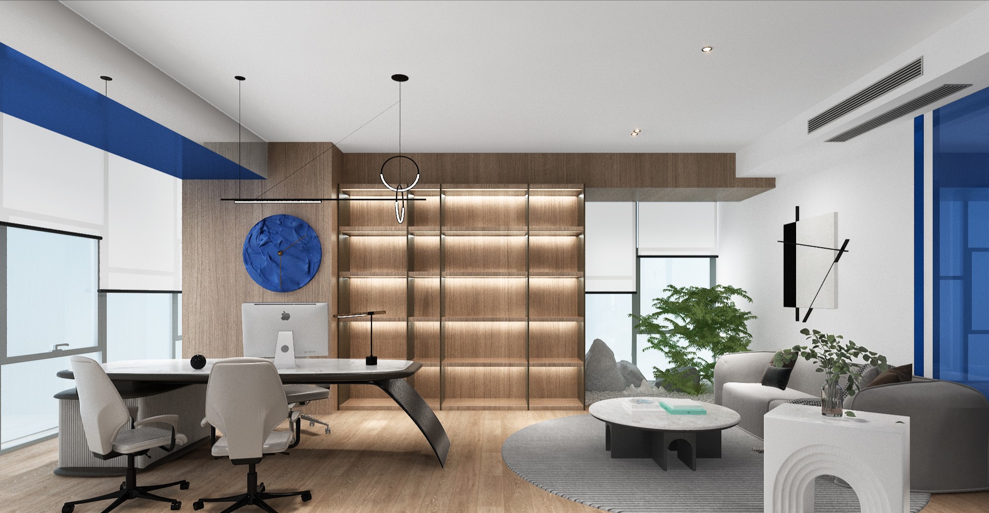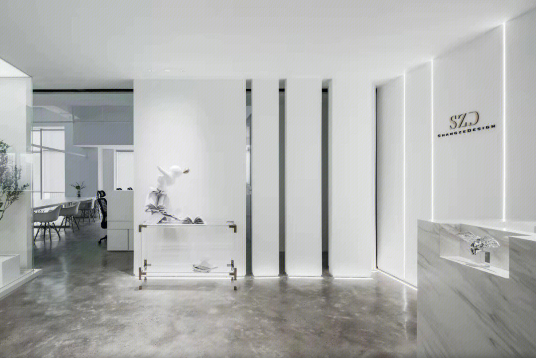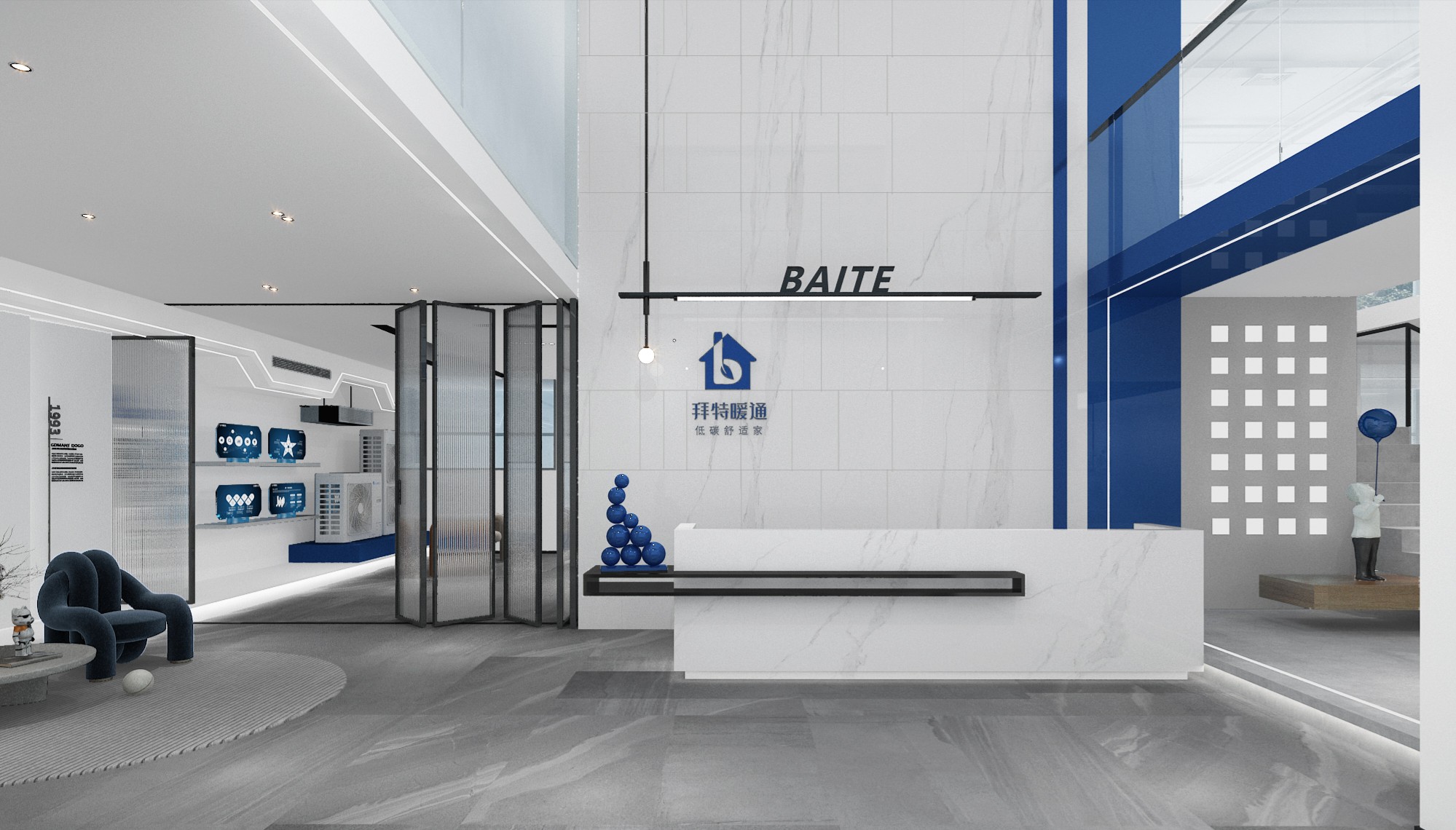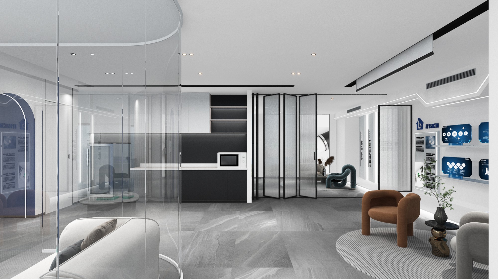 空间以白色为底,蓝与黑穿插其间,纯净的配色与简洁的线性结构组合,干脆利落、冷酷硬朗,给人预见之感。