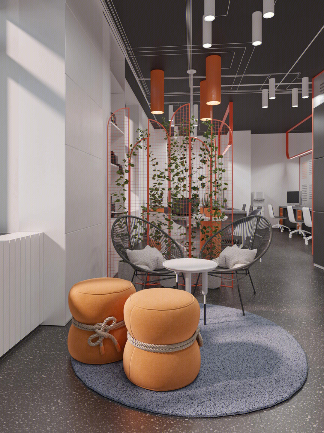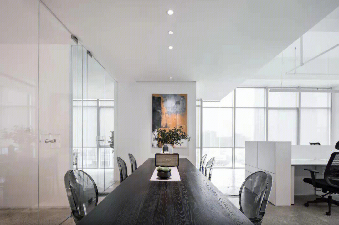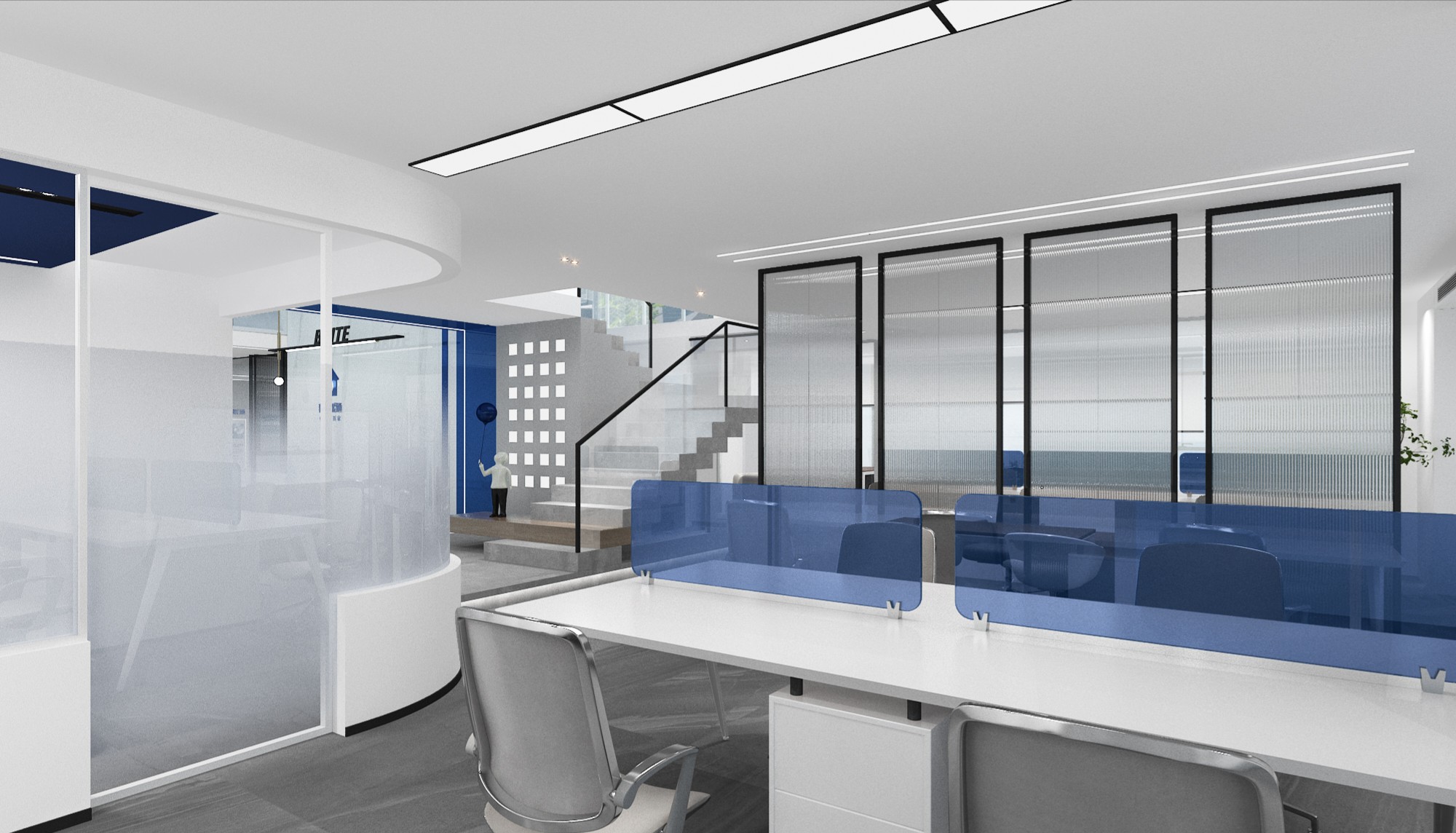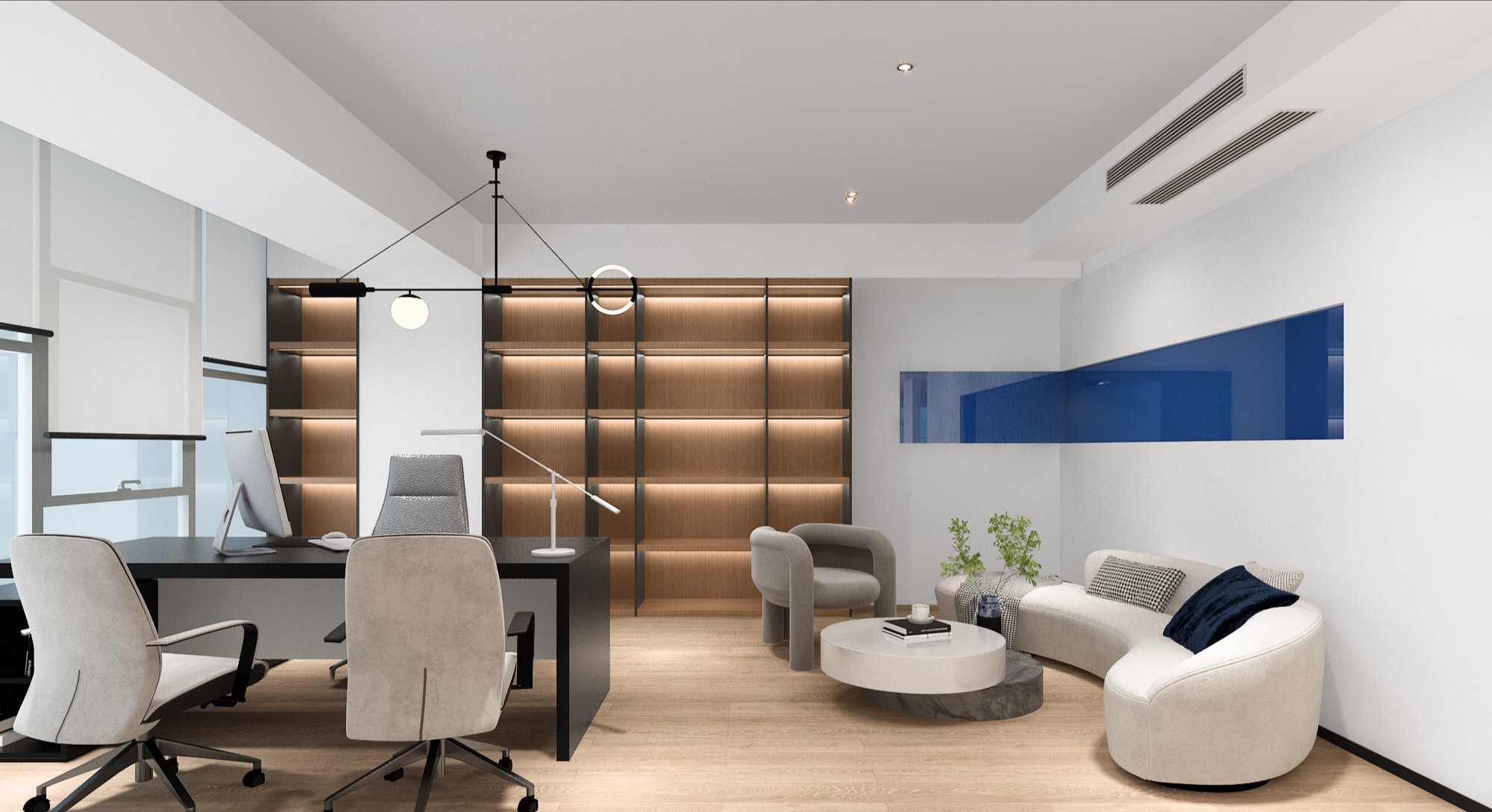 空间以白色为底,蓝与黑穿插其间,纯净的配色与简洁的线性结构组合,干脆利落、冷酷硬朗,给人预见之感。