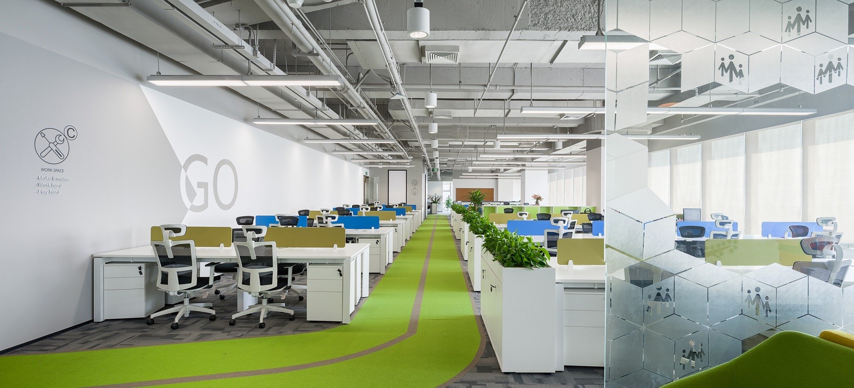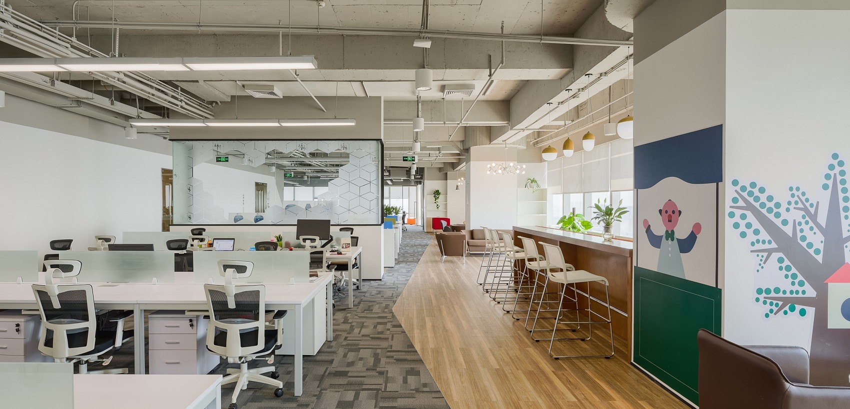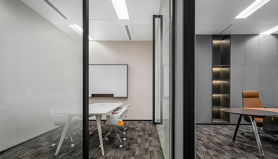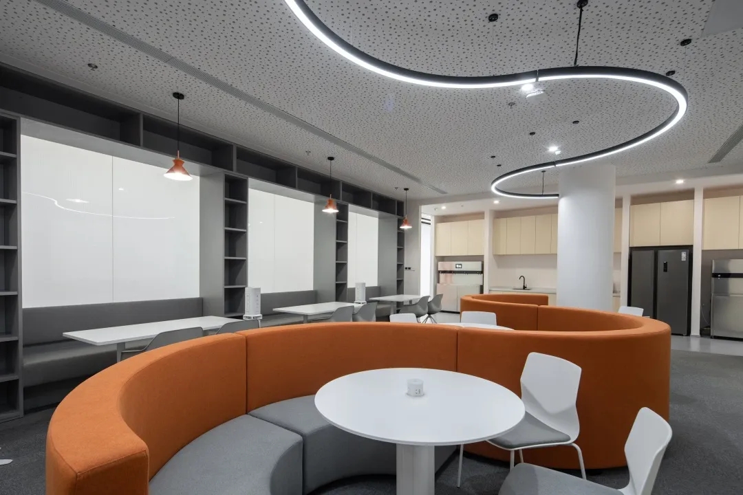 设计结合乐心企业使命,融合了智能办公、绿色环保和身心健康的理念,通过融入自然元素和其他健康设计和管理的方法,打造有助于身心健康的舒适办公环境、调动员工的积极性。从人的角度出发来设计工作环境,通过取消传统隔断方式,而采用地面铺设的区别进行分区,空间创造灵活的区域来实现办公空间利用的最大化。