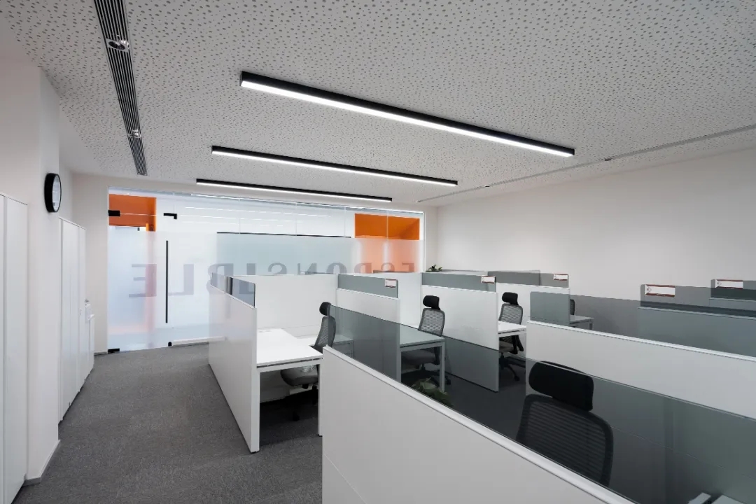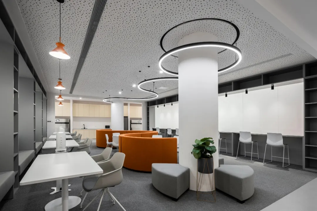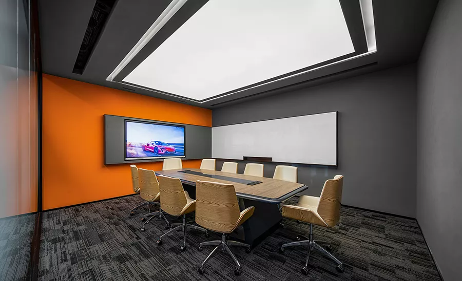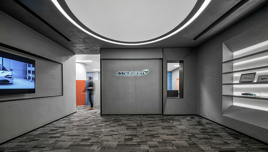 边界 重构在入口超大圆形天光灯膜下步入,营造了汽车展厅和办公空间相互辉映,用相对平直的空间来切分,一些必须的办公区域,使其在空间中通过外部的视觉感官体验,与内部的品牌内核本质产生微妙链接,犹如McLaren造车理念,体块横穿于各个功能区域,为满足员工各种不同使用情景需求提供背景,就像舞台聚光下的「演员」上演一出特別的剧目。