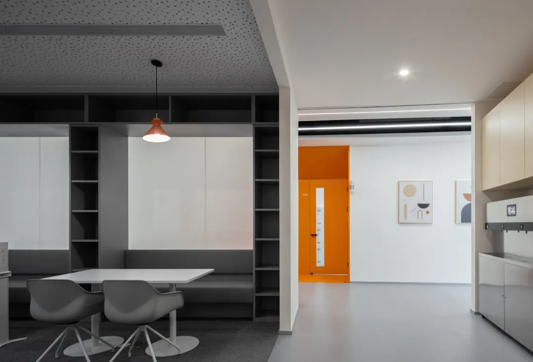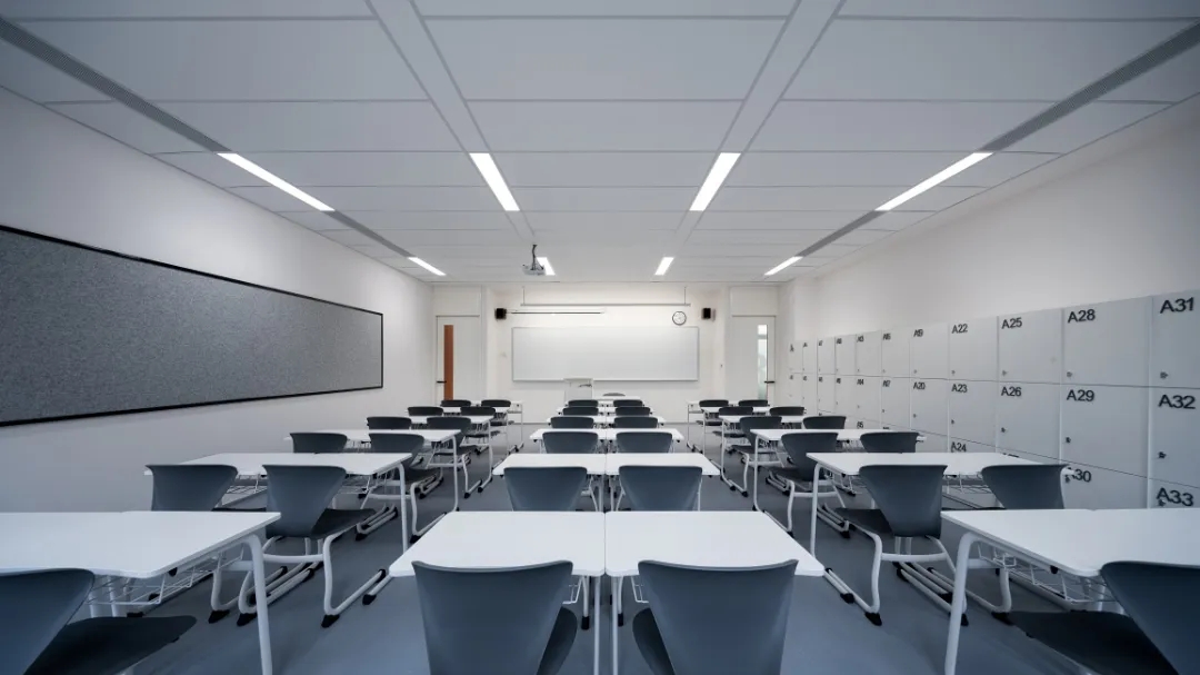 教师办公室和校长办公室,装修设计上主要以简洁明快为主,更能提升空间的使用效率。不需要有太多花里胡哨的装饰,艳丽缤纷的色彩容易使人分散注意力。墙面干净而又不失质感,顶面的简约线条与墙面、地面相呼应,强调空间的整体性。整个空间显得光洁明亮,为教师们提供了良好的办公氛围。