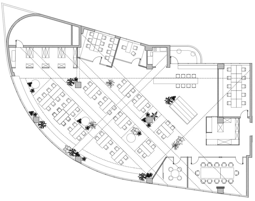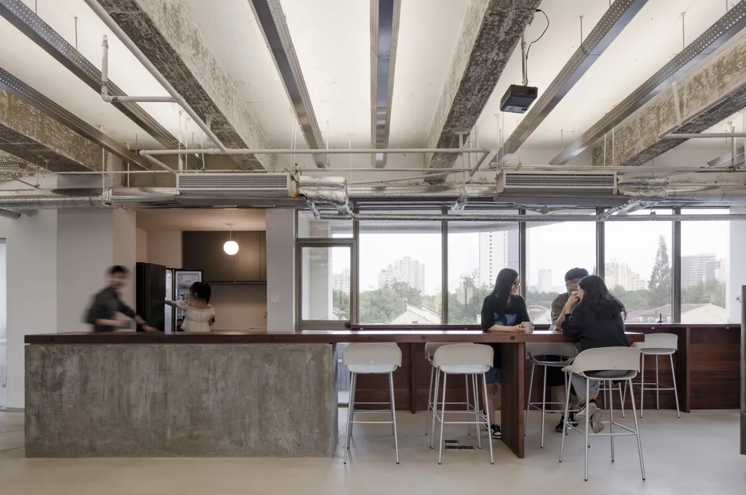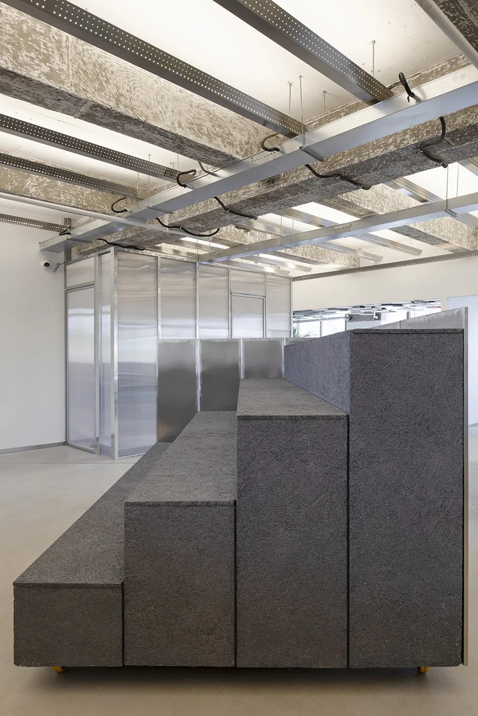 整个空间以道路的几何网格进行布局,由不同色调的抛光混凝土地板定义,连接不同部门会议、存储和娱乐等。