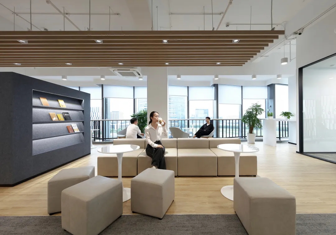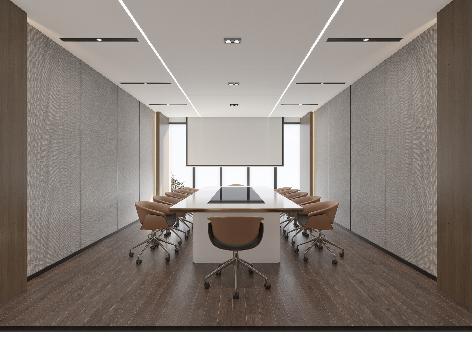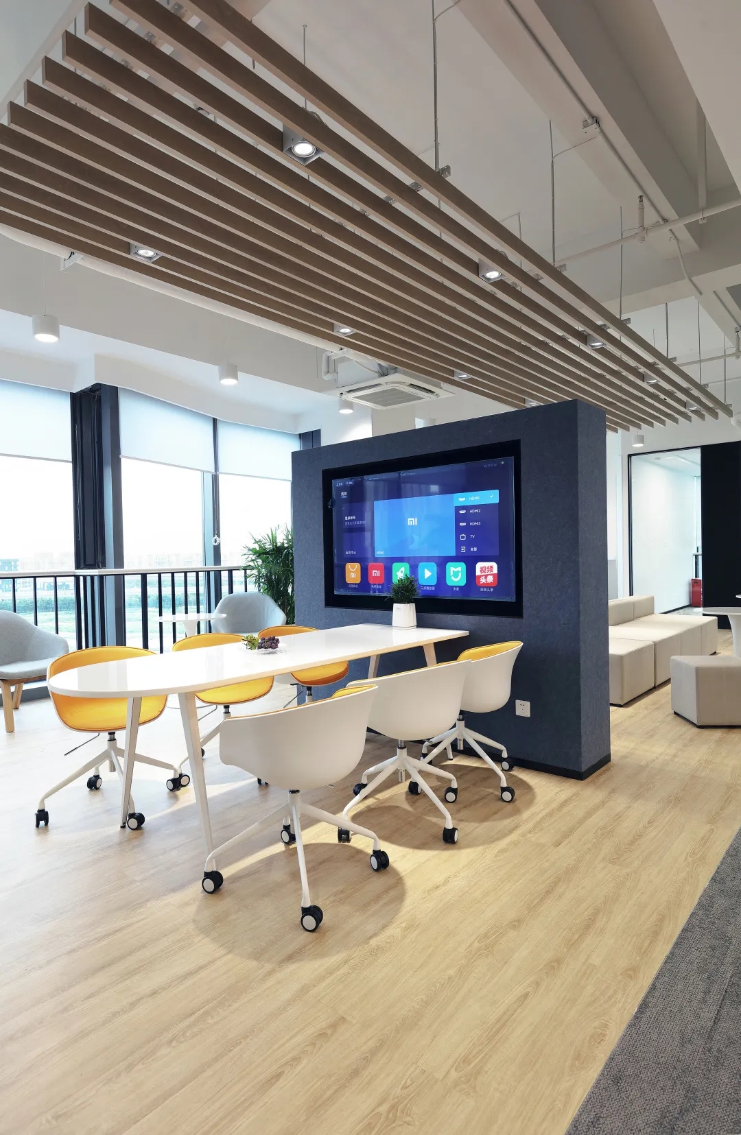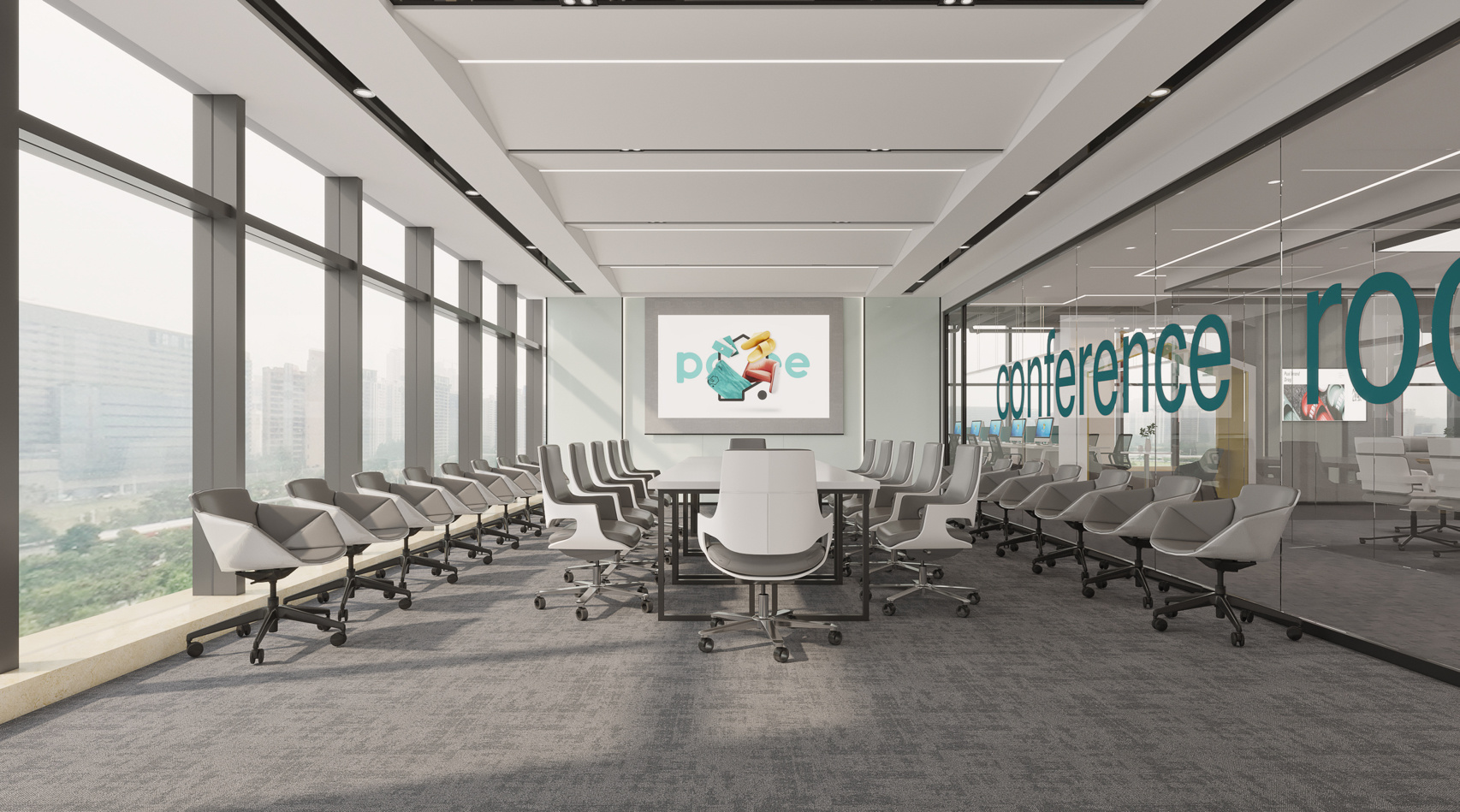 当访客走出电梯厅,开敞明亮的接待空间和logo墙映入眼帘,接待空间最里边是一间接待室用于访客等待和面试,这块空间设计师用创新的手法让整个空间像一只手一样把人才招揽进来,以表达百优达对人才的重视,再通过以人为本的办公环境,提升员工满意感,助力吸引和留住人才。进入办公层迎面是一间会客室,会客室用于来访客户接待,及百优达荣誉展示。除了传统的会议室布局,还用了大量的吸音材料,大大缩短了会议交谈的声音传递,为整个空间赋予独一无二的声学体验。
