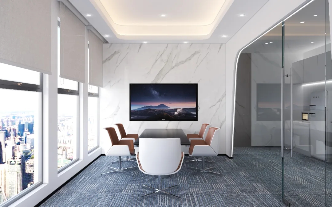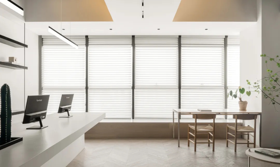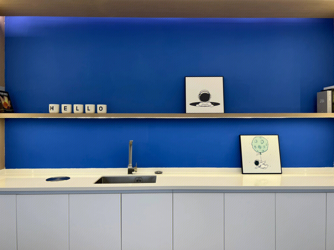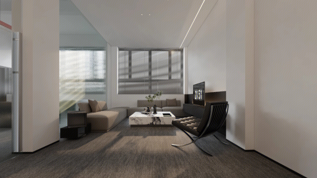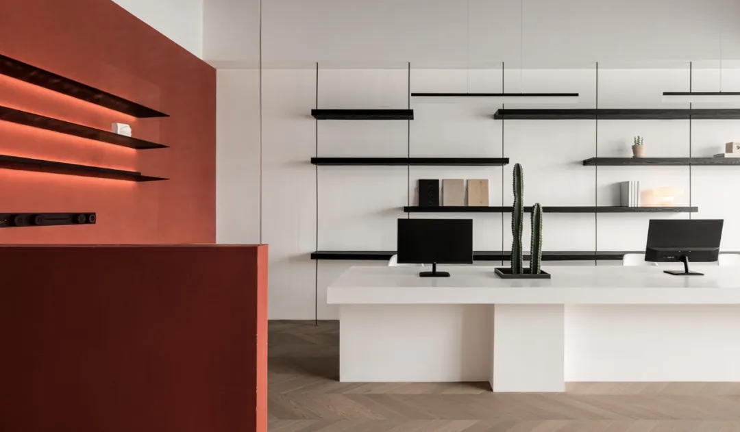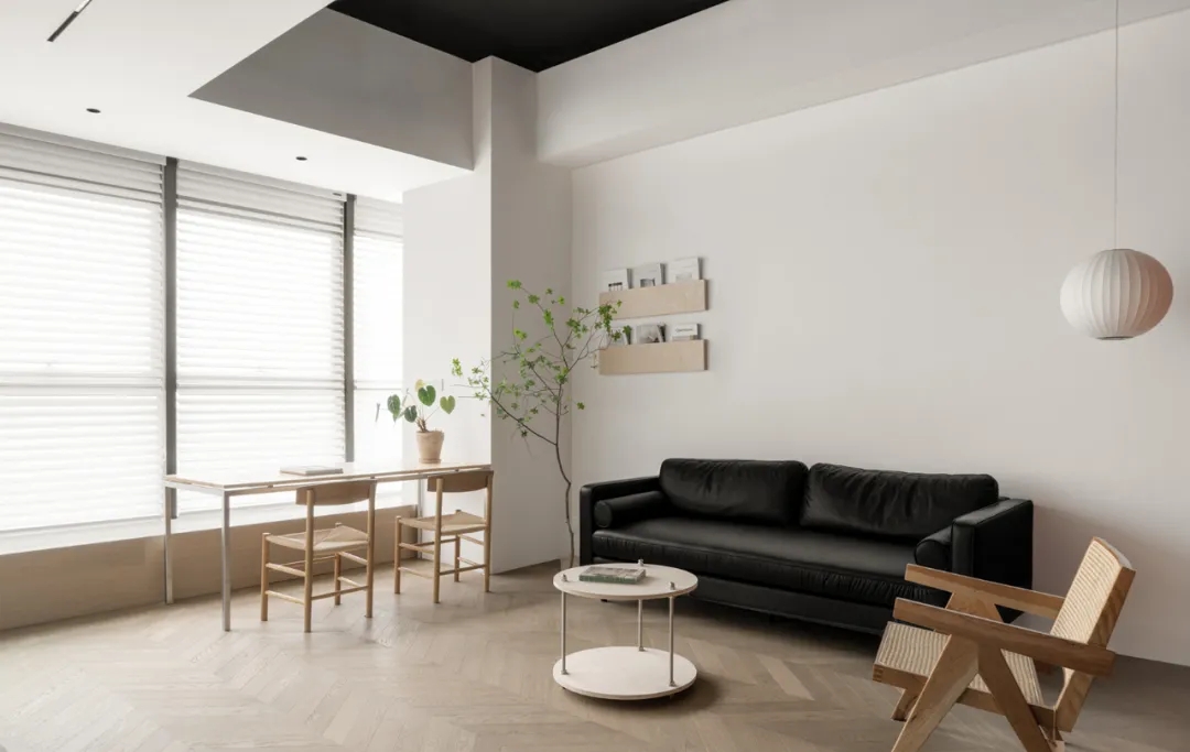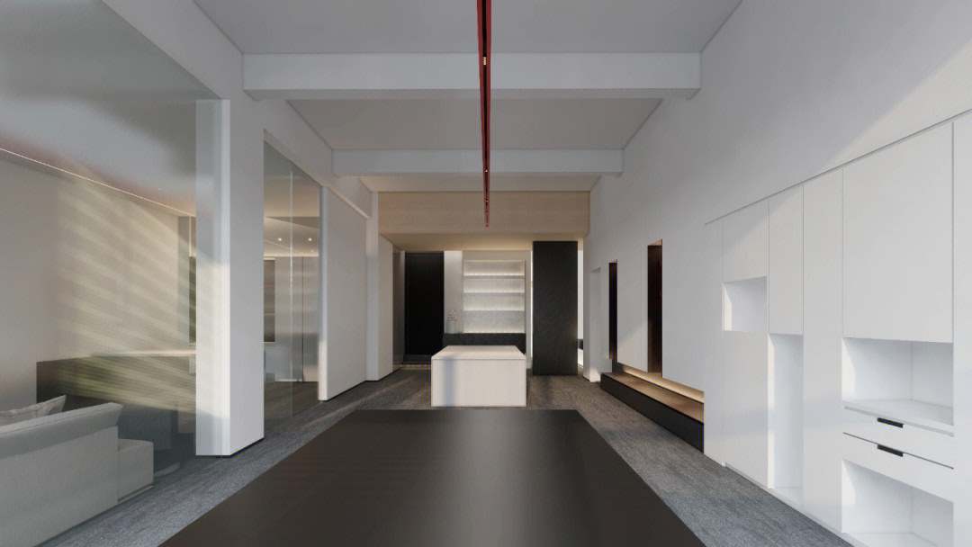 门口将地面抬高15cm做成一个盒子的形状,玻璃的结合自然形成一个小小天窗。类似夯土色泽的艺术涂料是最后反复挑选定稿的颜色,在具体有视觉冲击力的同时意外的也让人感受到平静。