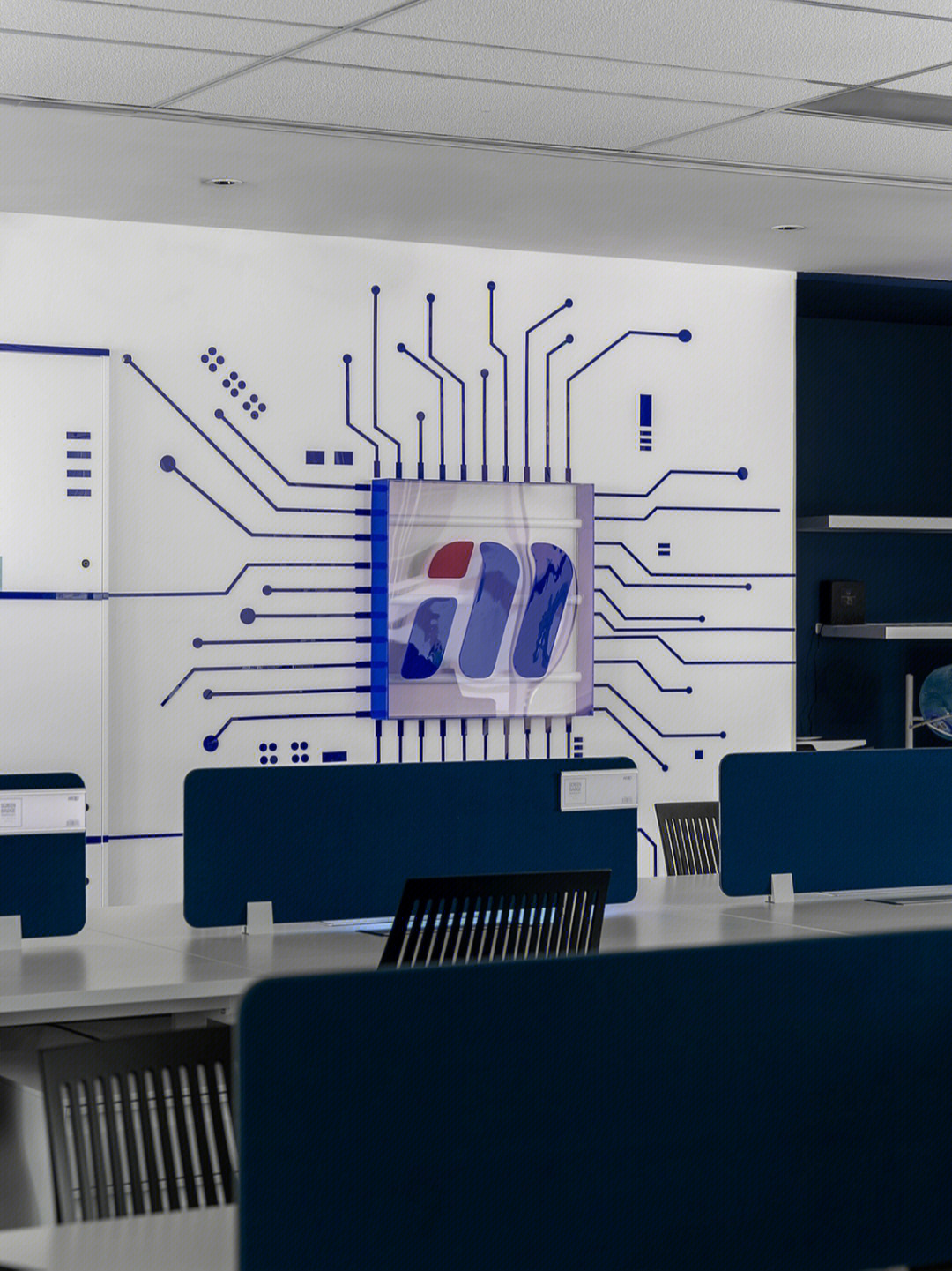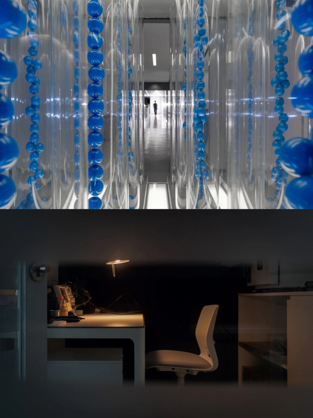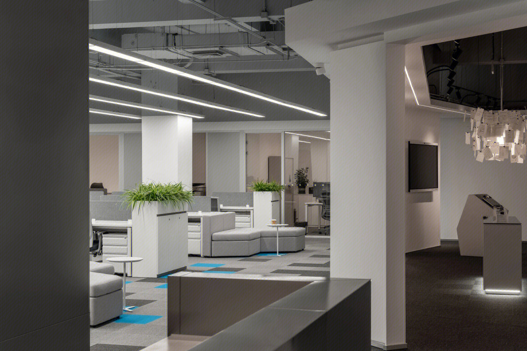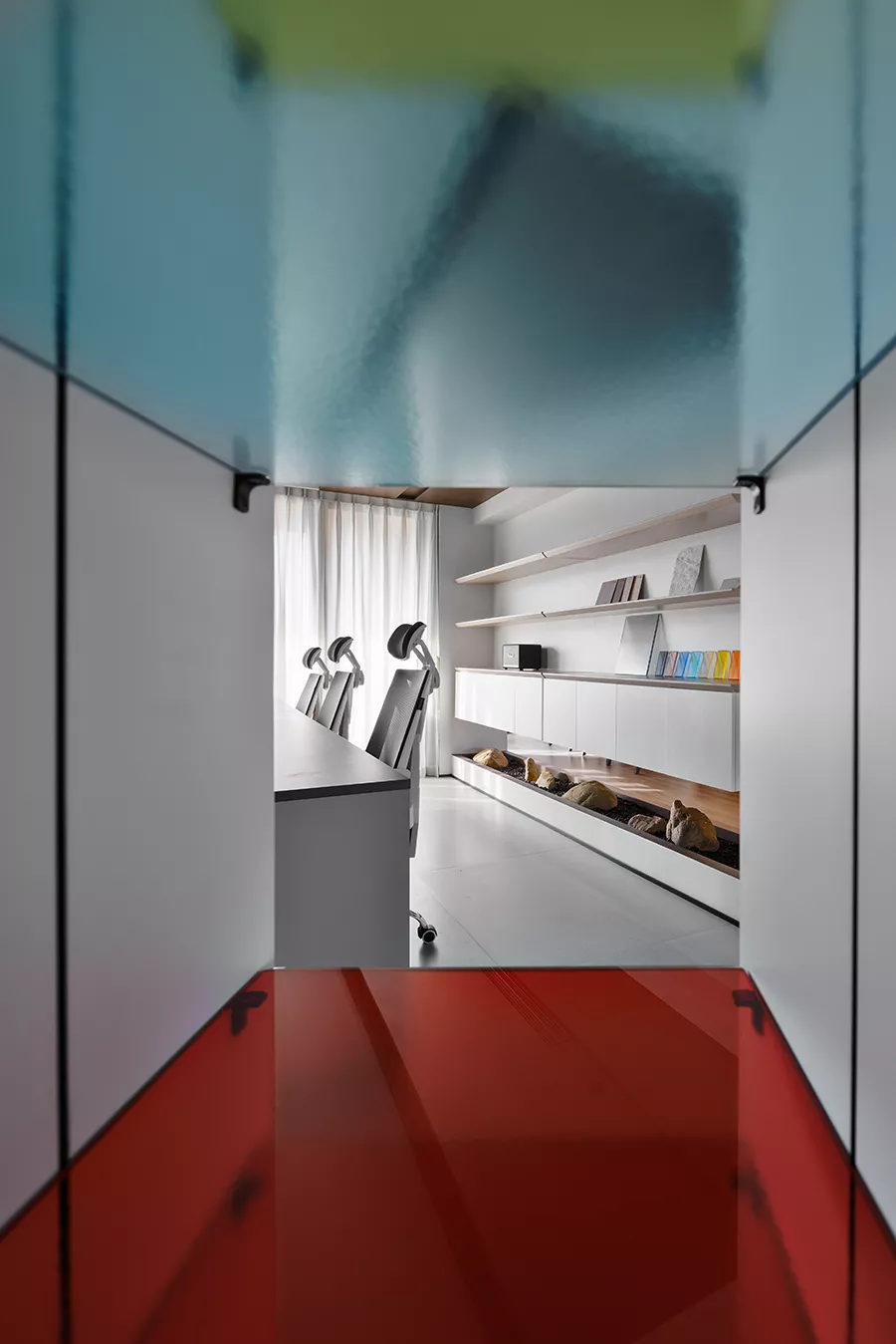 在空间的构成上,通过对称 错位 穿插 悬空等设计手法,实现现代语境中办公环境的视觉效果,空间强调品质生活体验,扩大了公共开放区域,提高了生活化的配置,通过生活品质和艺术修养的连接,让进入新环境的人们,能从中感受到愉悦感,从入口走进办公空间,钢板 涂料 瓷砖这些不同肌理的材质,于不同时段的光线中,线条与块面的明暗变化尤为强烈