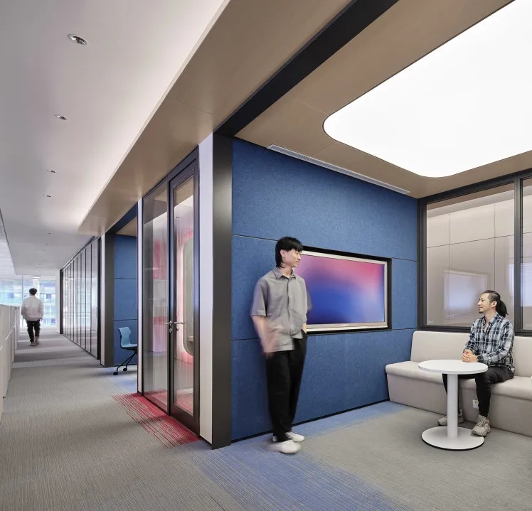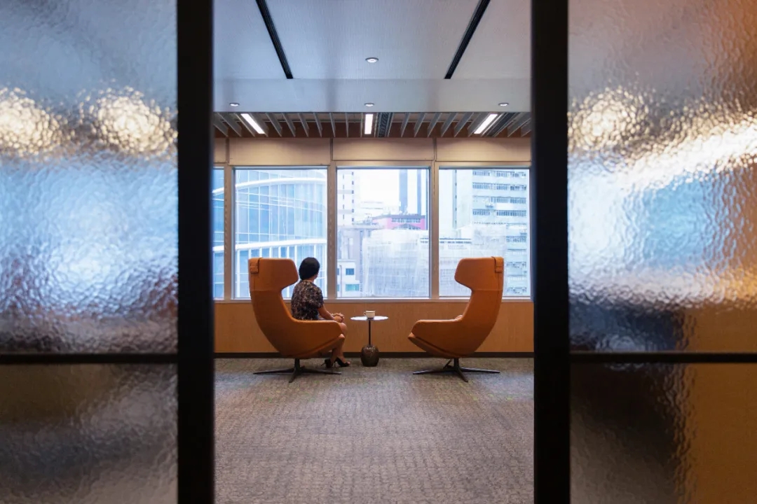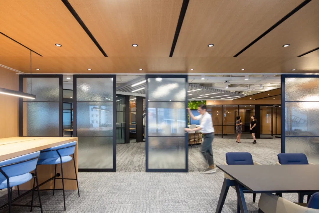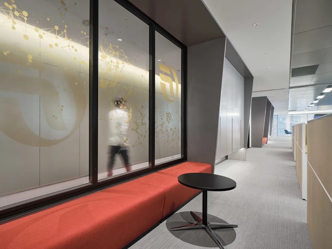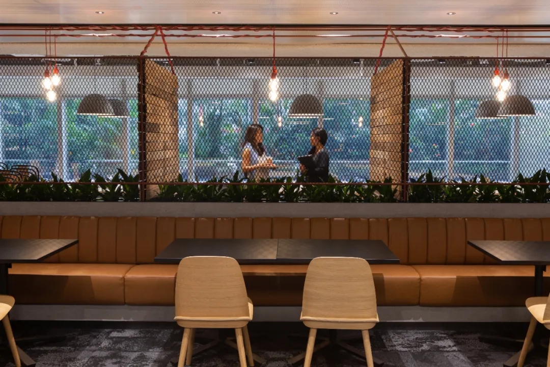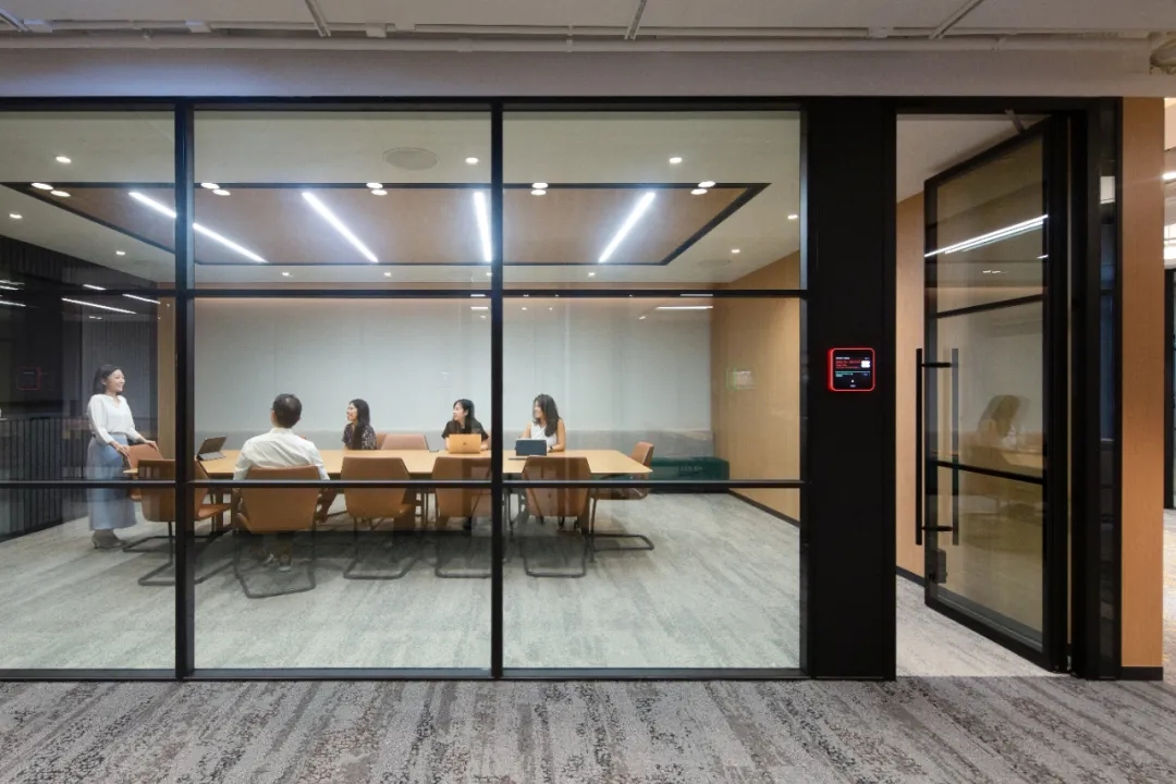 工业风玻璃框架、木炭色的隔音板和具有金属光泽的窗帘,加之以暖色系木材装饰,使正式的会议和商务休息室空间变得柔和,在满足年轻人群需求的同时,自然而然地提振精神。