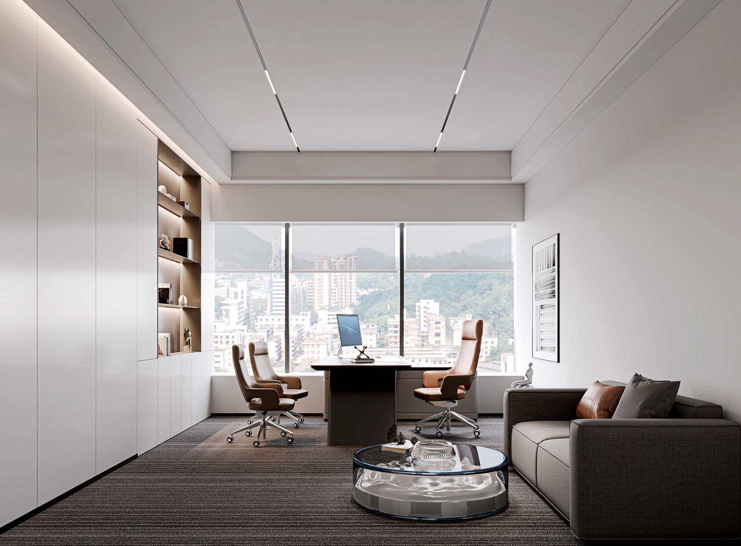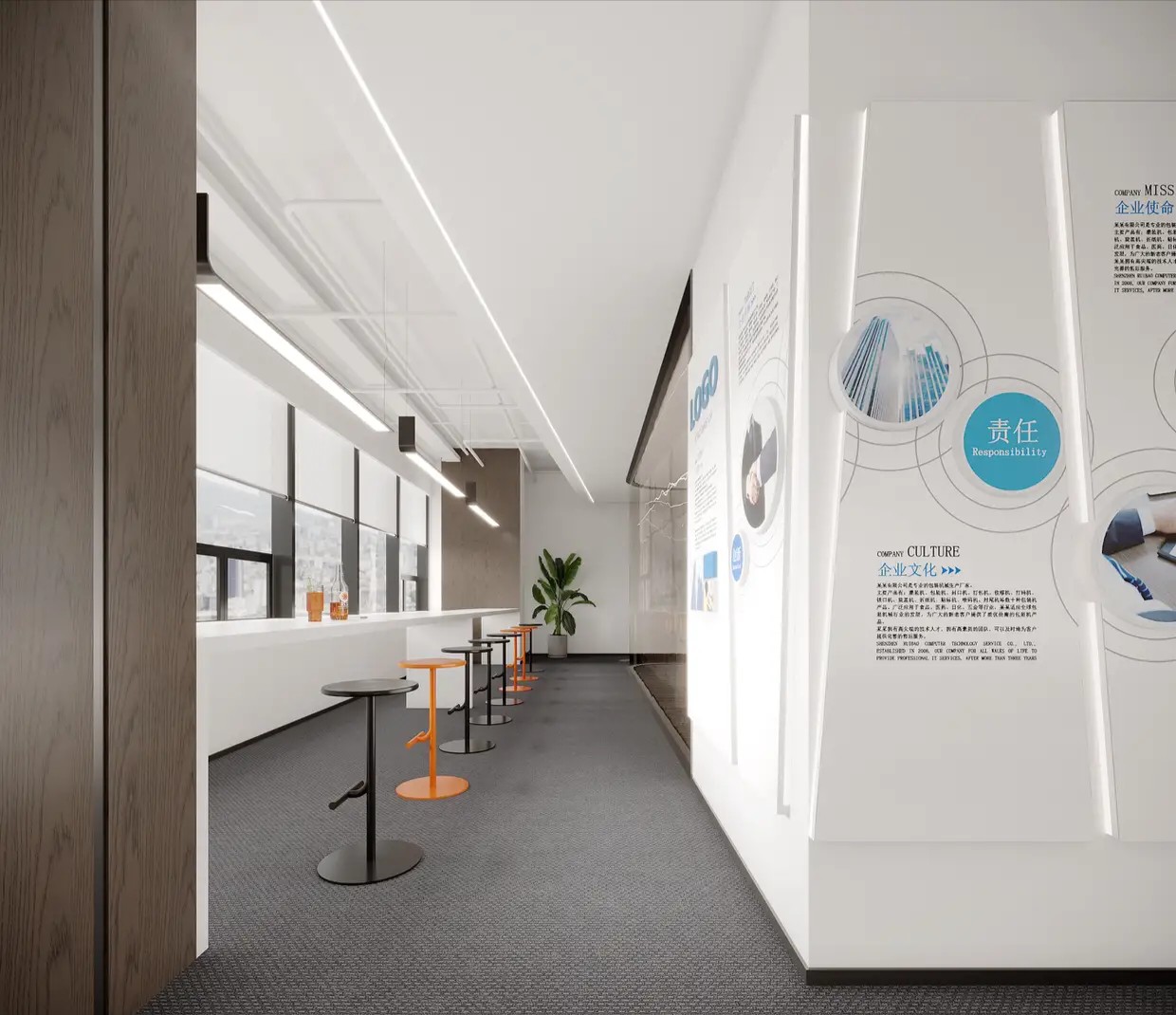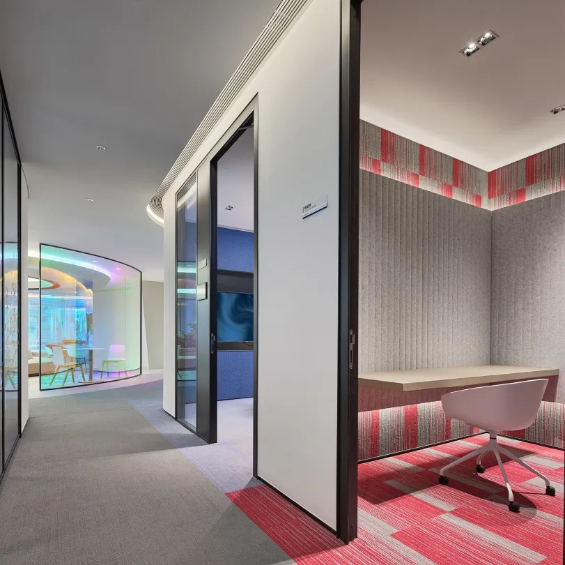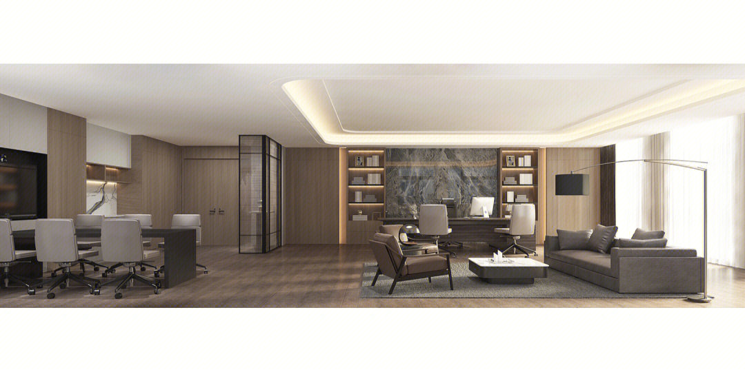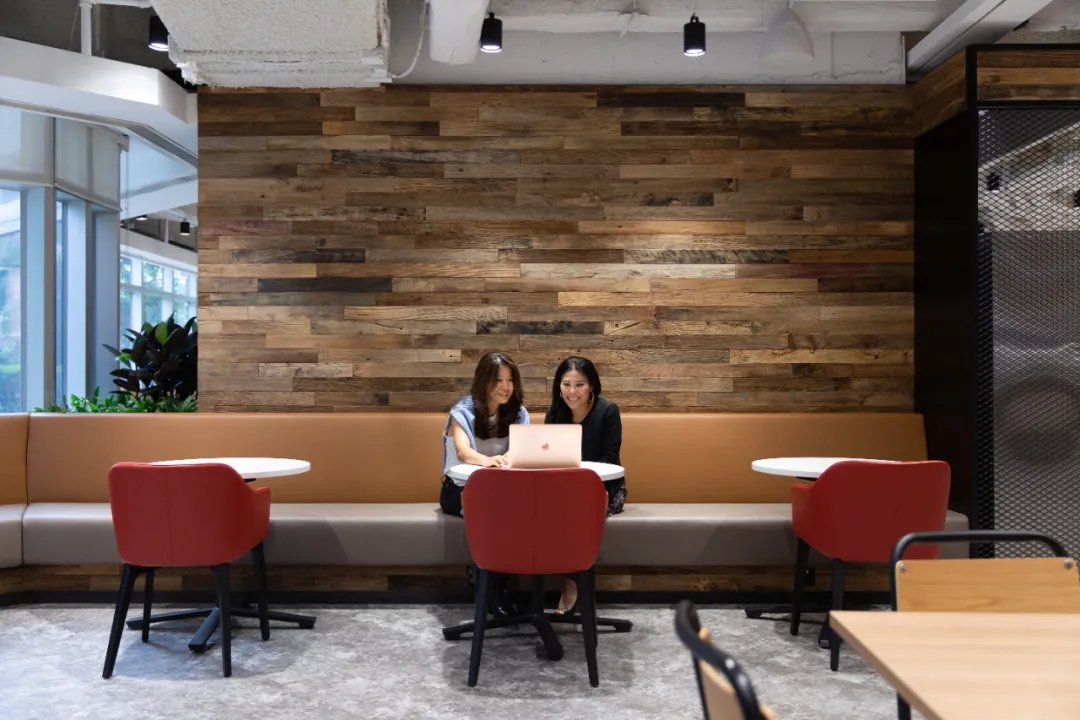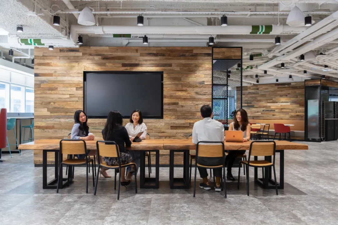 工业风玻璃框架、木炭色的隔音板和具有金属光泽的窗帘,加之以暖色系木材装饰,使正式的会议和商务休息室空间变得柔和,在满足年轻人群需求的同时,自然而然地提振精神。
