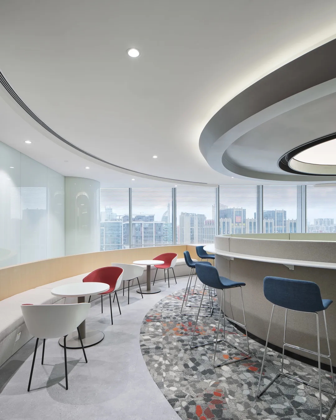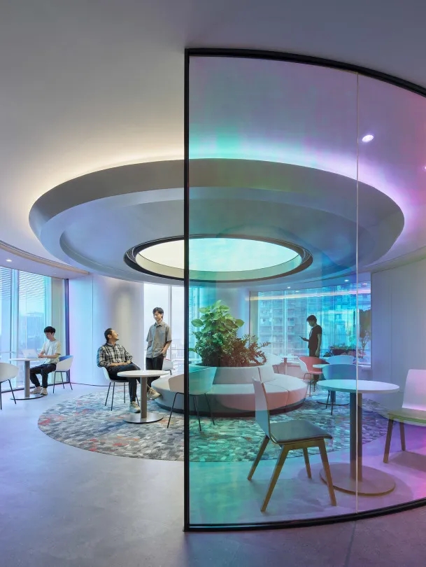全新的客户室(Client Suite)从观塘工业区独特历史和盐场中获得了灵感。为了展现这一独特的文化和历史,设计师从大量的几何图案、纹理和盐晶体材料中汲取灵感,并用这一主题诠释整个空间,包括在整个空间内采用晶体结构和呈现棱镜光效果。