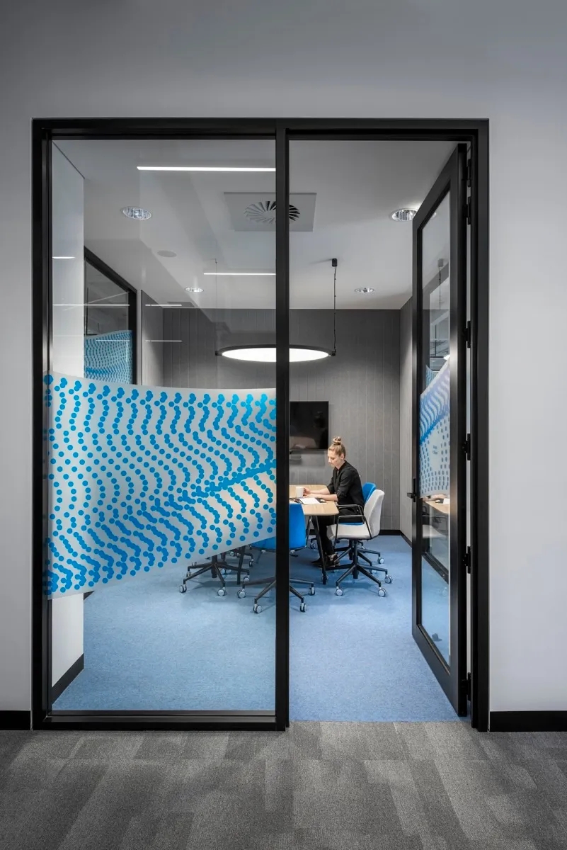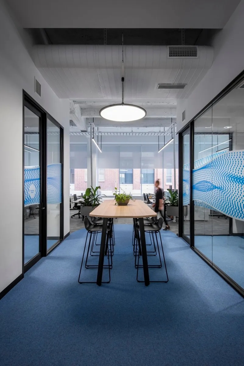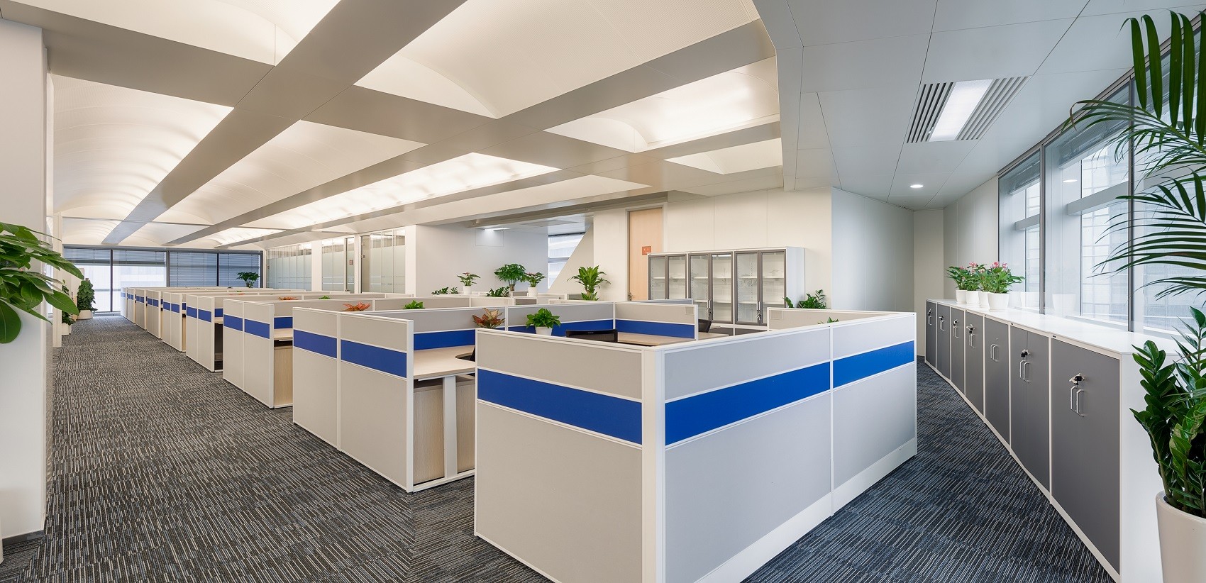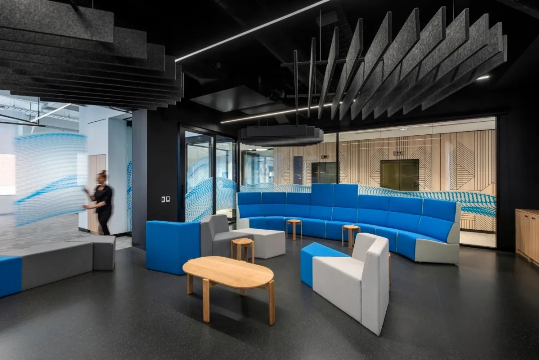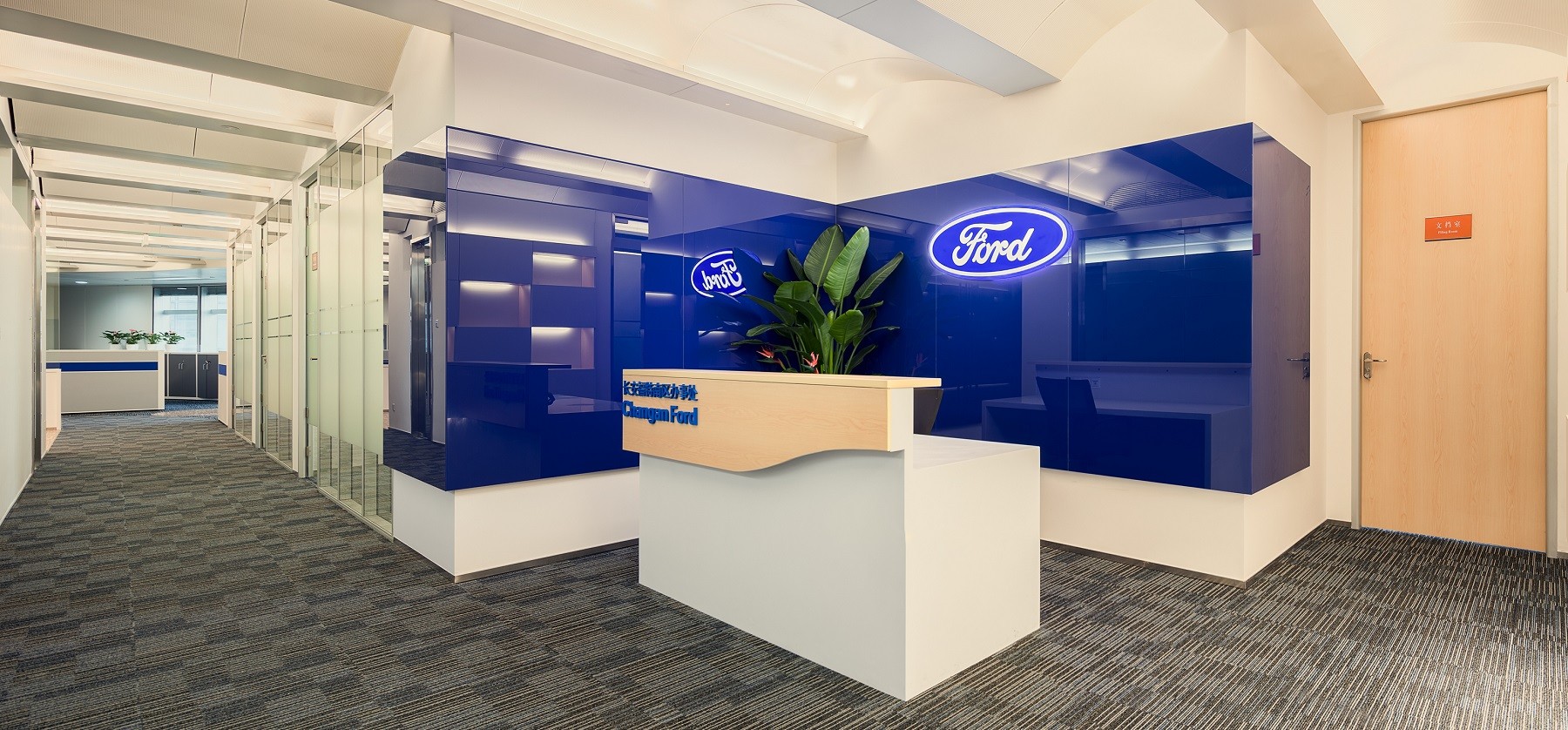 该项目整体空间采用简约、明快的设计风格,营造了平易近人的氛围,为日常办公和访问参观提供舒适的环境。设计以长安福特标志性的蓝色为点缀色,通过蓝色与白色组合出丰富的视觉层次,替身空间的活力值和明快度,创造出轻松的办公氛围,形成一个高效、明亮、整洁的办公室风格。