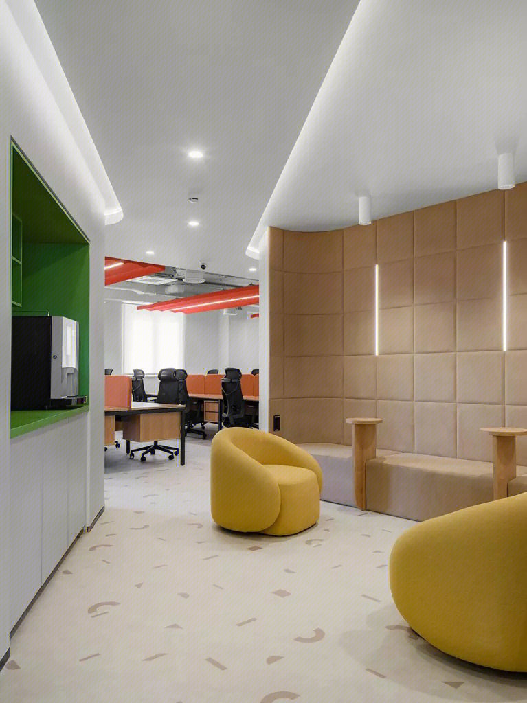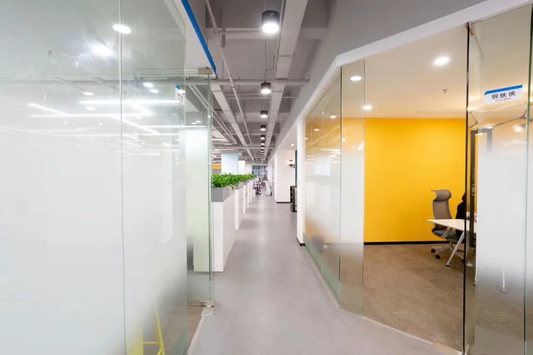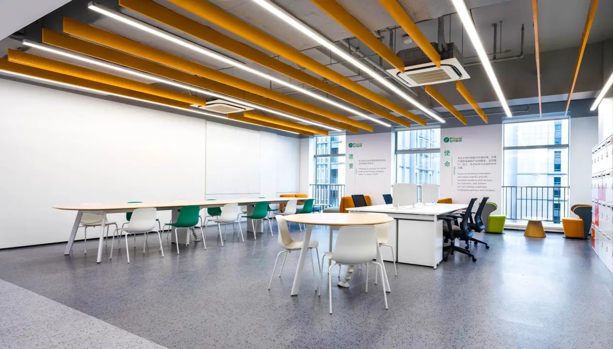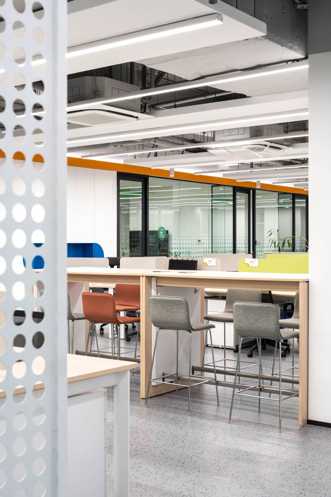 由于公司发展迅速,原来的空间已经太小。这项任务不仅是空间的扩展,还包括研究人与空间环境互动。设计师需要在尊重和反思擎朗的品牌形象的同时,与客户一起,创造一个开放和封闭的混合空间。开放性:没有独立的单人办公室,所有人员都在开场时办公区;独立性:会议室、咖啡吧、科技小院的洽谈区,设置各种空间以鼓励开会或者作为私人空间,让员工可以自由使用。