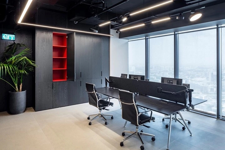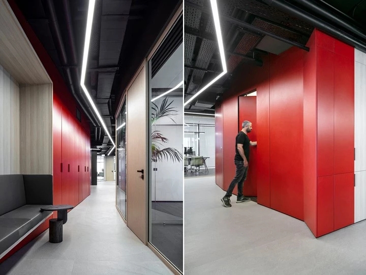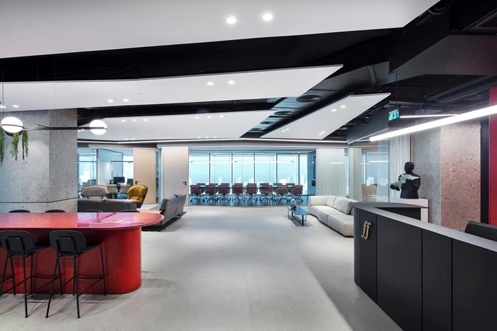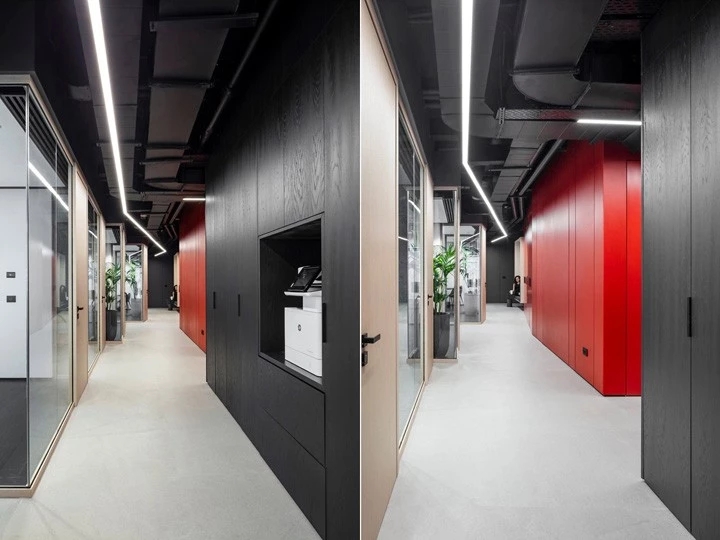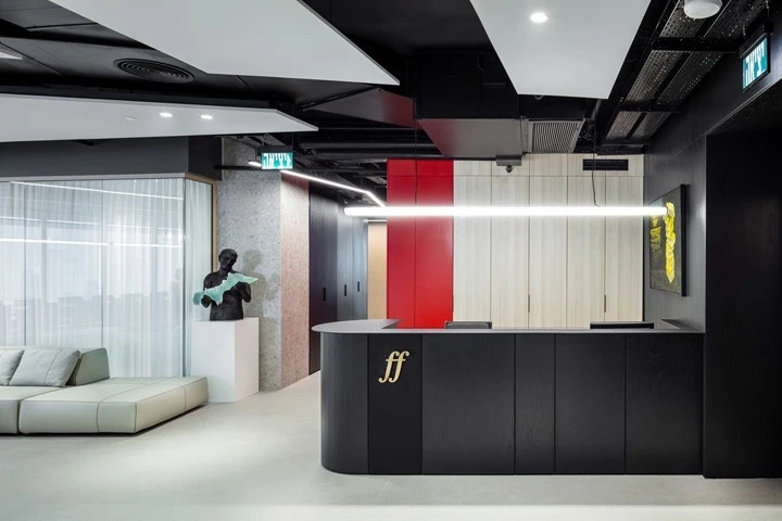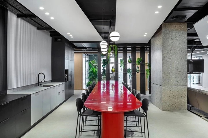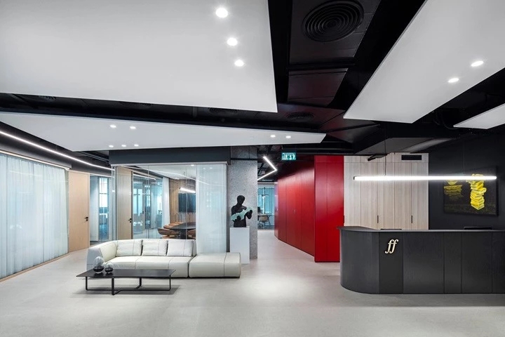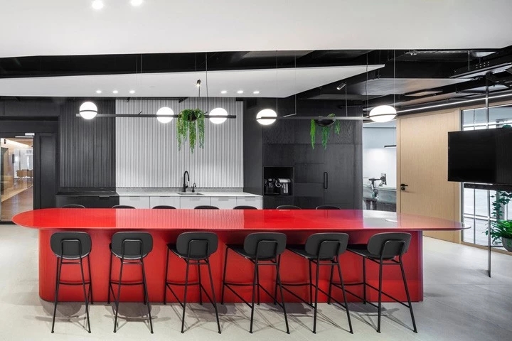 红与黑的碰撞企业精神激发了设计团队的灵感,去塑造一个优雅、古典,同时又兼具勇敢、现代和无畏的工作空间。空间中的所有元素都是专为本案而定制设计的。