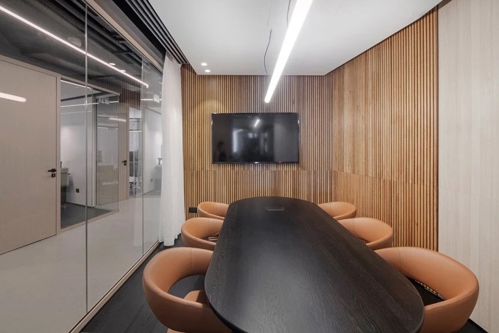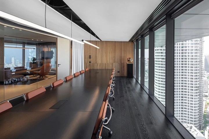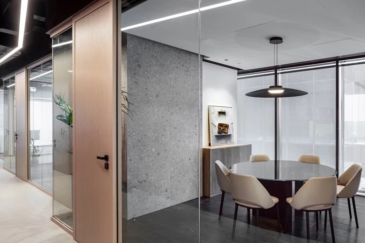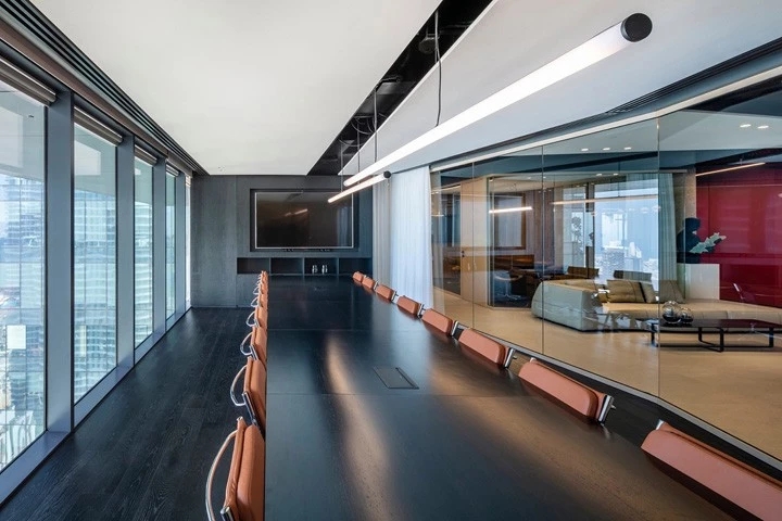 几何构造的玻璃隔断呼应着顶面造型,其材质来自于意大利;室内独特的木饰面从日本进口。蜿蜒崎岖的线形灯带系统随着整体空间布局的动线应运而生,带来独特的体验和动态导引。