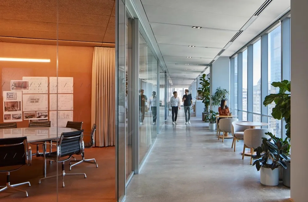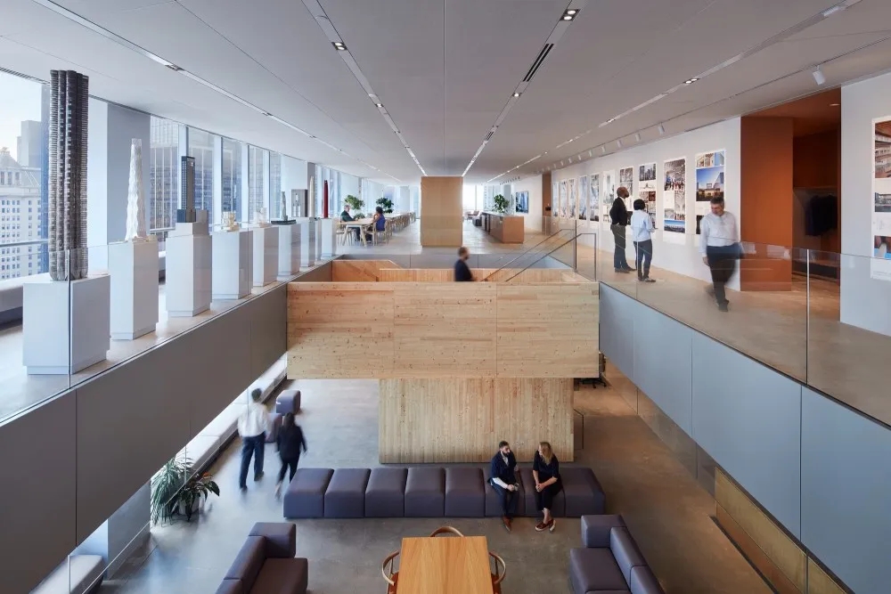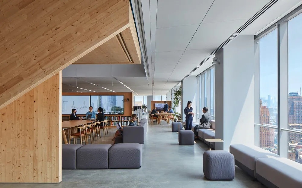 办公室以健康材料为特征的广阔、灵活的空间,负责任地使用资源,并注重可持续性和福祉。楼层之间的广泛开放将两个层统一起来,并为聚会和活动创造了一个多层论坛空间。楼梯连接两层楼,直接通向共用咖啡馆和冥想、祈祷和休息的设施。楼梯由交叉层压木材建造,是一种不排放碳的结构材料。入口和设施的开放性,工作领域是围绕合作区组织的。为了减少噪音,织物包裹的声学面板天花板在整个办公室吸收声音。该办公室的特点是天然材料和减少不必要的表面处理,在整个空间种植郁郁葱葱的植物,营造平静的氛围。