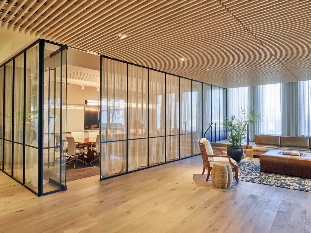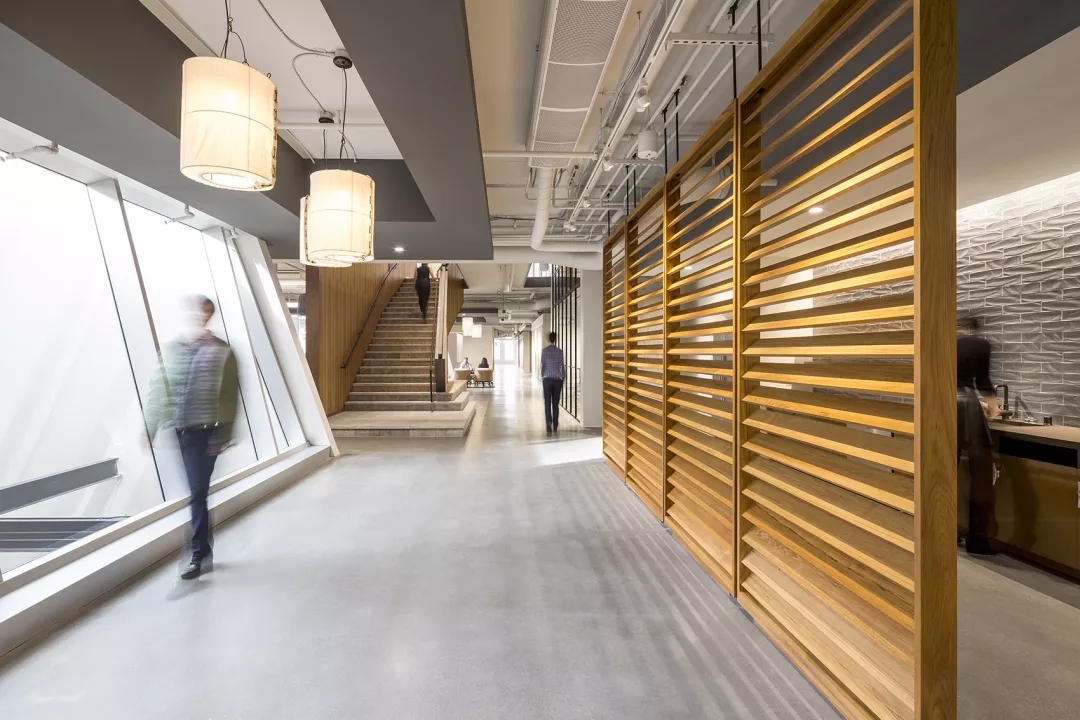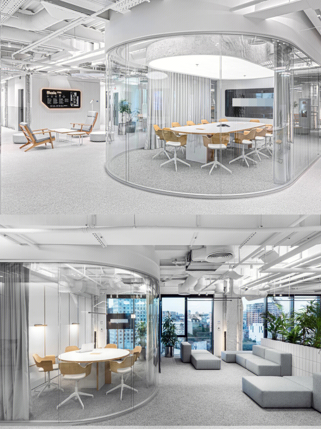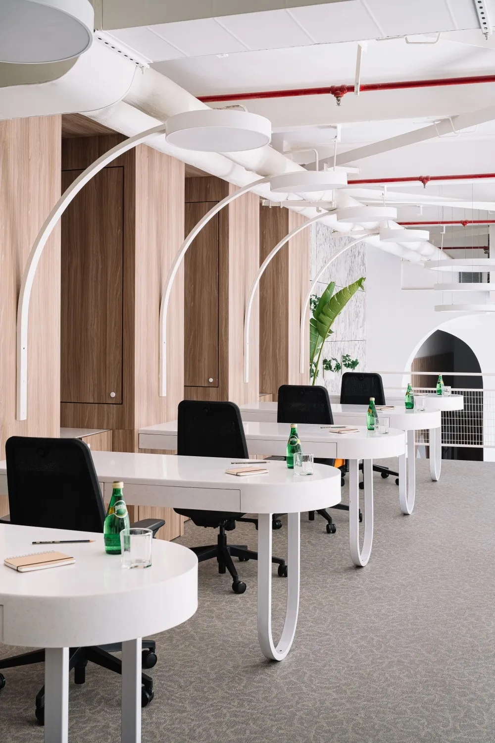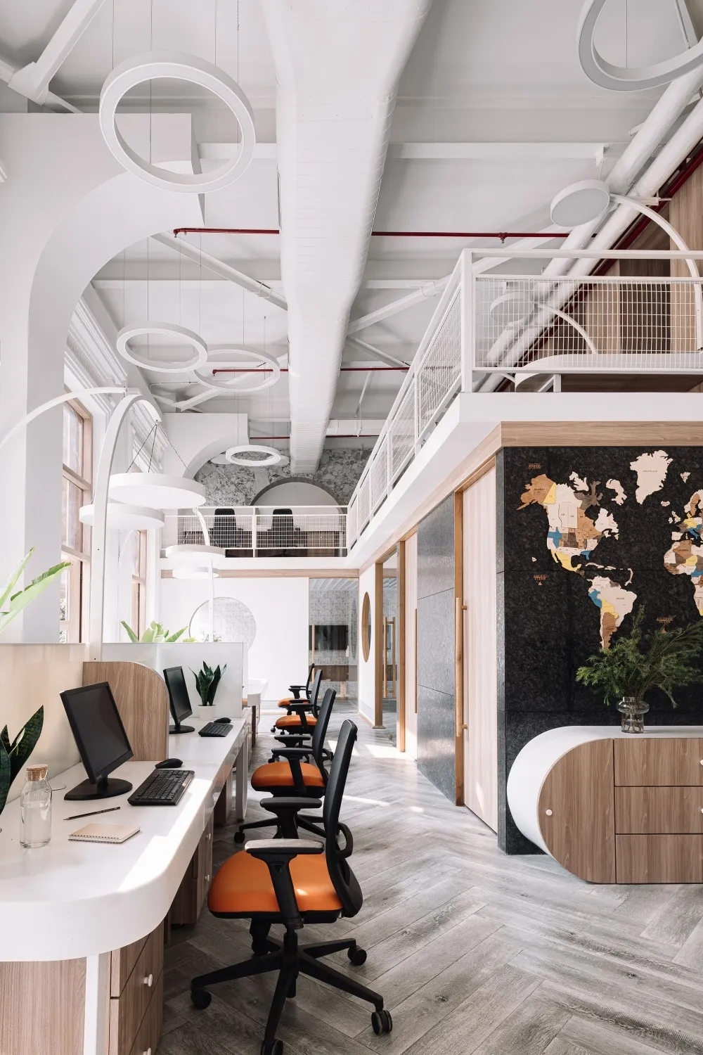 所有工作站都集成了半弧灯,增加了空间的特色主题和美观,并提供光线充足的工作站。办公室包括一个较低的楼层和夹层楼以及一个大露台。通过一个接待和等候区通向中央空间的工作站和经理隔间。所有工作站均俯瞰露台,享有胡格利河的广阔景致。在左边,夹层下,有助理的房间,还有一个储藏室和厕所。导演室位于远端,可通往露台。露台享有如画的风景和巨大的高度成为办公室的亮点,为举行非正式会议和在漫长的一天工作后放松身心提供了空间。
