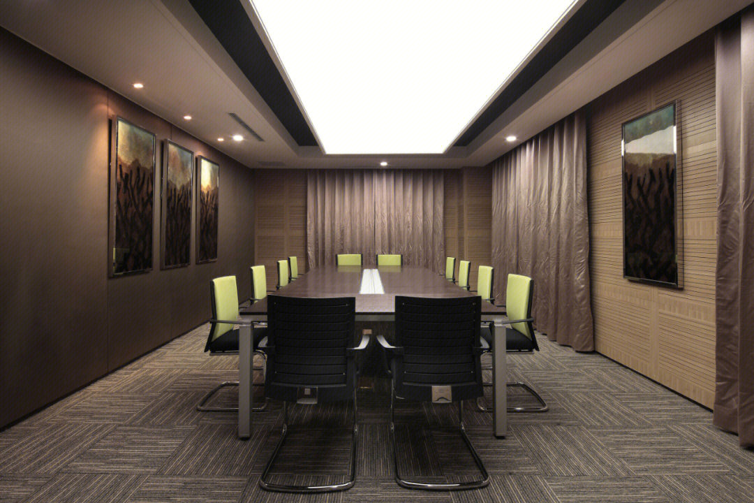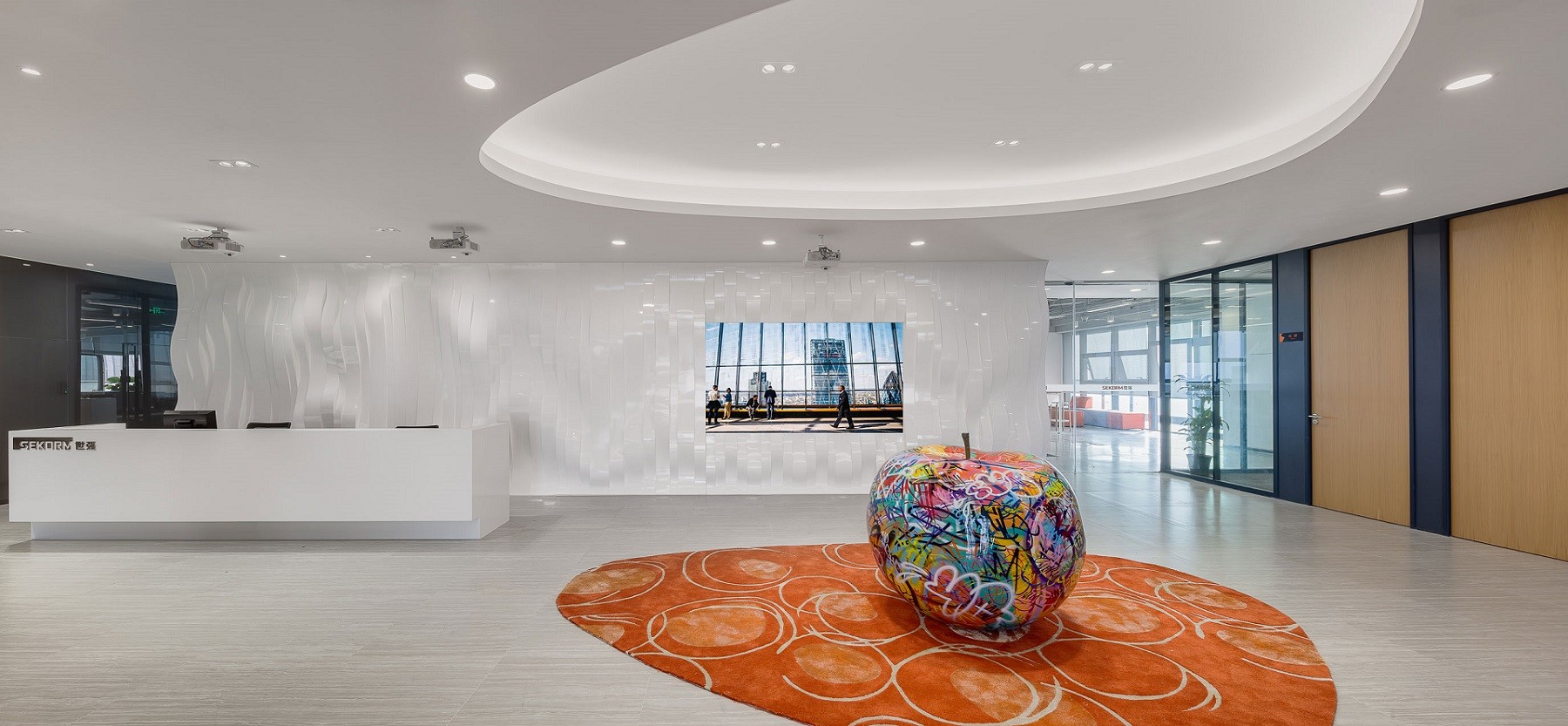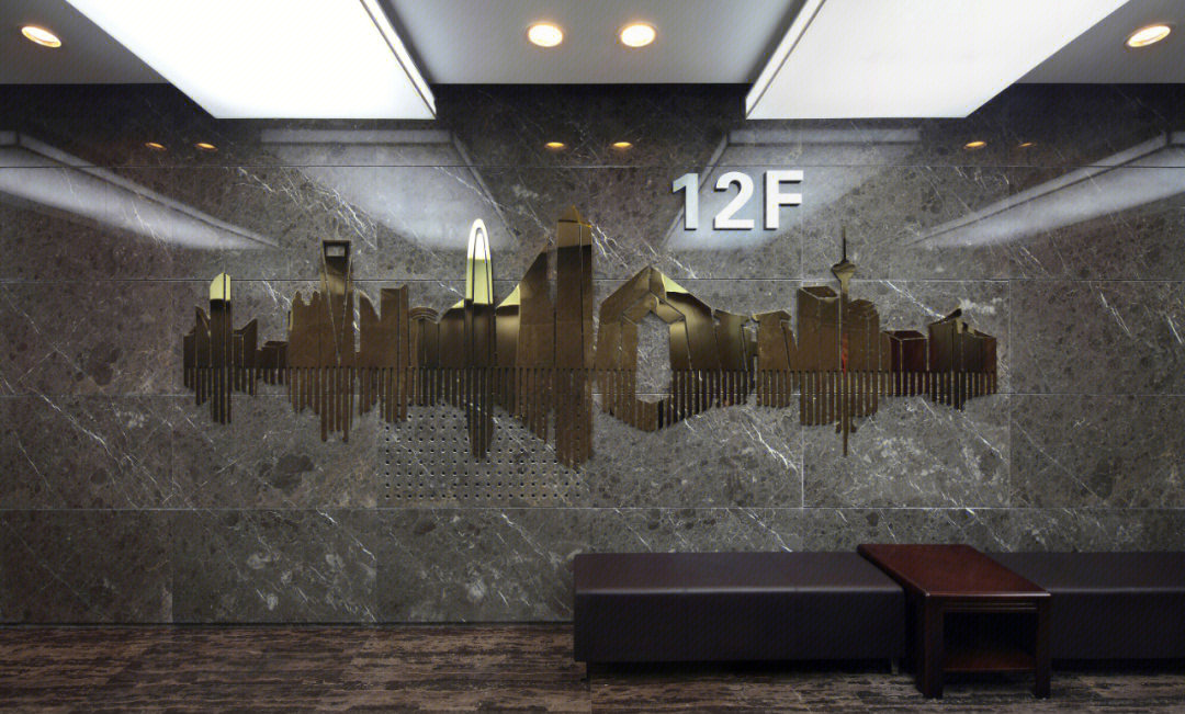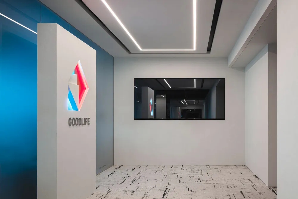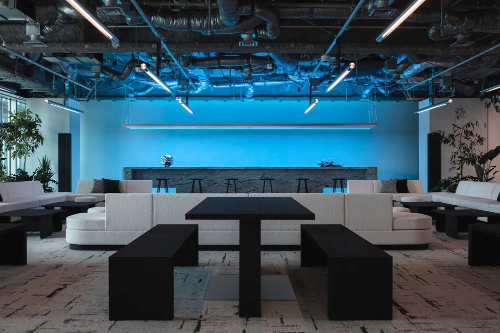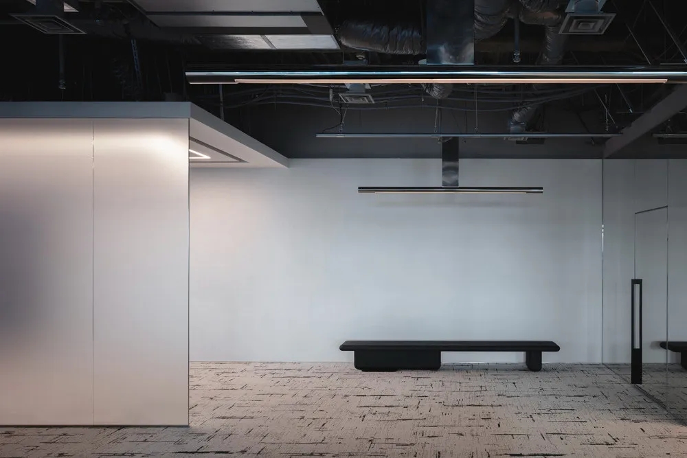 在入口处的办公室标志中,三种颜色的灯光使标志的形式脱颖而出,在公司内人们可以自由消遣在开放式的休息室里,原有的家具和吊灯布置得井井有条,与地板的图案相得益彰。这些单色线条通过镜子的放大,营造出强烈、流畅的视角和积极而快速的空间。以大胆的造型设计和强有力的表现力使标志的三种颜色的光线垂直射出,每一种光在空间中传播,同时相互影响。被彩色光影笼罩的视觉体验将给每个到访的人留下新鲜的回忆。以一种全新风格进行办公室设计,由光与材料之间的关系所创造出前所未有的新商业理念的空间。