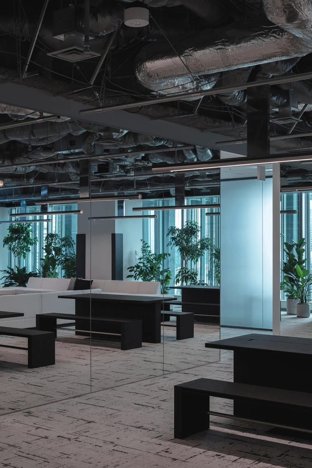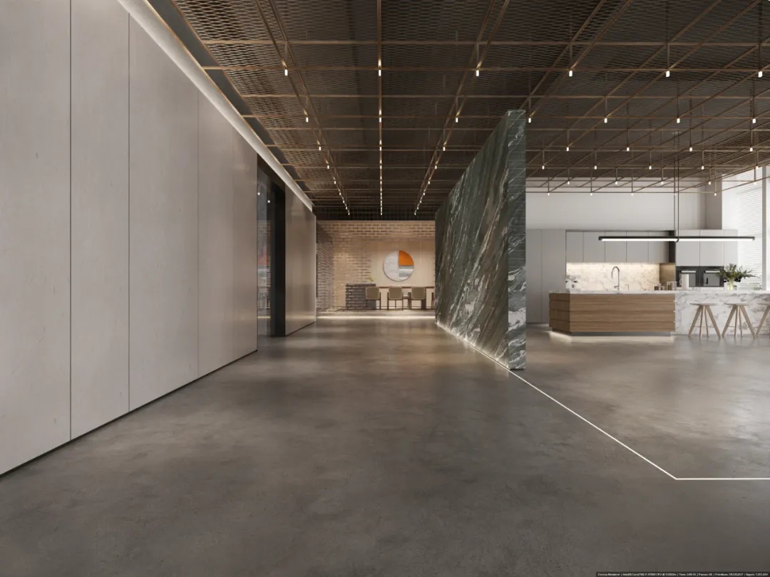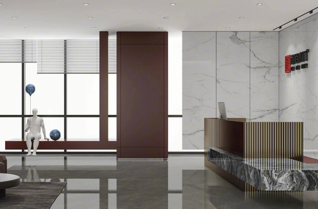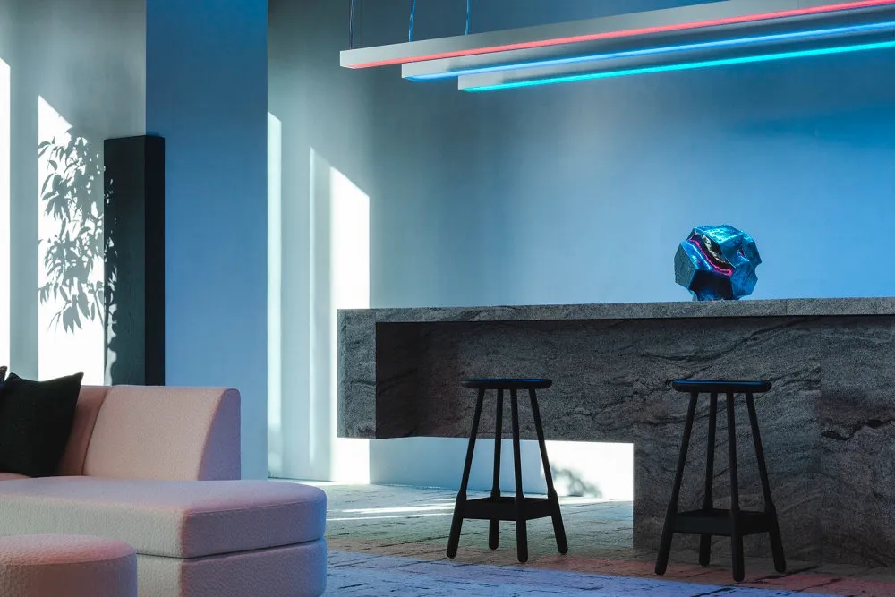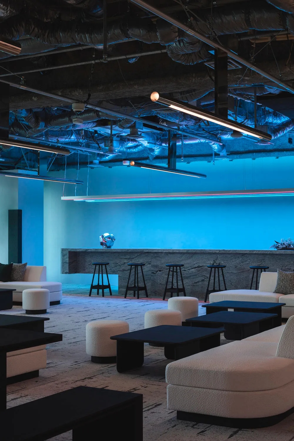 在入口处的办公室标志中,三种颜色的灯光使标志的形式脱颖而出,在公司内人们可以自由消遣在开放式的休息室里,原有的家具和吊灯布置得井井有条,与地板的图案相得益彰。这些单色线条通过镜子的放大,营造出强烈、流畅的视角和积极而快速的空间。以大胆的造型设计和强有力的表现力使标志的三种颜色的光线垂直射出,每一种光在空间中传播,同时相互影响。被彩色光影笼罩的视觉体验将给每个到访的人留下新鲜的回忆。以一种全新风格进行办公室设计,由光与材料之间的关系所创造出前所未有的新商业理念的空间。