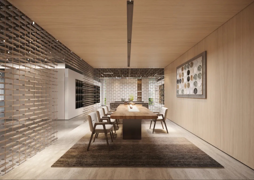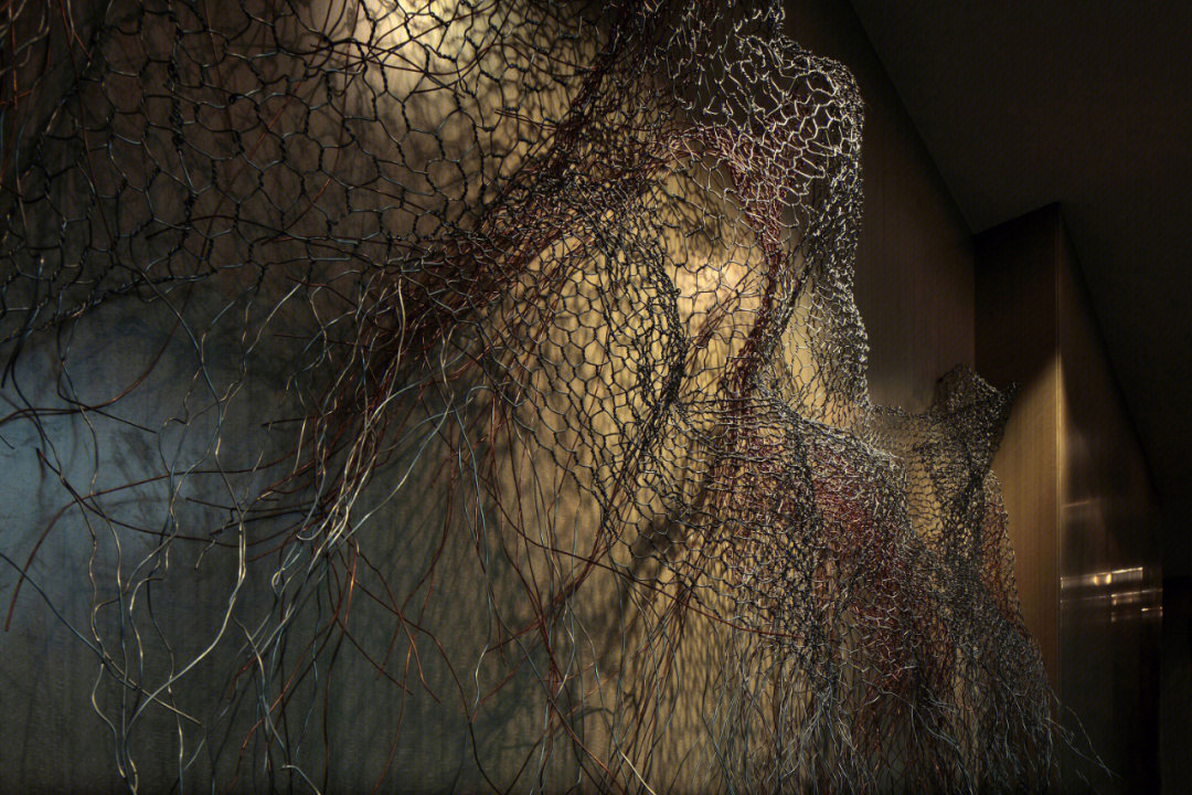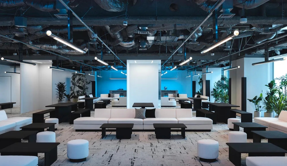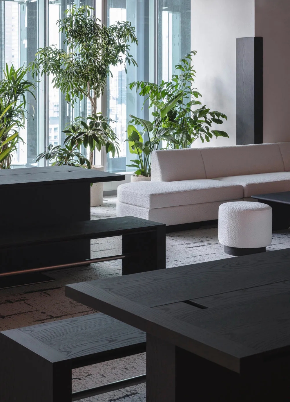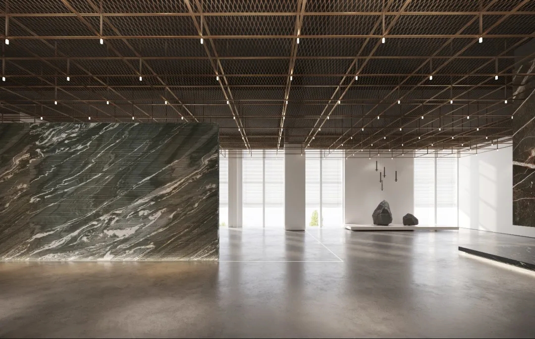 在入口处的办公室标志中,三种颜色的灯光使标志的形式脱颖而出,在公司内人们可以自由消遣在开放式的休息室里,原有的家具和吊灯布置得井井有条,与地板的图案相得益彰。这些单色线条通过镜子的放大,营造出强烈、流畅的视角和积极而快速的空间。以大胆的造型设计和强有力的表现力使标志的三种颜色的光线垂直射出,每一种光在空间中传播,同时相互影响。被彩色光影笼罩的视觉体验将给每个到访的人留下新鲜的回忆。以一种全新风格进行办公室设计,由光与材料之间的关系所创造出前所未有的新商业理念的空间。