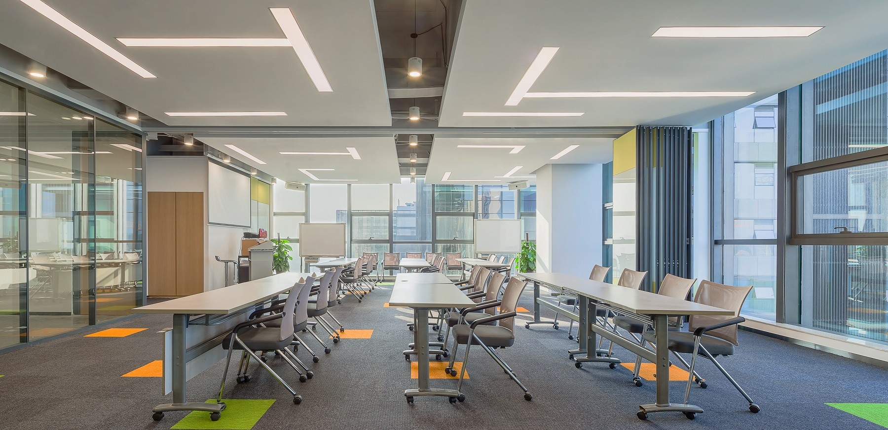 将海浪元素进行抽象化地运用表达在墙面上,以线成面,一张3D背景墙迅速抓住每一位访问者的眼球,不用的角度折射出不同的形状,十分立体化也增强了时尚感,丰富了整个办公空间的艺术观感。其象征的也正是每一个小小的电子成就硬件创新生态的理念。办公家具的设置方便灵活,让空间适应每个人或每个团队的需求。通过全面使用人体工学家具、最大化自然视野和采光,打造迷你健身放松空间,办公空间致力于对员工的精神状态产生积极正面的影响,为企业的长期发展提供支持。