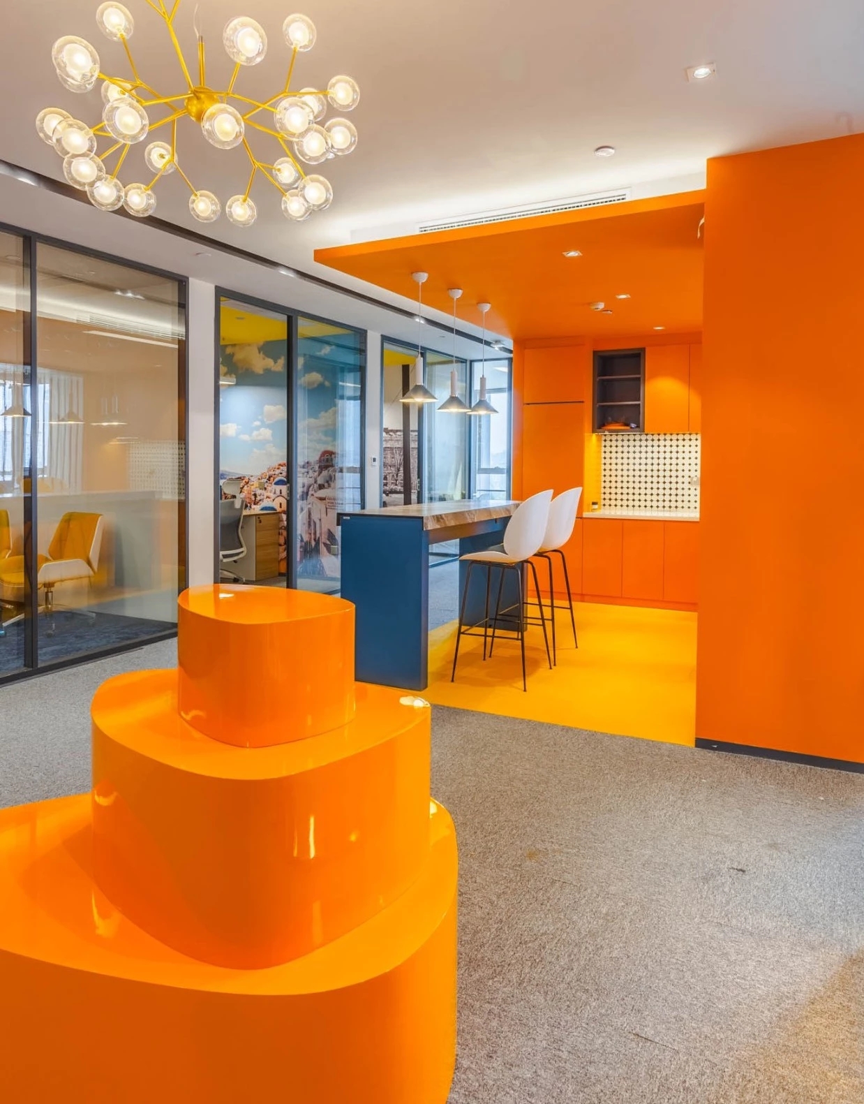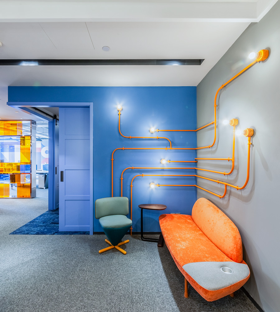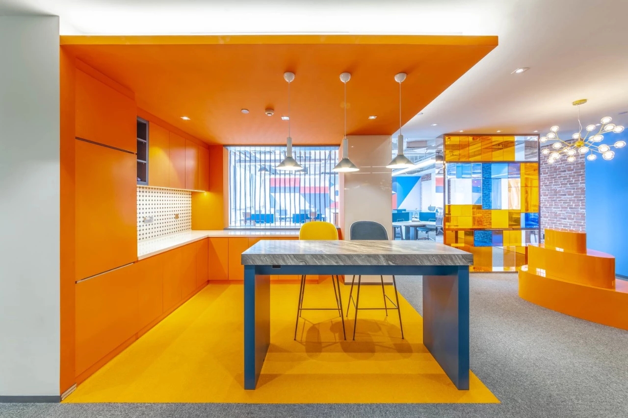 设计出了一个视觉冲击力与综合功能的办公空间来诠释COLOR THE WORLD,COLOR ME ROAD,蓝色与橙色的互补通过体量元素的大胆发挥得到了巩固,最终形成了一种强烈的、感性的空间体验和贯穿始终的语言。