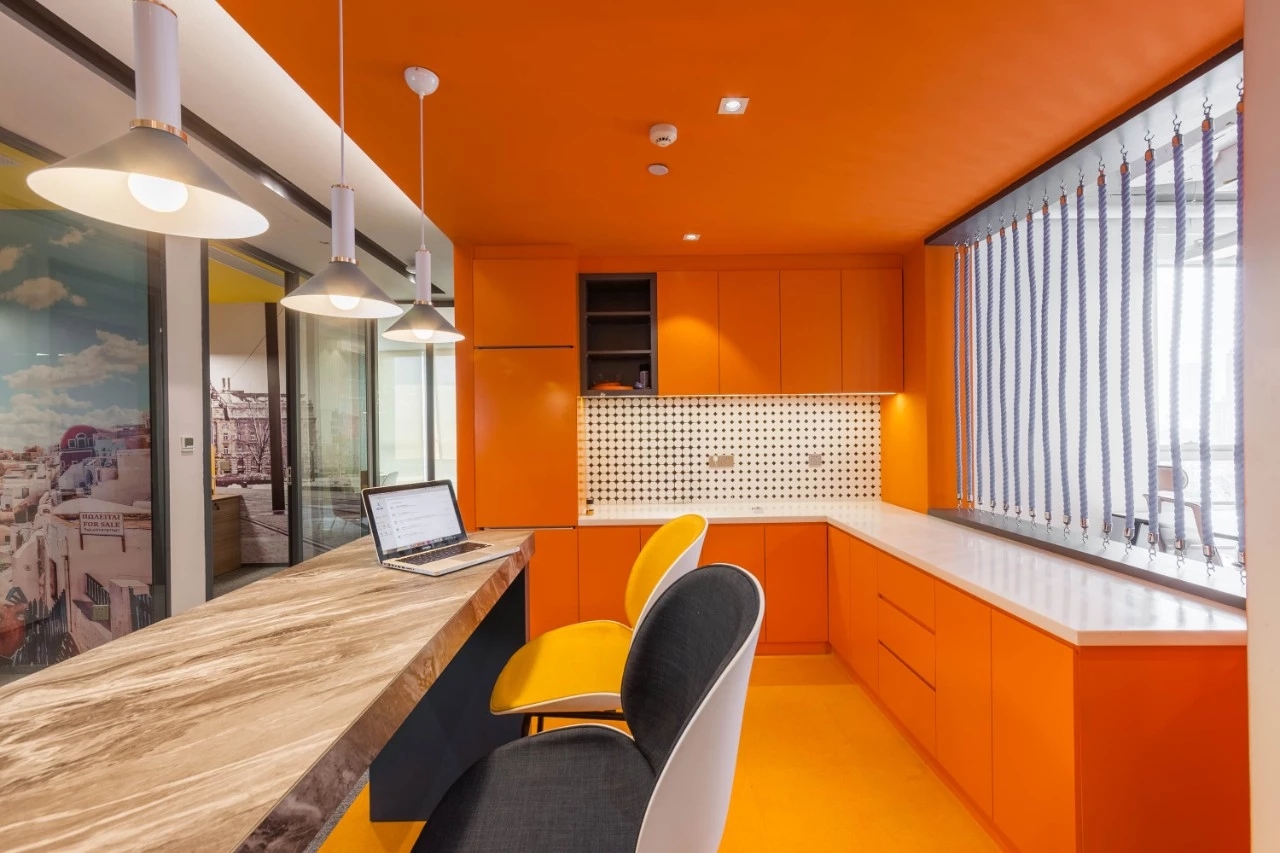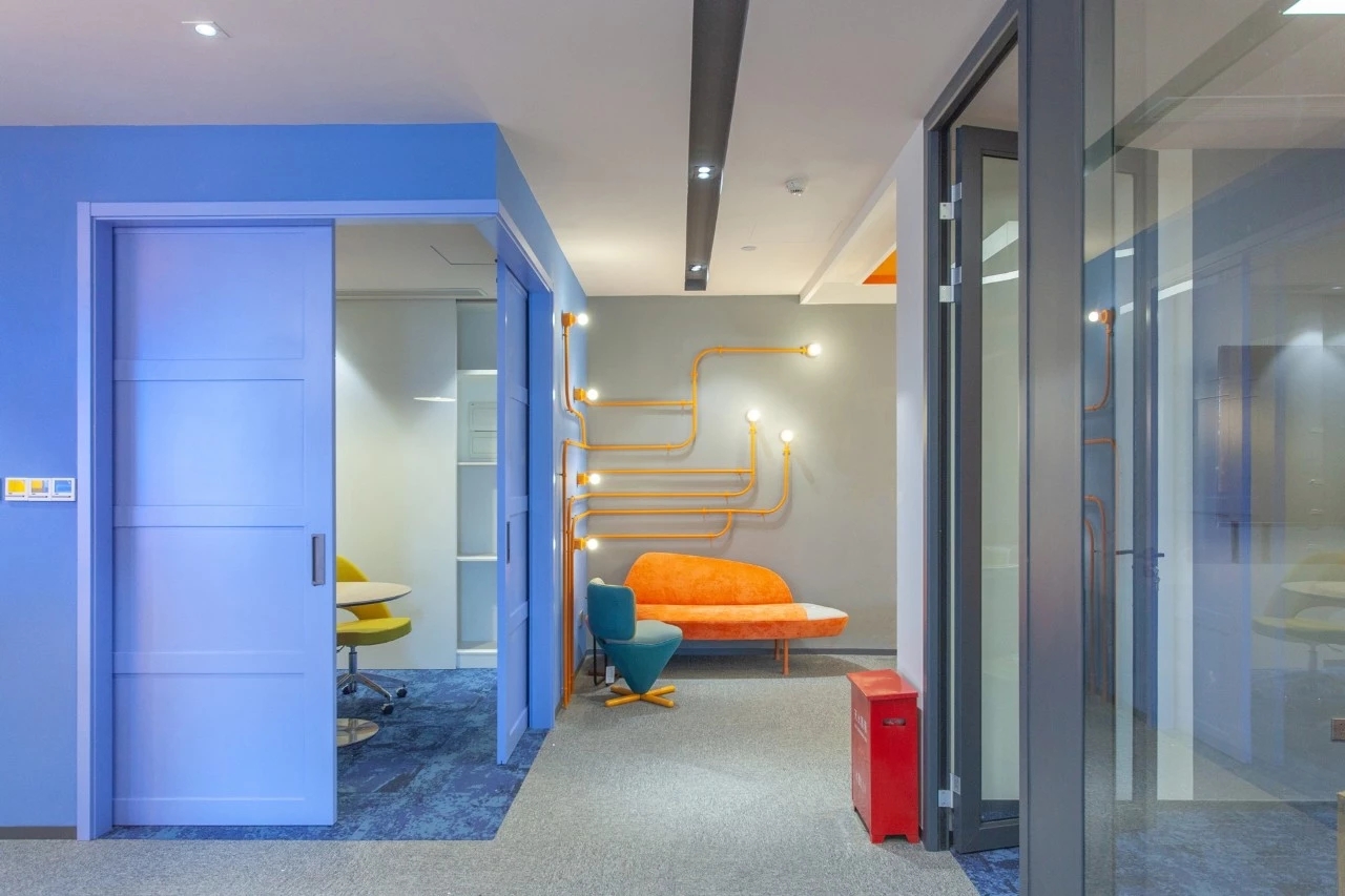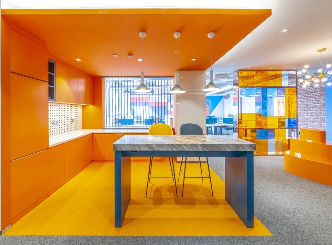 设计出了一个视觉冲击力与综合功能的办公空间来诠释COLOR THE WORLD,COLOR ME ROAD,蓝色与橙色的互补通过体量元素的大胆发挥得到了巩固,最终形成了一种强烈的、感性的空间体验和贯穿始终的语言。
