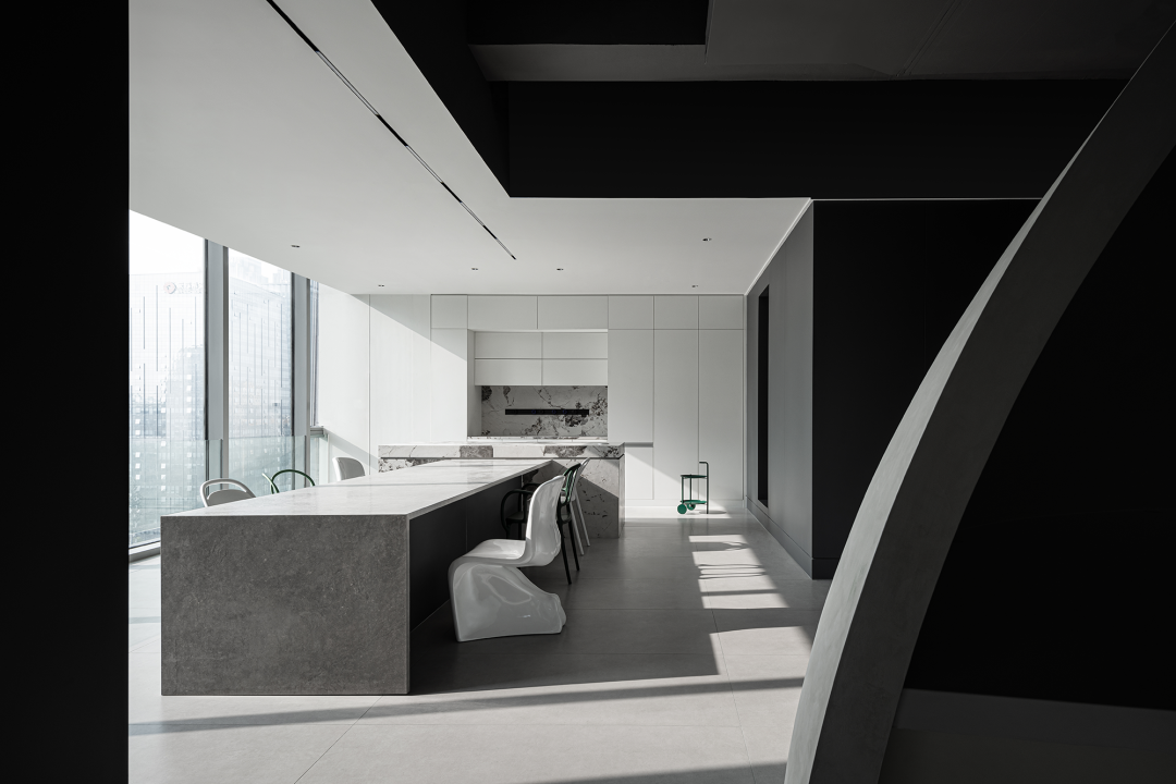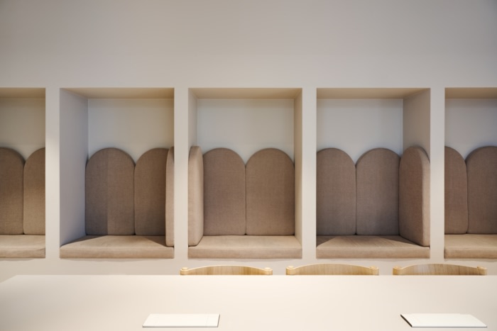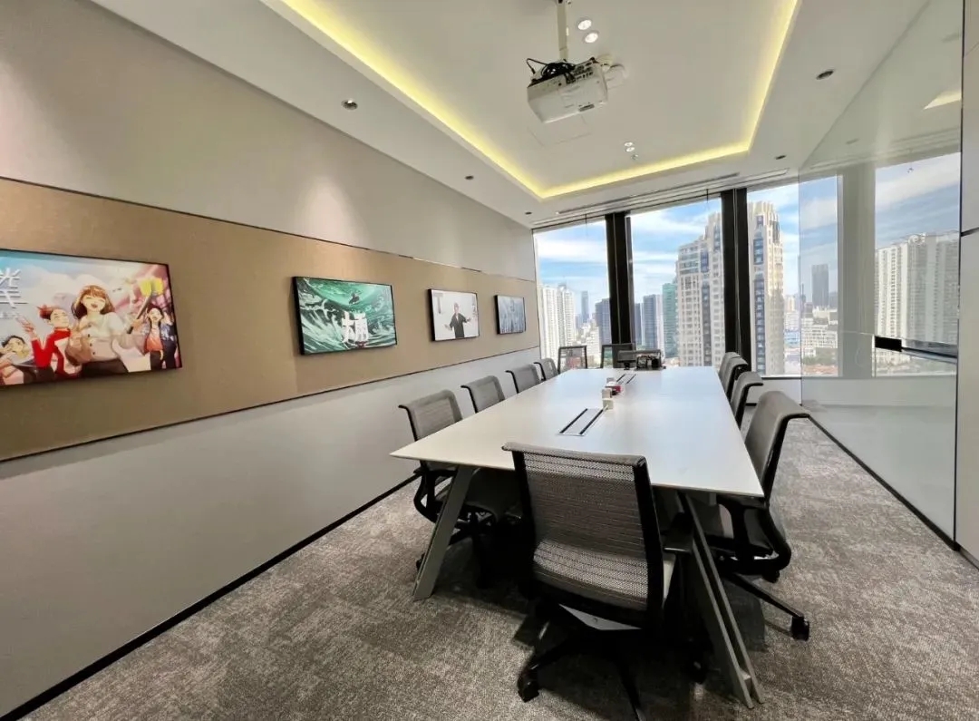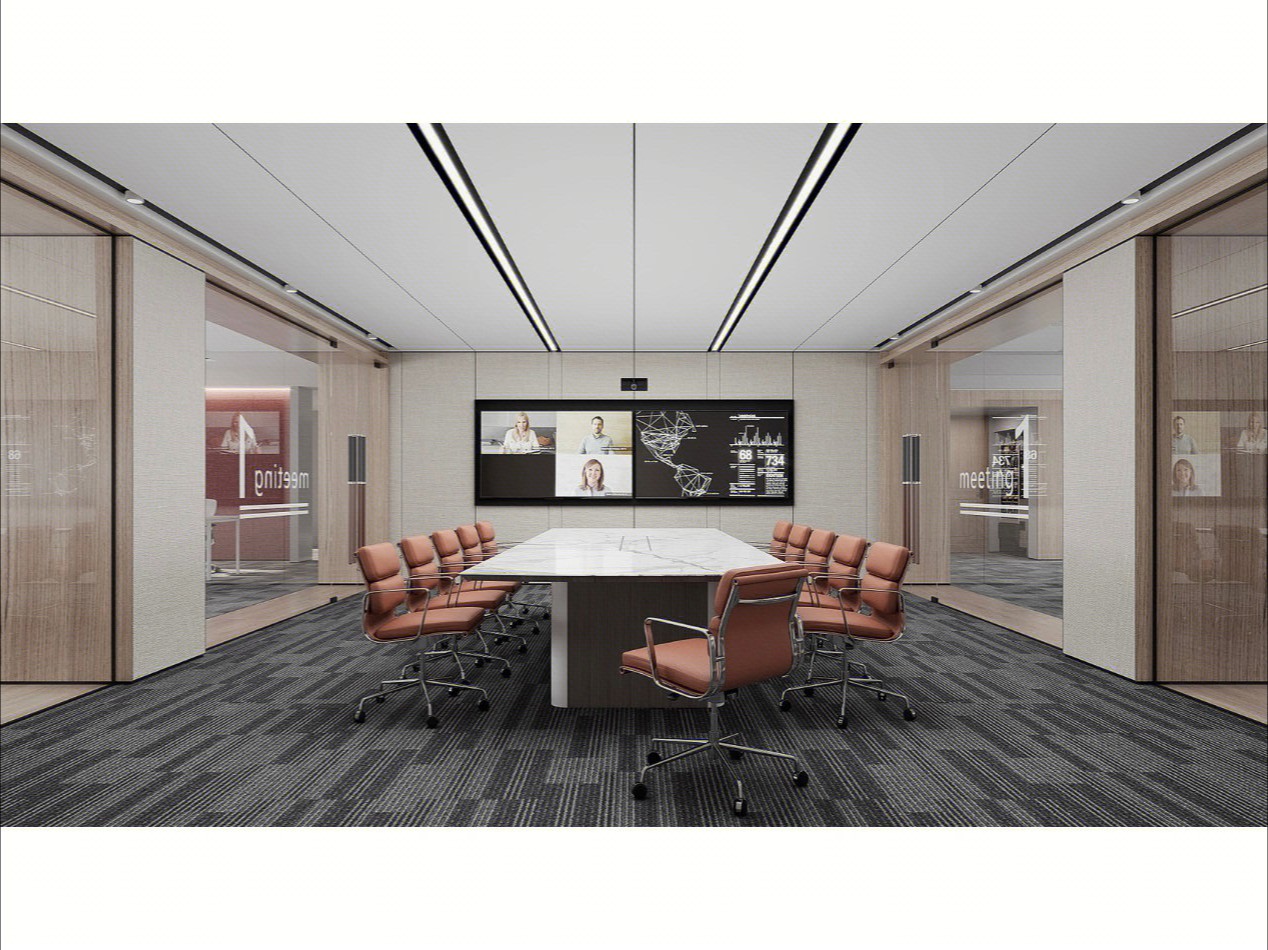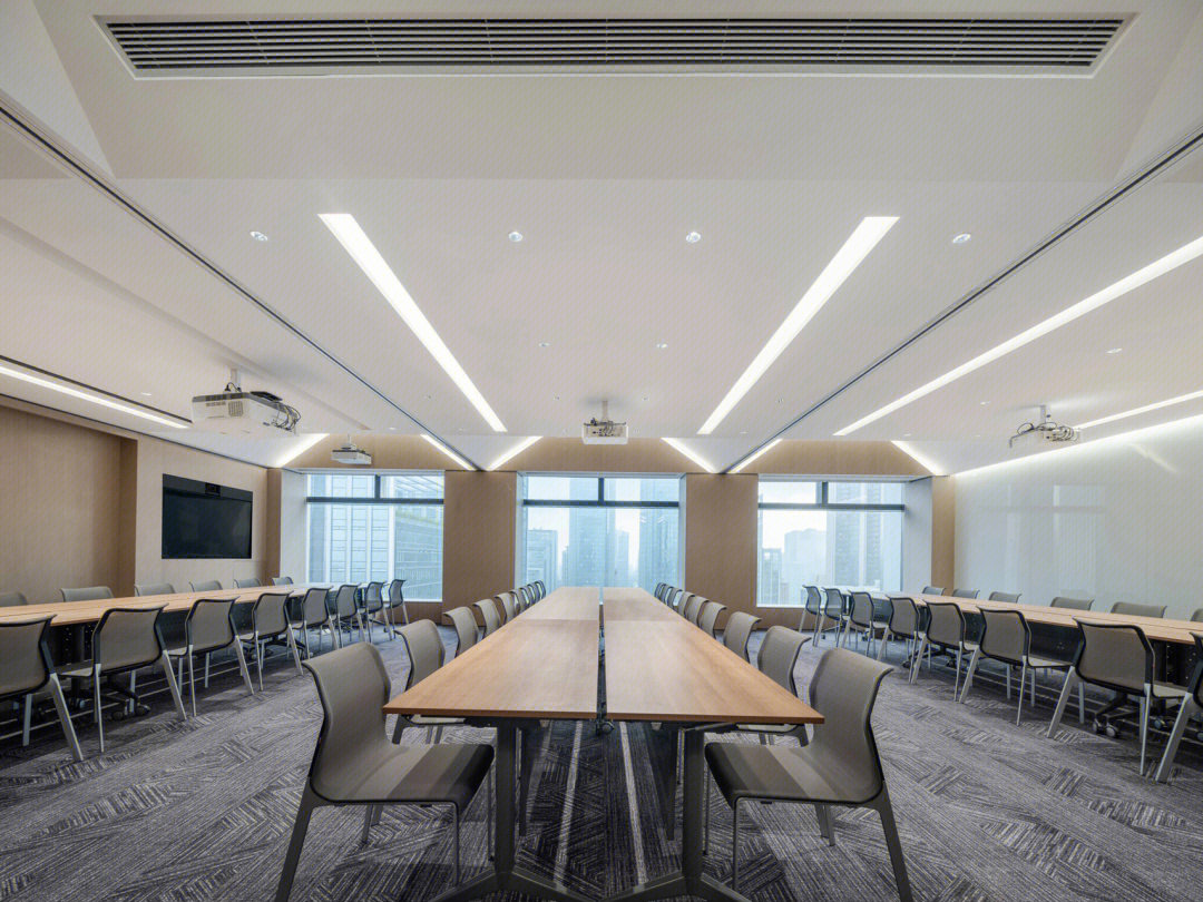 会议室灰色地毯的线条和浅灰墙面的色调相接,形成空间维度上的一致性和连续感。天花板顶灯造型对照了会议桌的形状,形成了视觉维和,让空间更加契合相融。