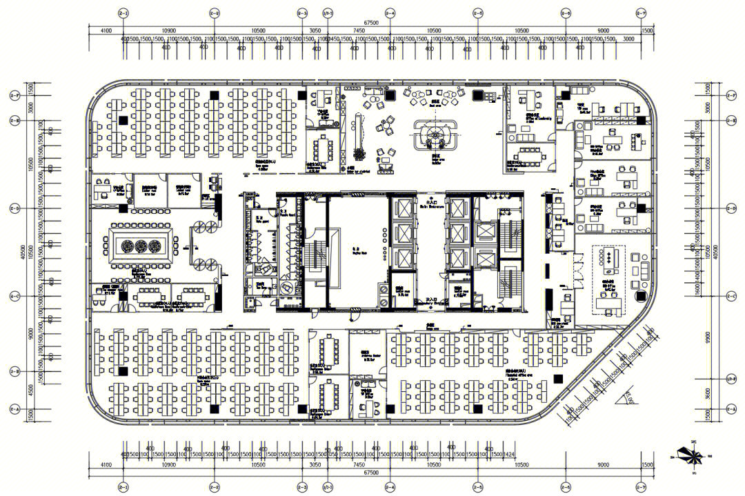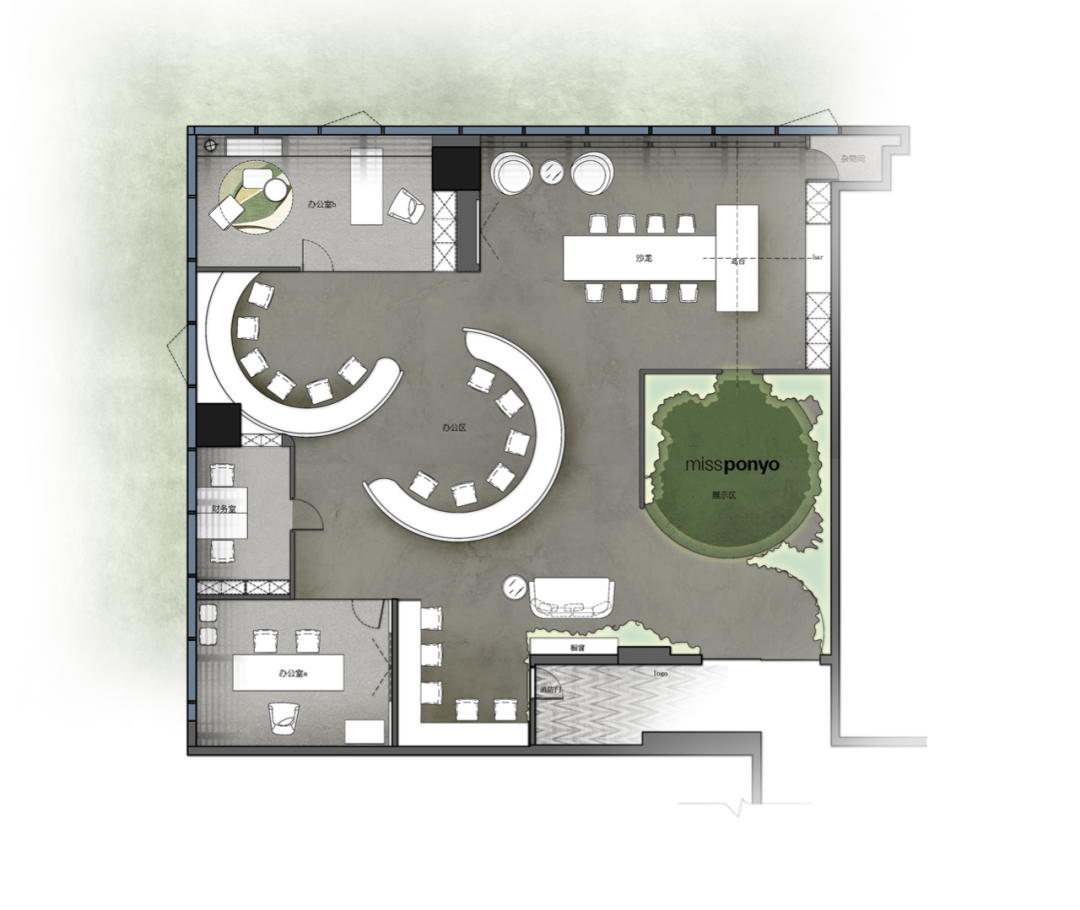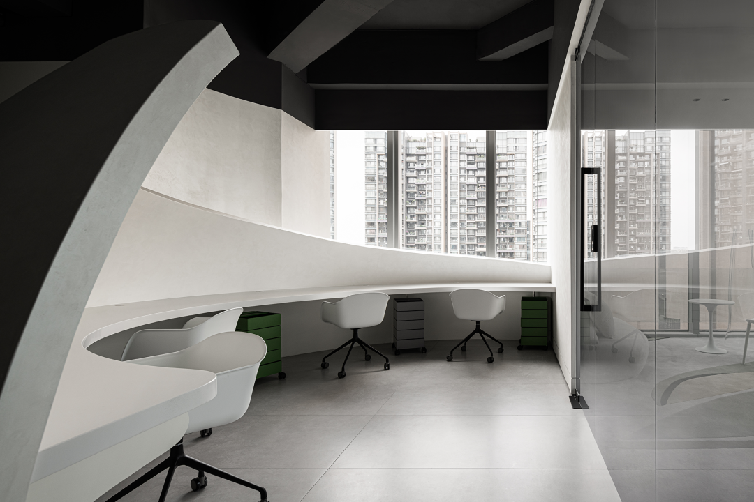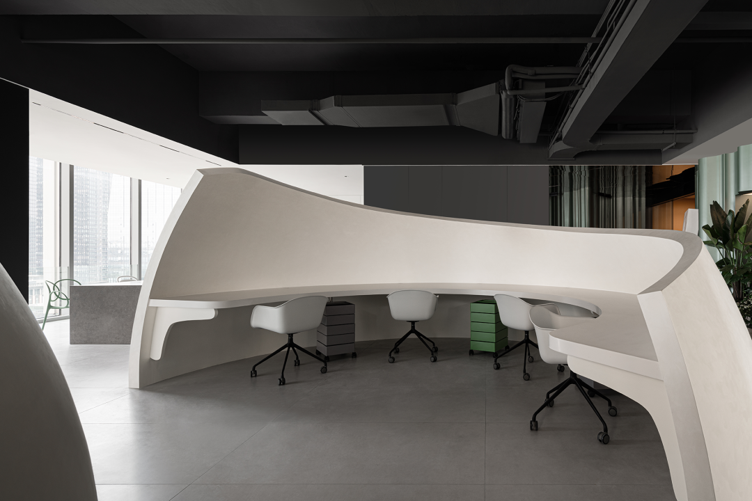 从上方俯瞰,可以看到开放办公区是由两个“C”字形拼成“S”形艺术造型,象征着人体的曲线之美,呼应公司主营时装内衣与居家服的主题。