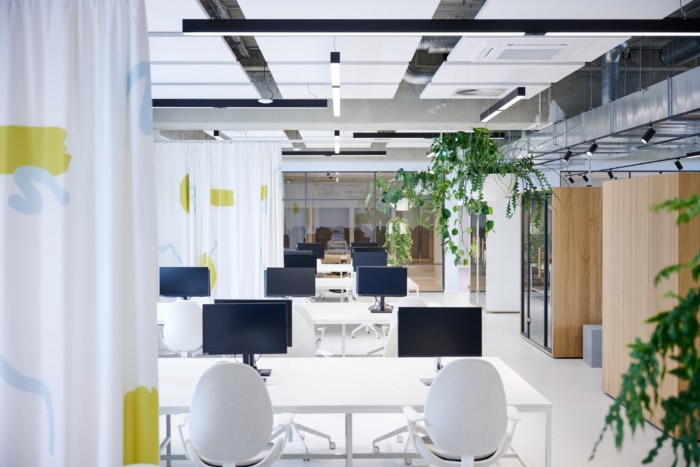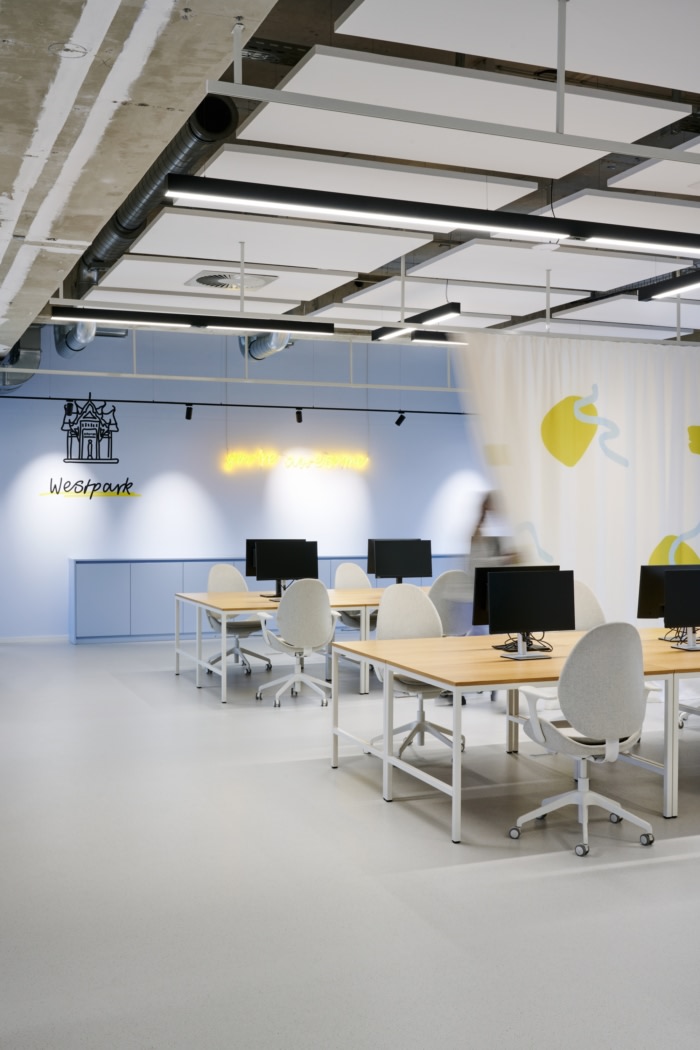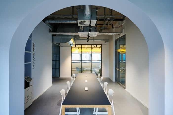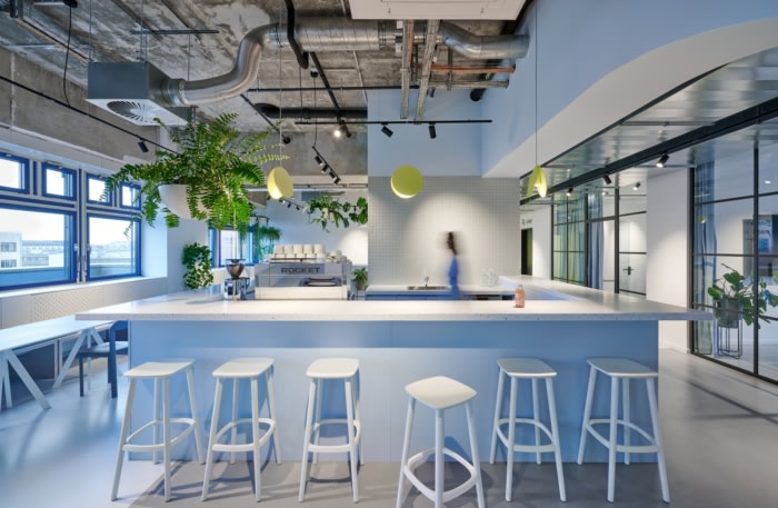 新的工作区与拥有自己的咖啡师的大堂相连。因此,每个部门的空间布局都是相同的。所有蓝色区域都位于开放和交流区域,而浅灰色区域是更安静的工作环境。入口区域的有趣元素使整体概念更加完美。除其他外,还安装了乒乓球、秋千或高杆等霓虹黄色动作设备,让员工有机会在工作之间积极休息。