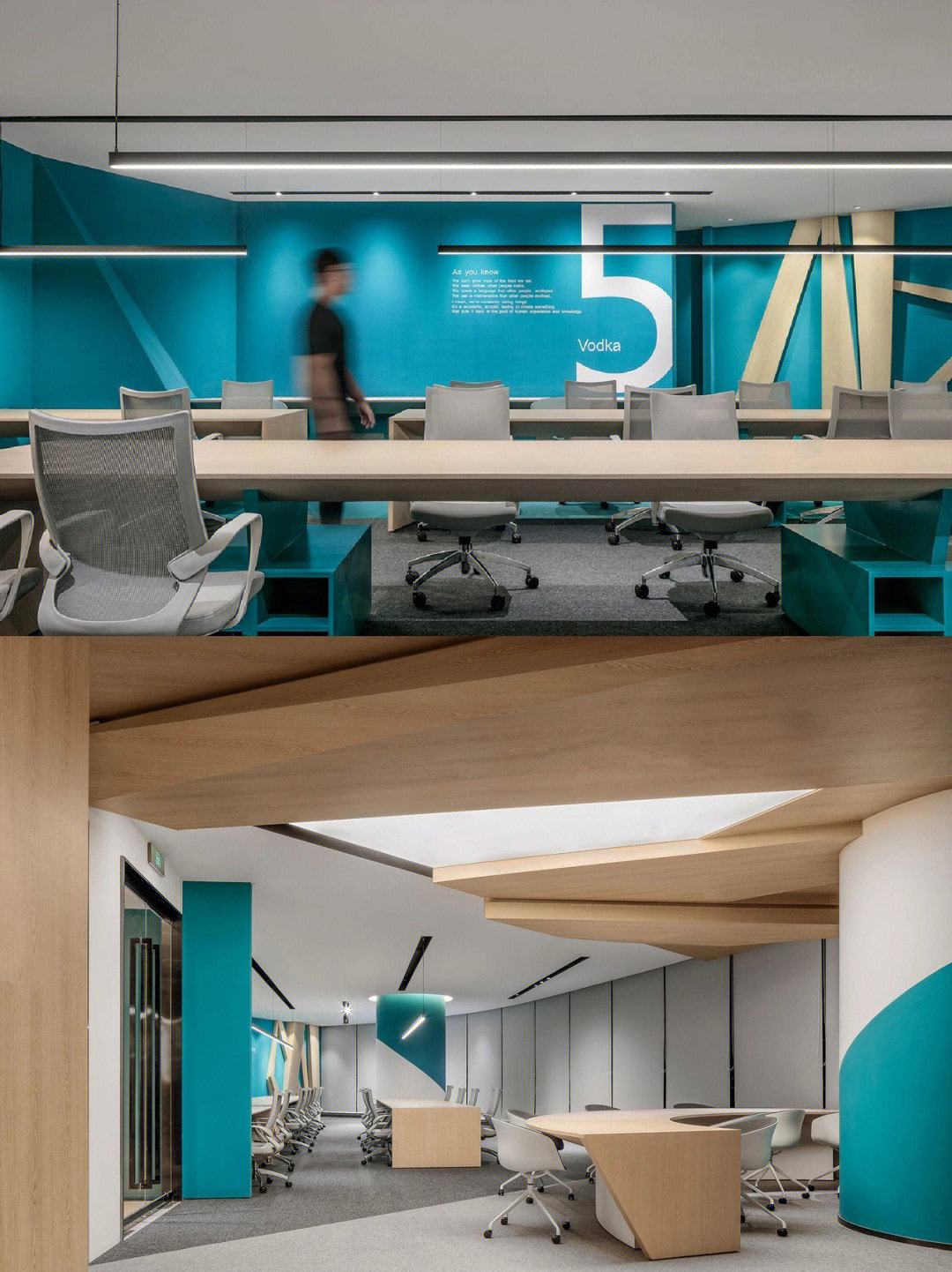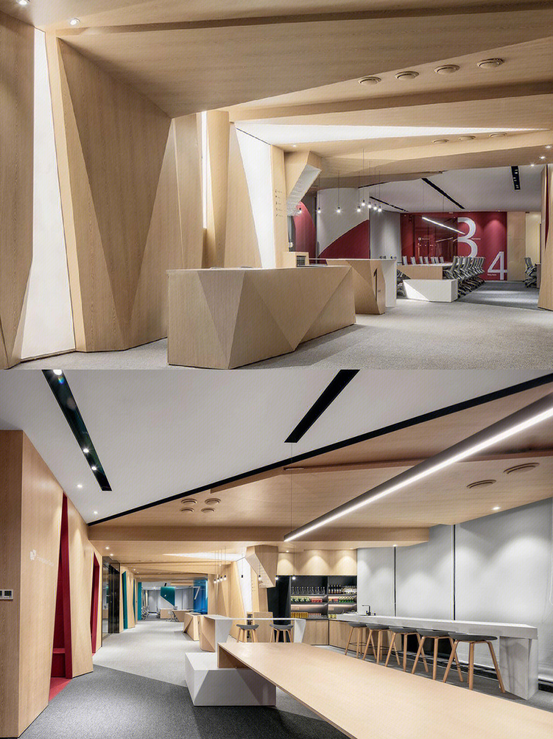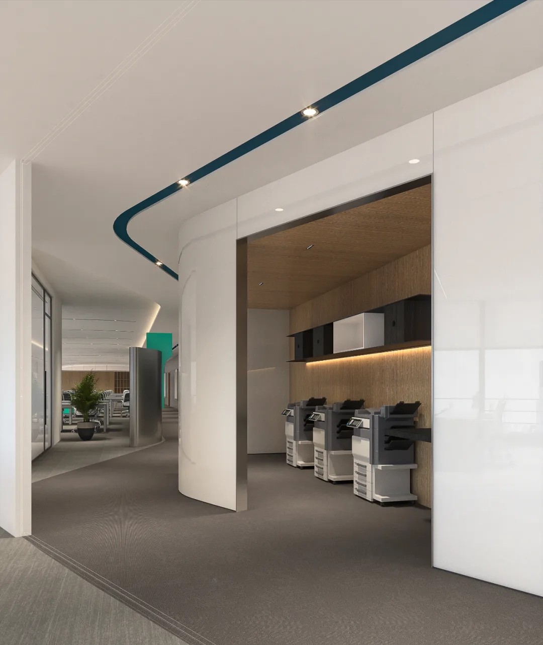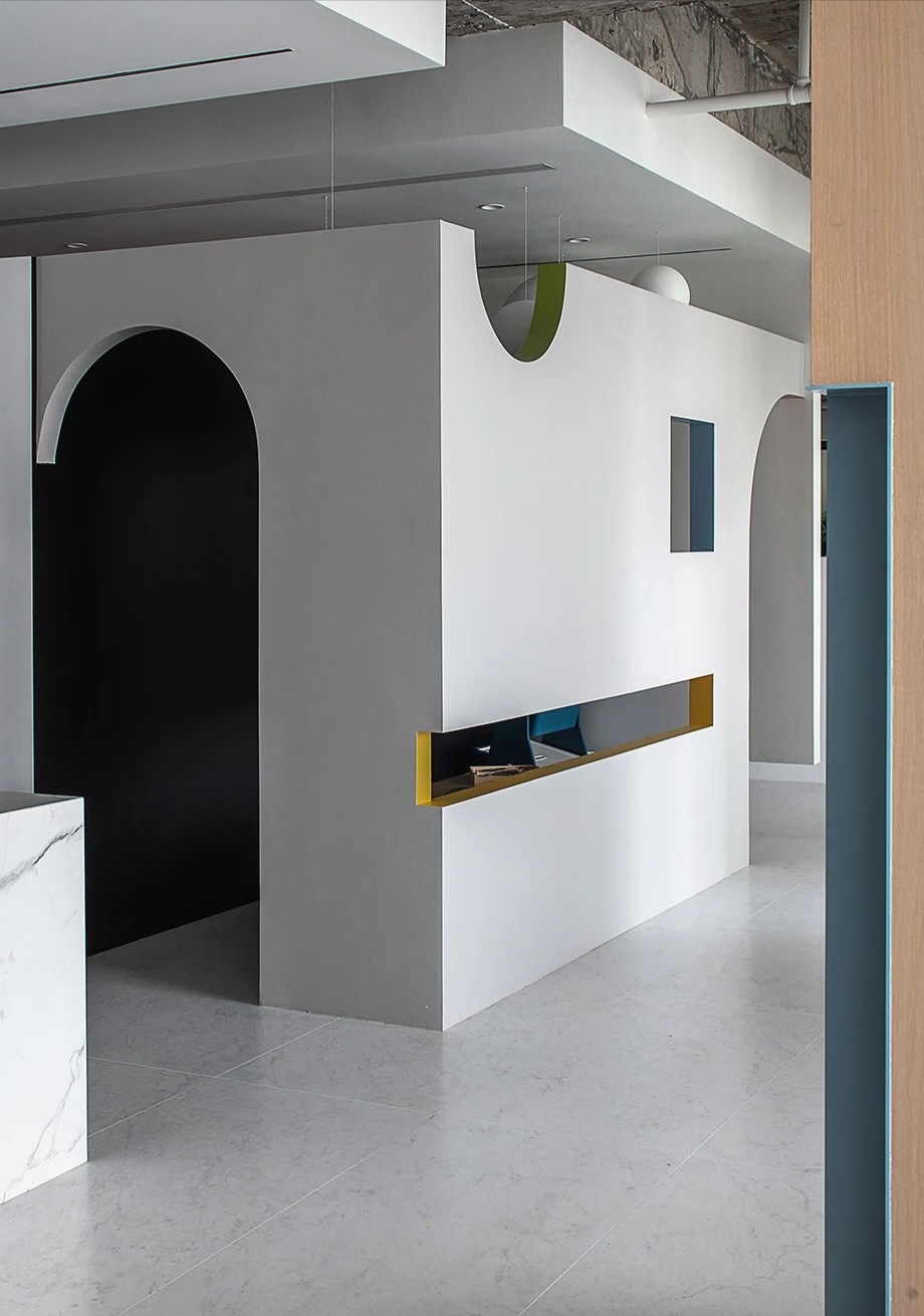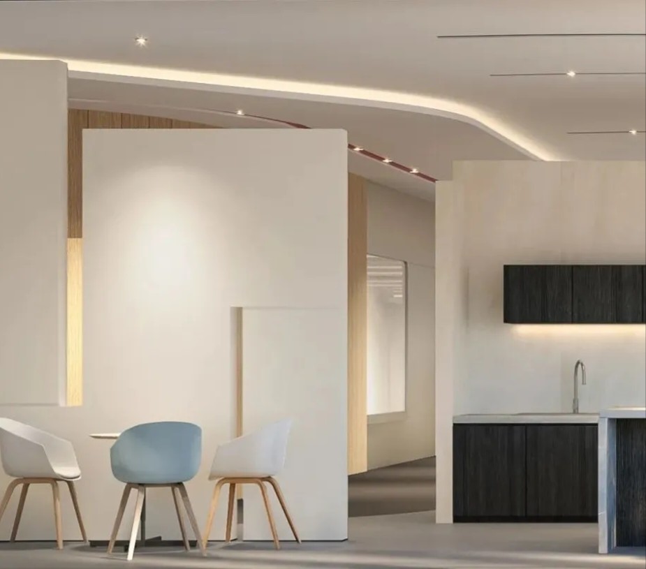 基于开放、活跃、多元化和健康思维的场景和功能布置的设计是目前被国际视为最佳的设计趋势。林氏木业作为创新型、创意型企业,在设计上要求更为开放。弧形天花、特色造型吊灯与自然治愈的浅蓝色,让空间呈现轻松休闲的氛围,为员工提供物质层面和心理层面的满足。工作间隙在此缓解视觉疲劳,进行个人社交,在切换情景中寻找新的灵感。