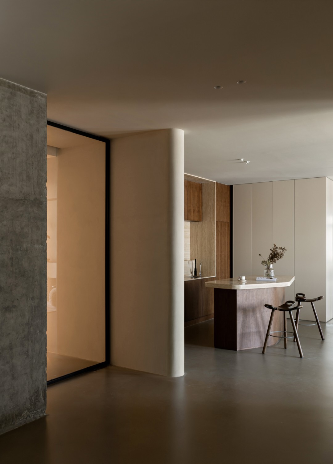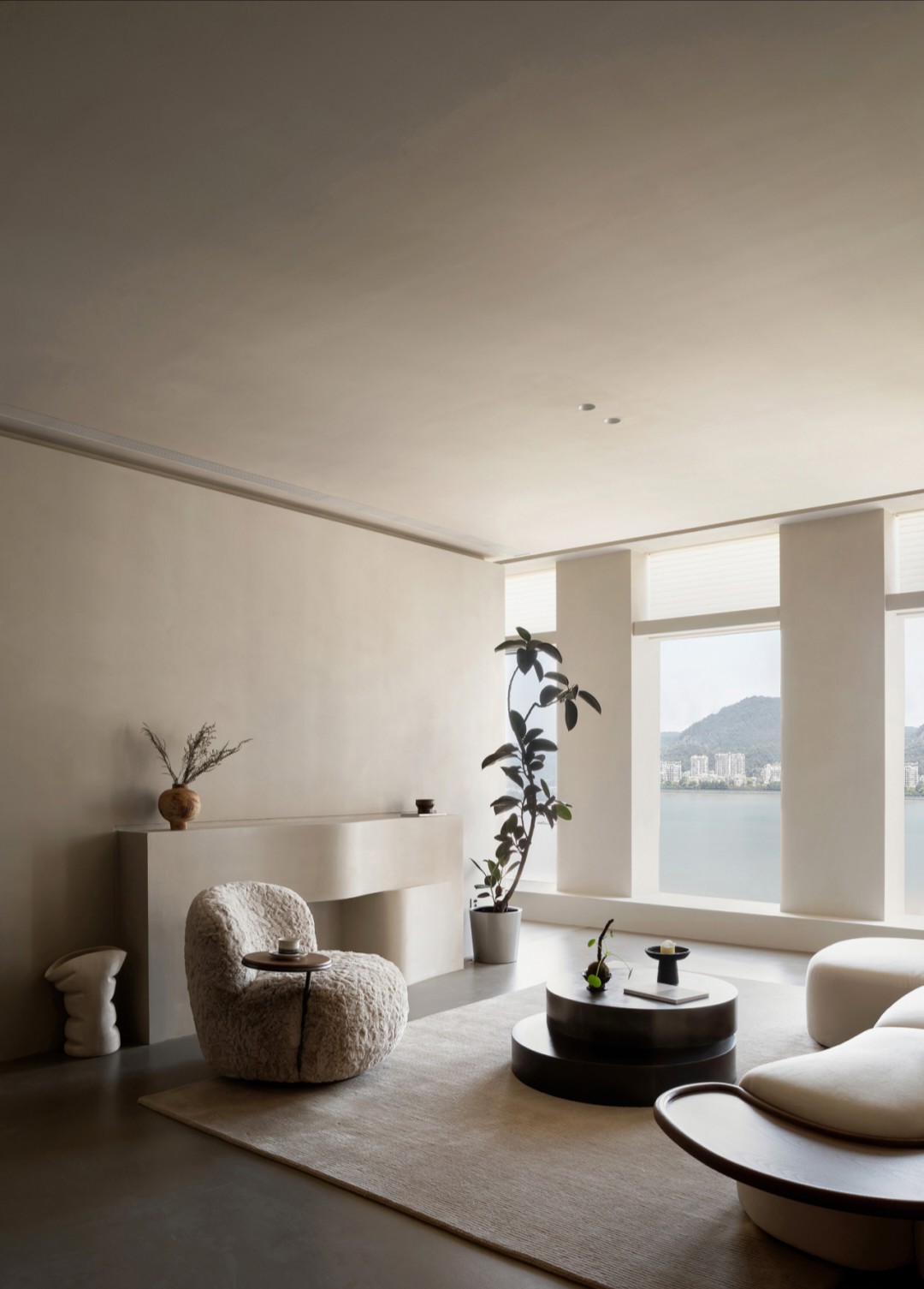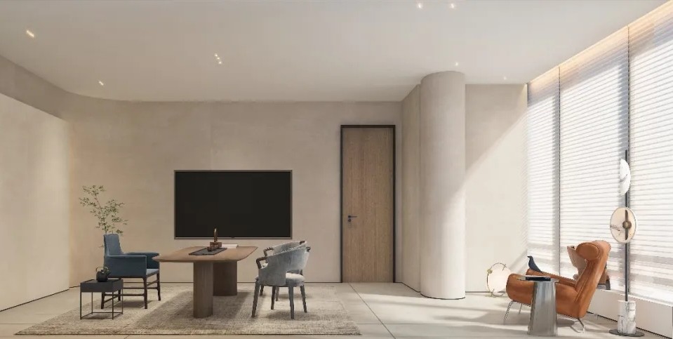 灵动的弧形与圆润的曲面元素在空间里错落叠加,优雅的视觉印象通过色调、肌理与形状,描绘 “裸”感美学空间的素雅、质朴的自然特性,传达视觉空间的柔和与纯粹。