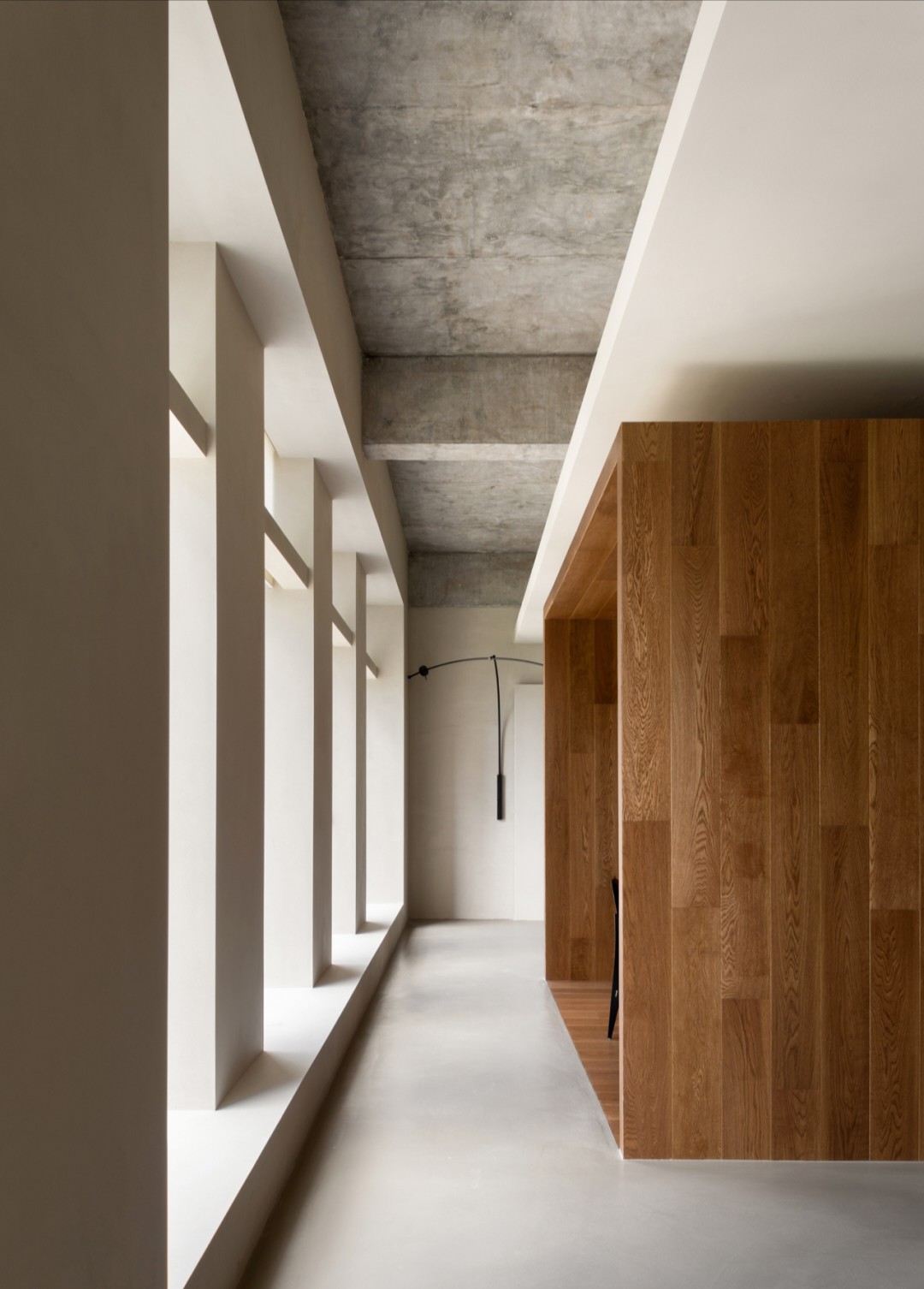 易筑 | 敞开式布局,赋予空间灵动性。水吧台与储物柜并置在玄关处,解决功能的同时,保证整洁的视觉体验。内部家具采用具有自然、包容属性的桦木板现场制作。