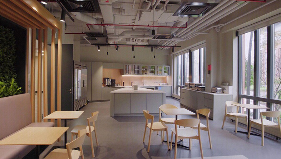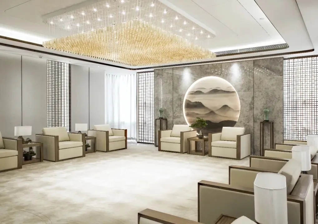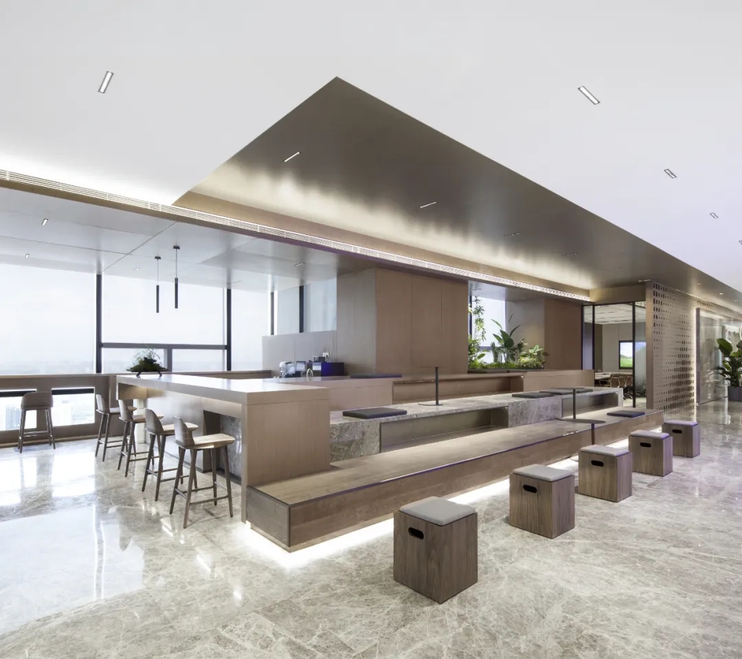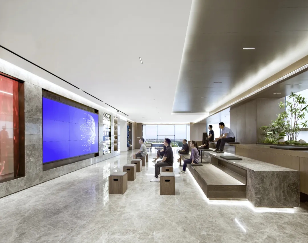 大屏幕对面设置了综合台阶座位区,石材和木质材料交替组合而成的造型台阶延展到端头转变成了咖啡吧台。坐席、咖啡的加入,使核心展区具备了多种使用场景,如读书会、企业宣传片观看、节日主题聚会、培训分享等等......为整个前厅空间注入了活力氛围。