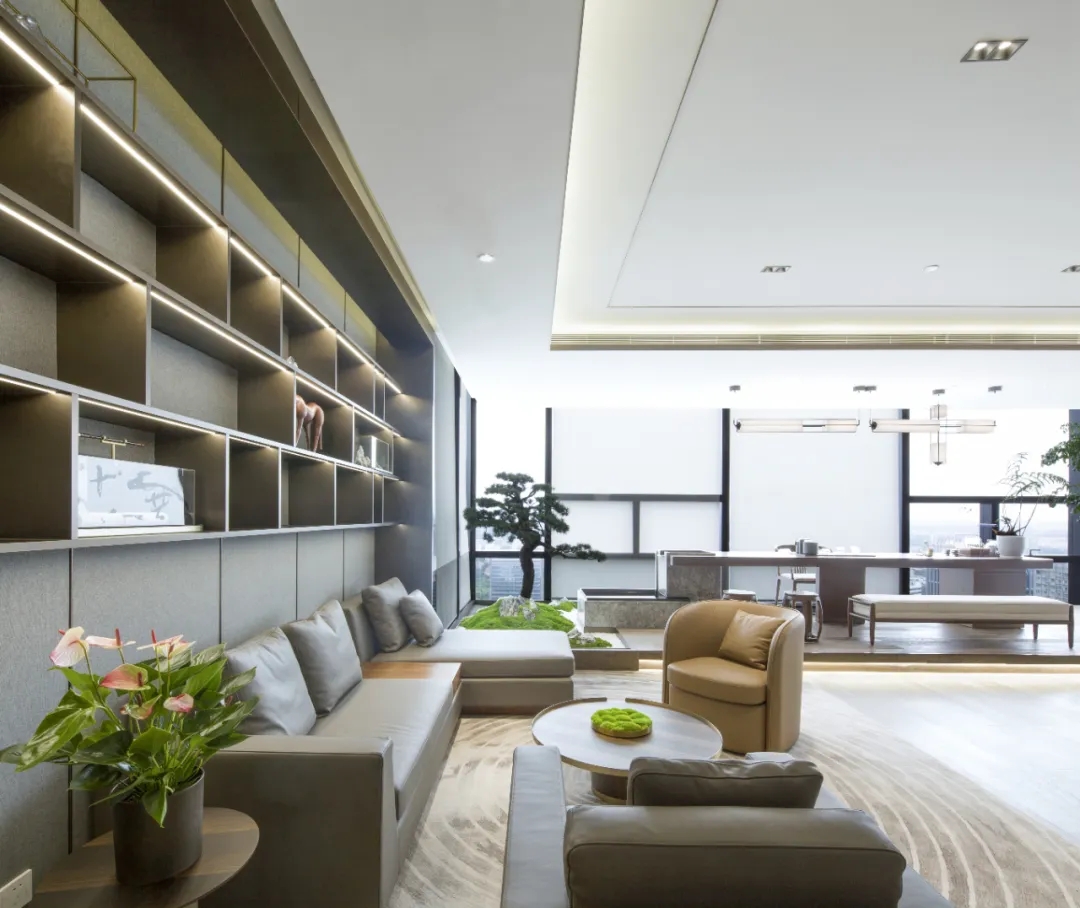 静的表现不仅在空间动线布局更是在色泽与光晕中给予进入者情感的输出,温雅的胡桃木以及软舒的布艺给人非常愉悦的触感享受。