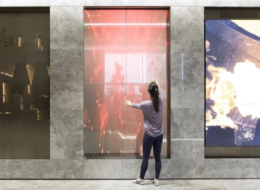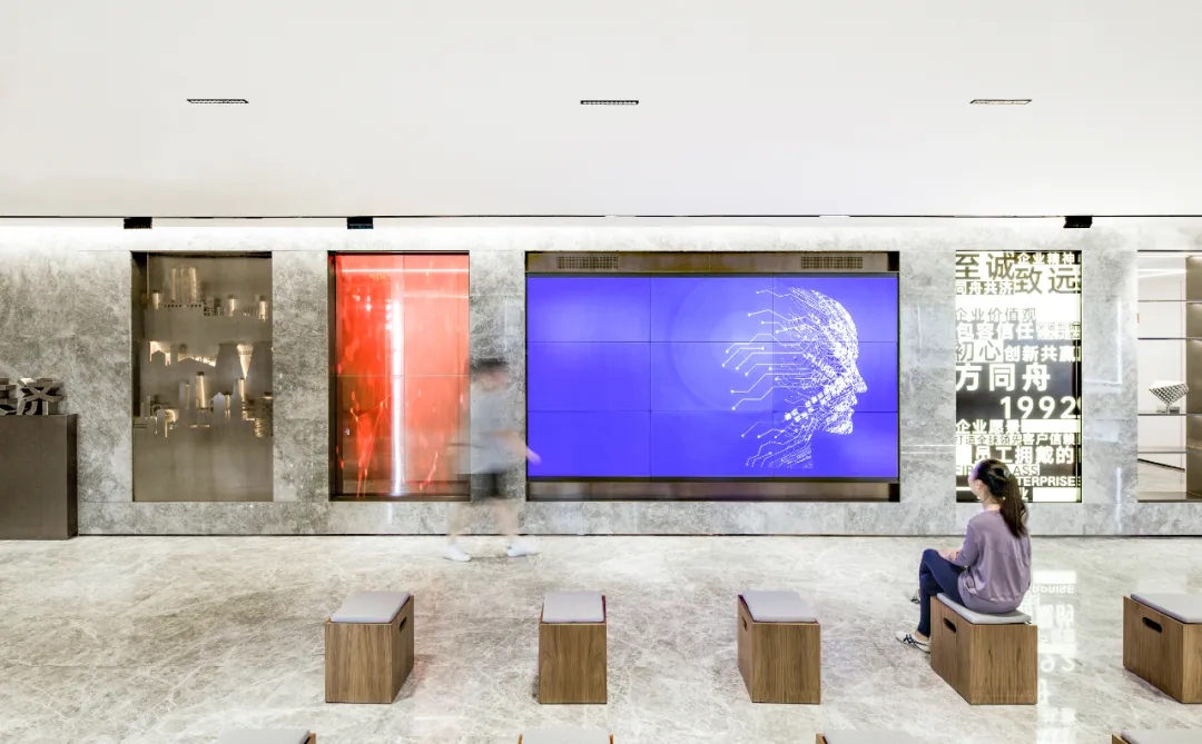 钢铁铸就的“志诚致远 同舟共济”是方同舟控股的企业精神也是方同舟创新之路的发展之源。层叠钢板雕刻出的钢厂剪影代表方同舟的传承和基石;交互玻璃LED屏可查看VR展厅、现代化工厂实景;字阵形式的企业文化展窗是合影的最佳背景;通透的搁架层板可以将将方同舟获得的重要荣誉集中展示。展墙的中间位置是一块大型拼接屏幕,可根据需要播放不同主题的企业宣传片和主题视频。