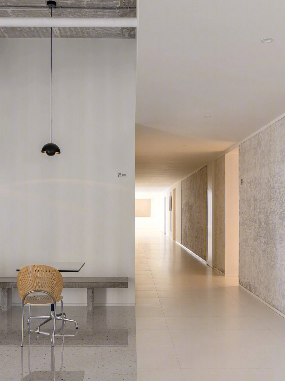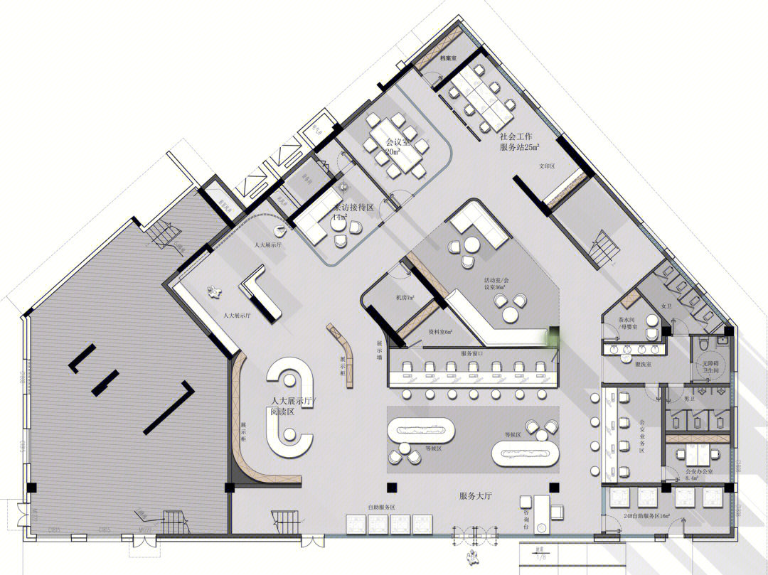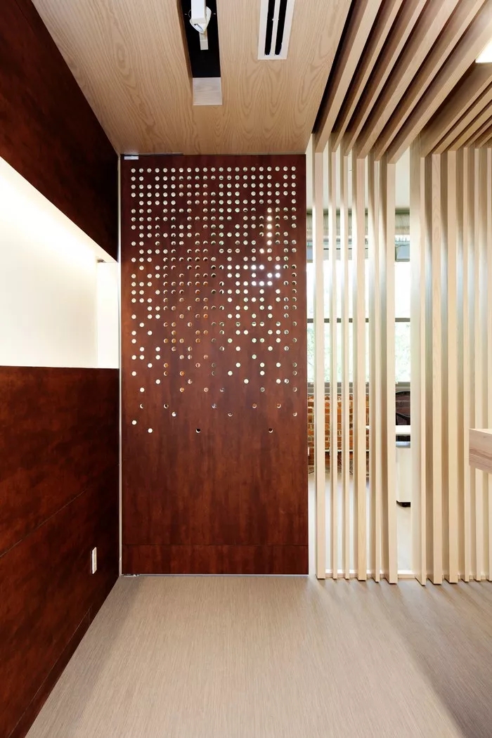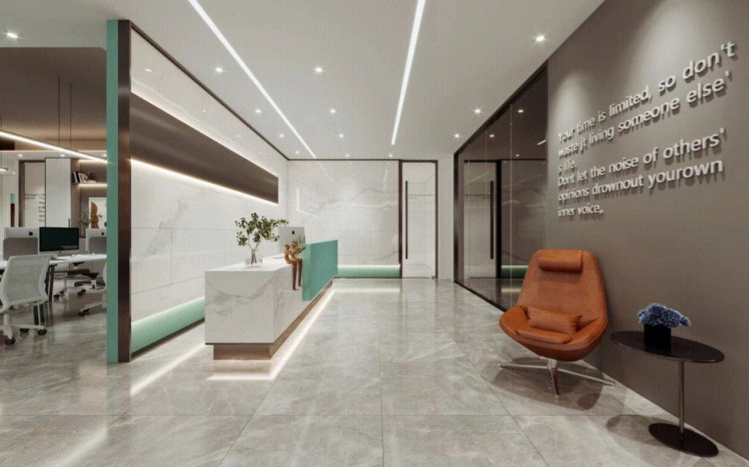 接待区简练而又多元的设计为访客营造了一个温馨的接待氛围;柔和温暖的灯光结合自然清新的木饰面和白色元素,勾勒出一个轻盈愉悦的空间氛围,并奠定了整个环境设计的基调。通过巧妙地灯具装饰,让原本开敞高耸的空间变得具有亲和感;同时,墙面上灰色的造型设计也颇具art deco艺术装饰风格。