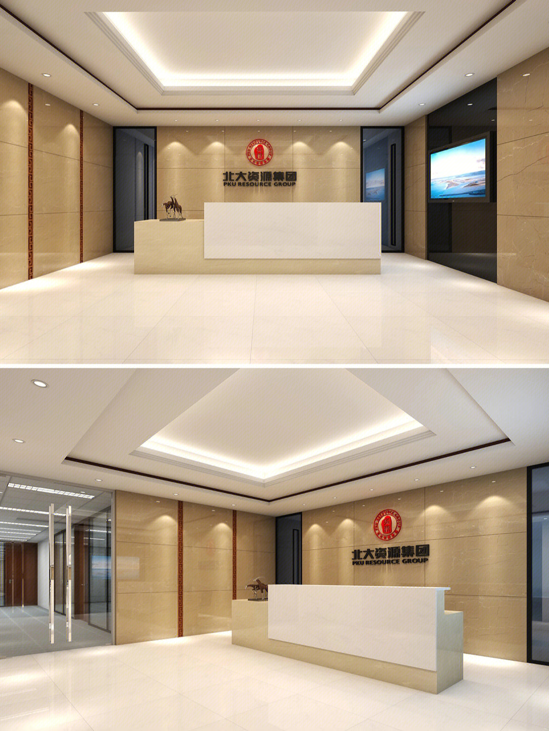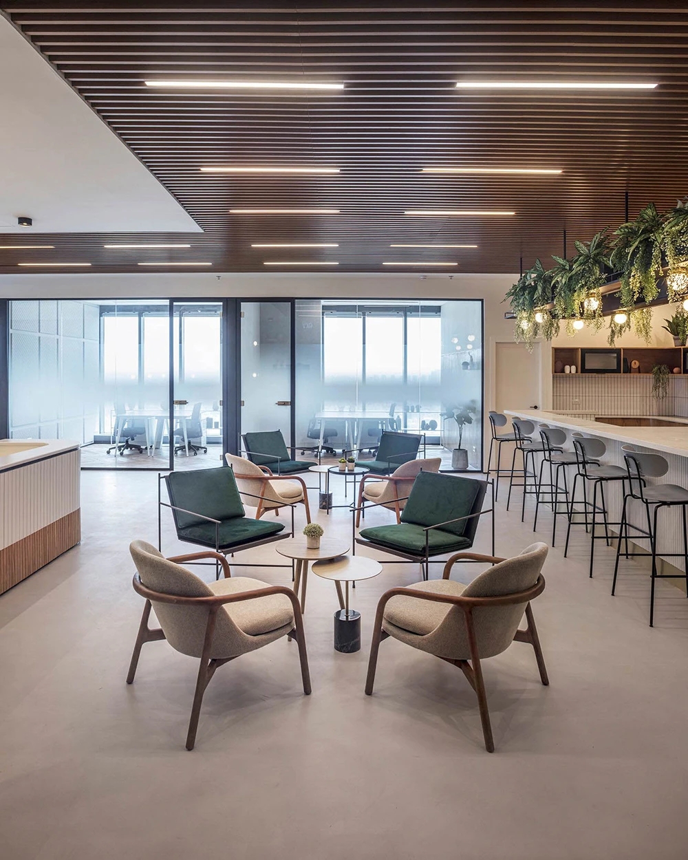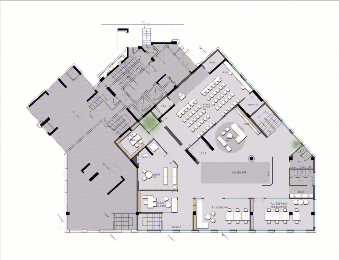 接待区简练而又多元的设计为访客营造了一个温馨的接待氛围;柔和温暖的灯光结合自然清新的木饰面和白色元素,勾勒出一个轻盈愉悦的空间氛围,并奠定了整个环境设计的基调。通过巧妙地灯具装饰,让原本开敞高耸的空间变得具有亲和感;同时,墙面上灰色的造型设计也颇具art deco艺术装饰风格。
