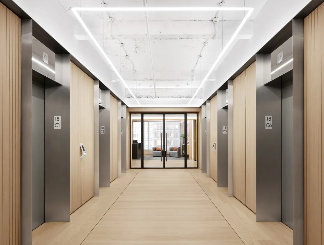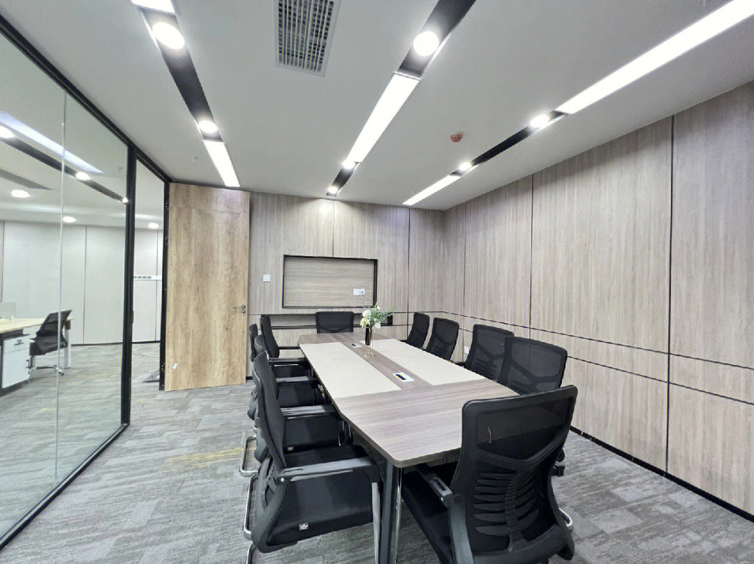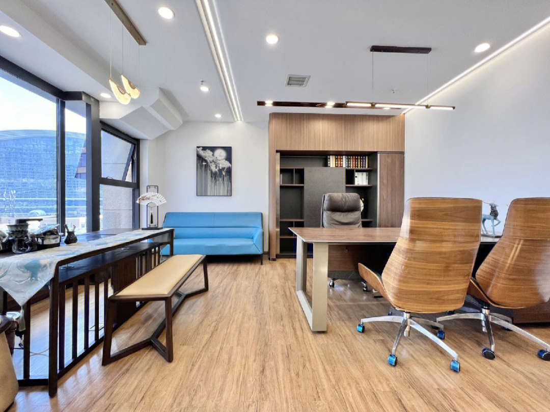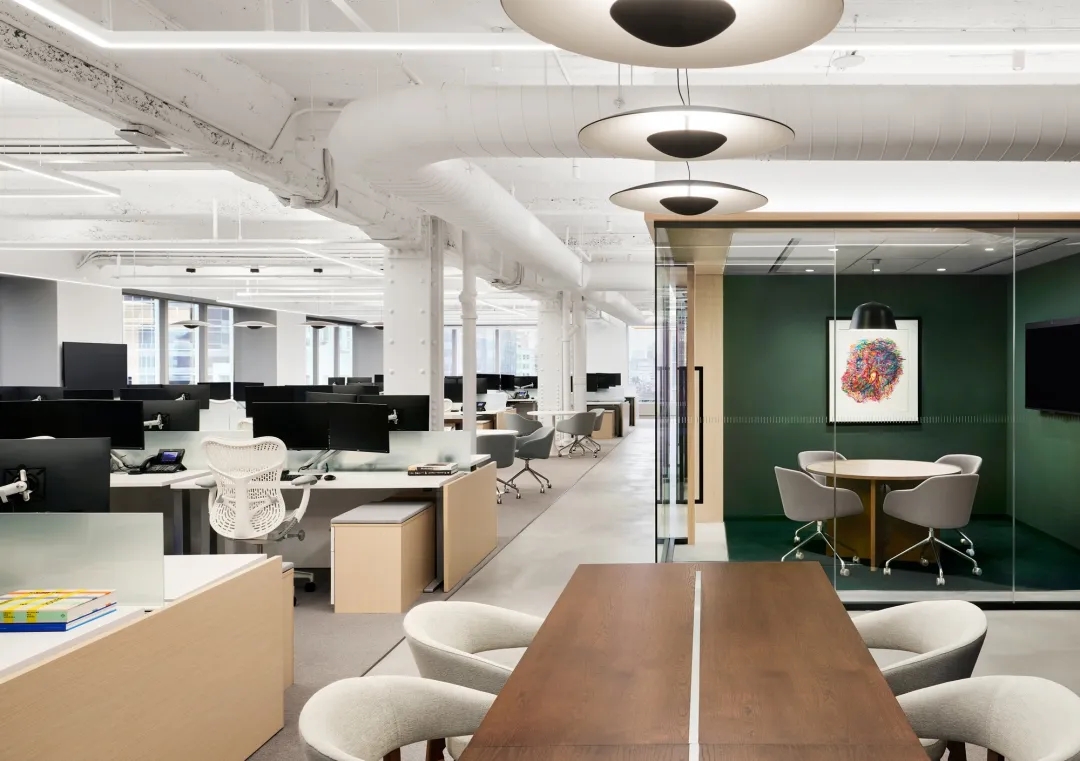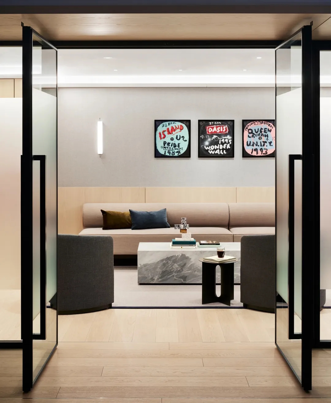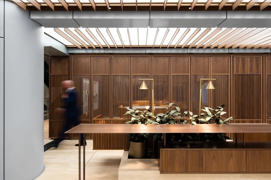 整体空间采用深色木材,与开放式办公区更轻、更明亮的材料形成鲜明的对比。