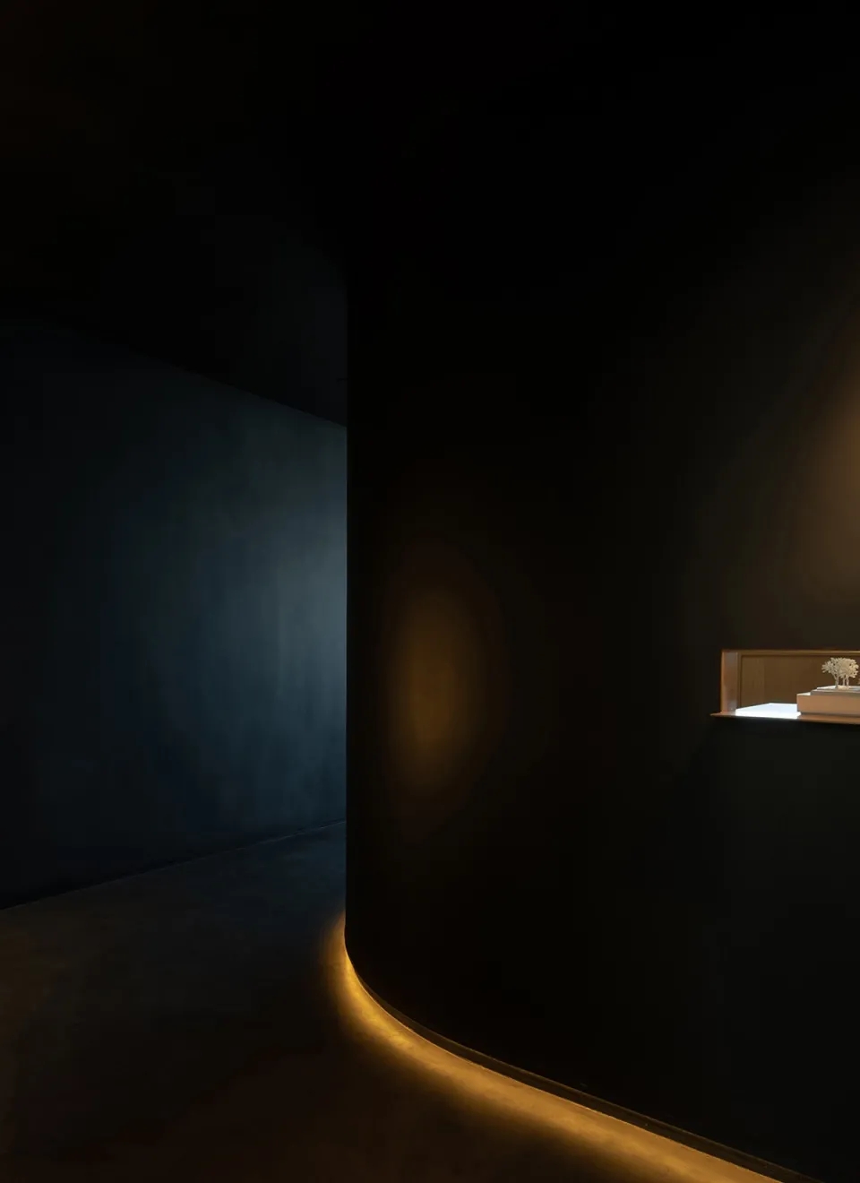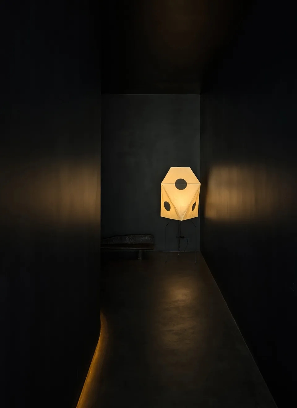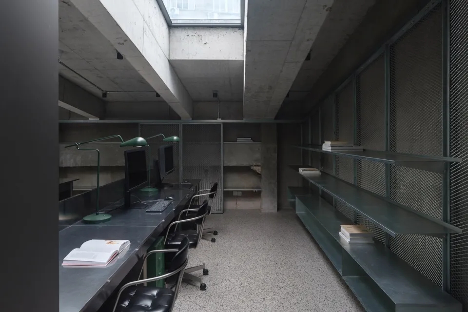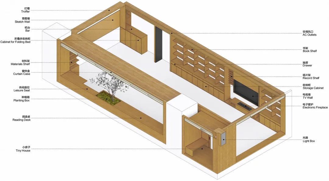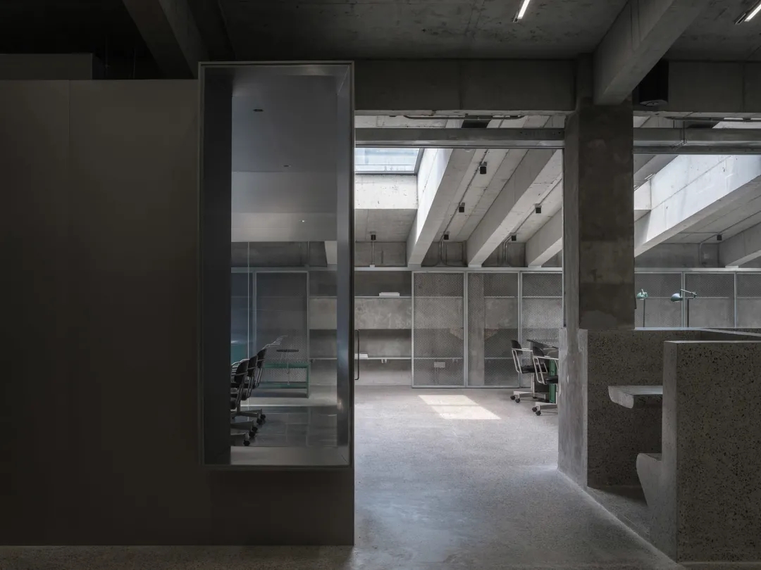 工作室的初始平面呈L型,进门处是一块约20平米的方形区域。我们在这儿立起一道顺应流线的弧墙划分出了过渡空间,也隔绝了工作室内部与门外公共走廊间的相互影响。透过弧墙对门位置破开的条形洞口,可隐约窥探墙后的模型区。洞口下方悬挑出的黄铜板,在内部扩展了模型制作时的操作范围。平日制作的实体模型在此随性摆放与更换,自然成了工作室对外展示的小窗口。
