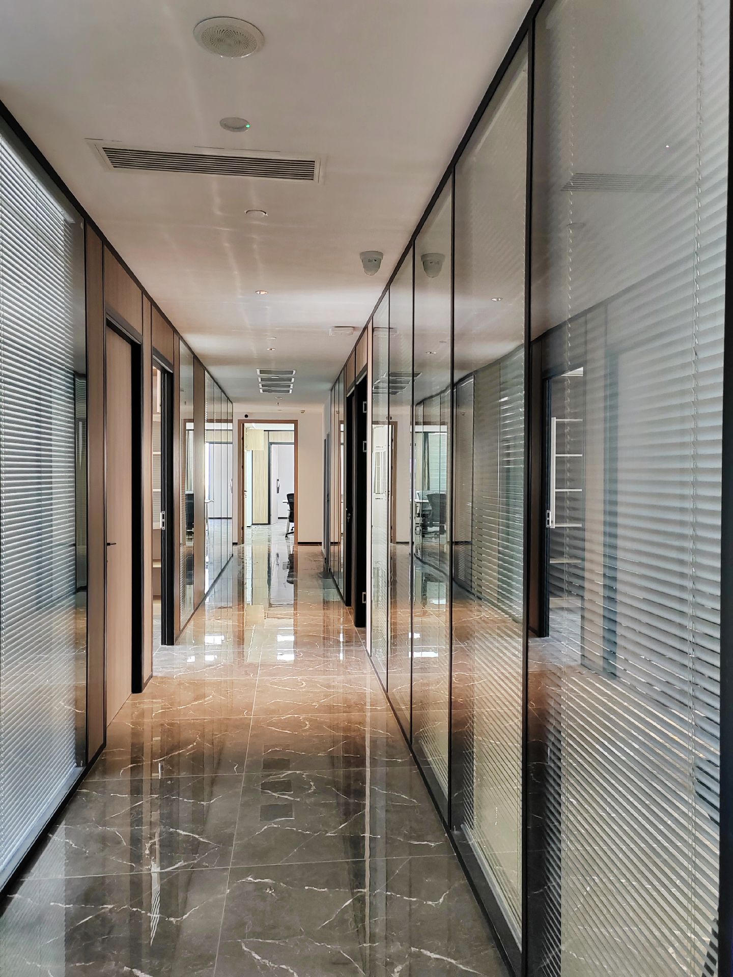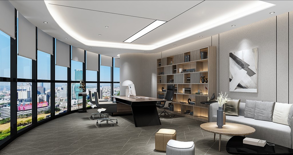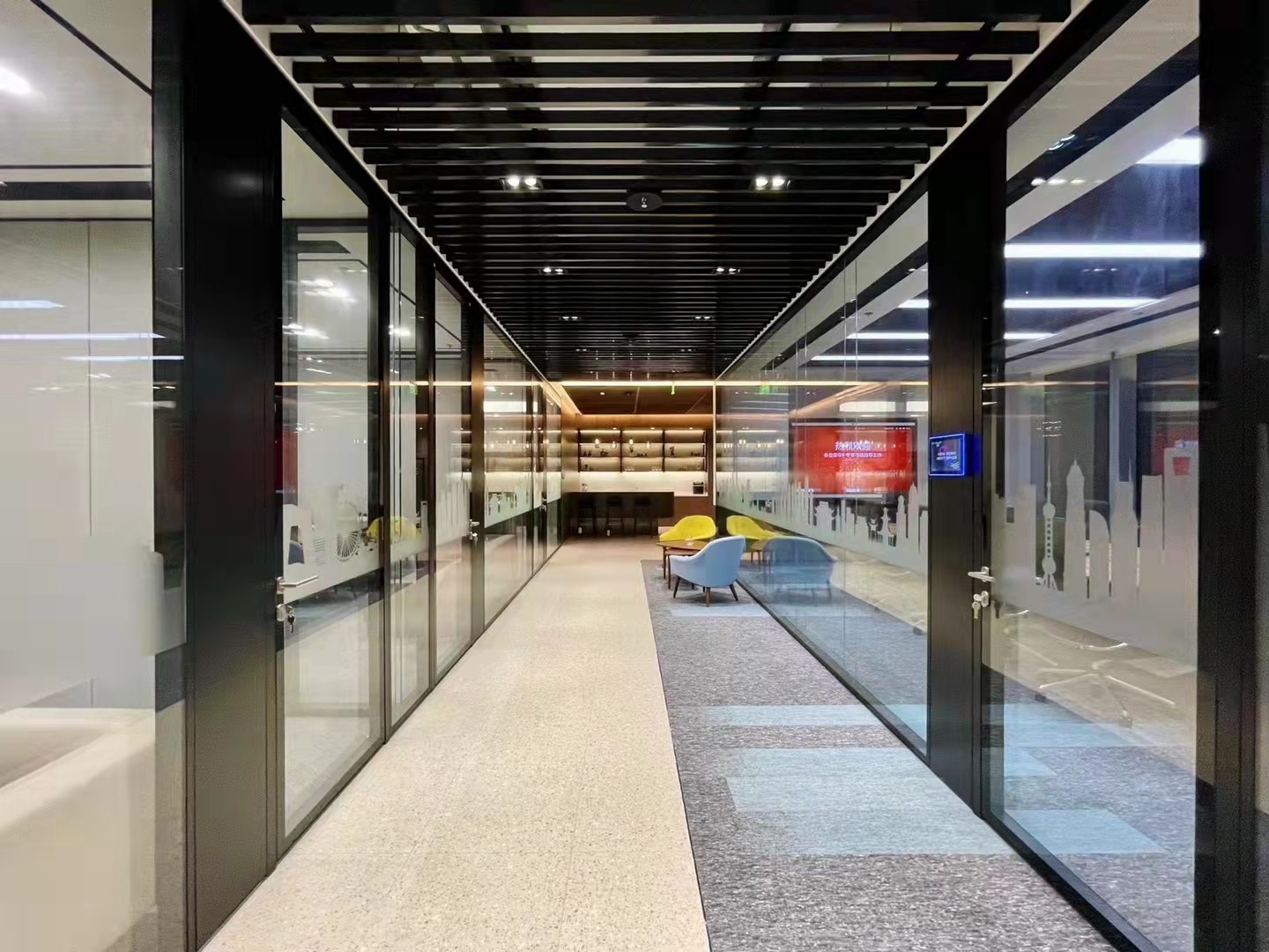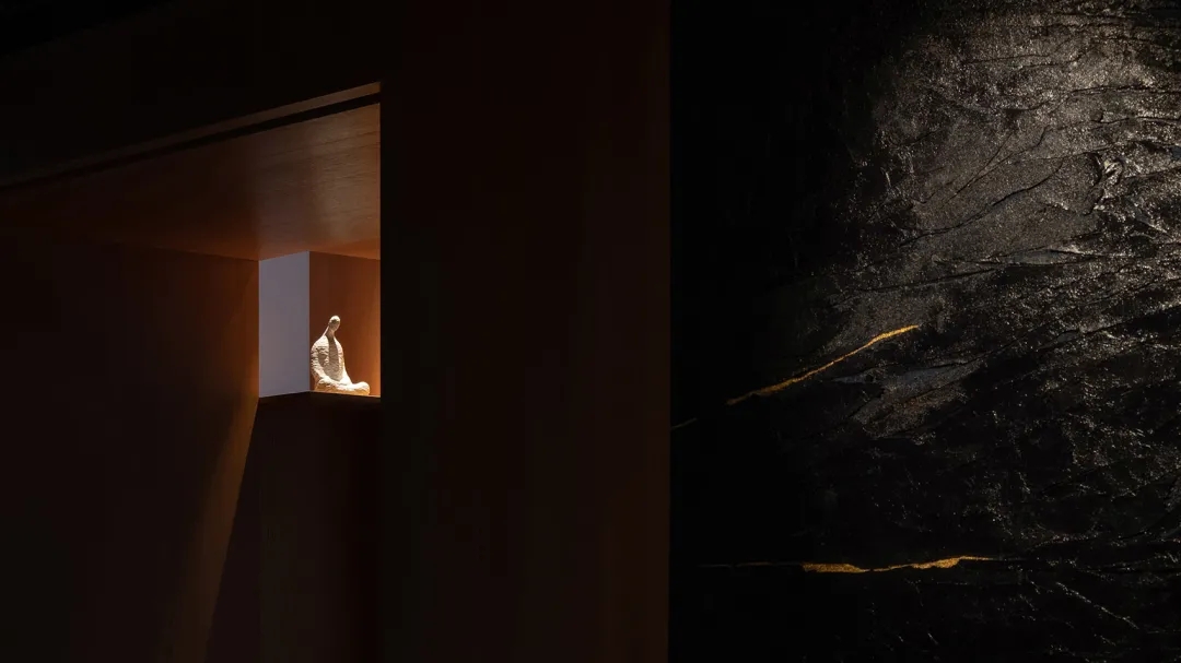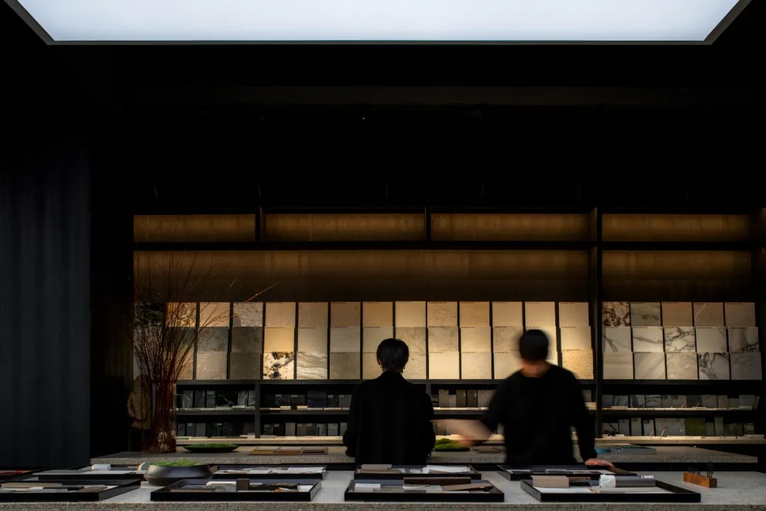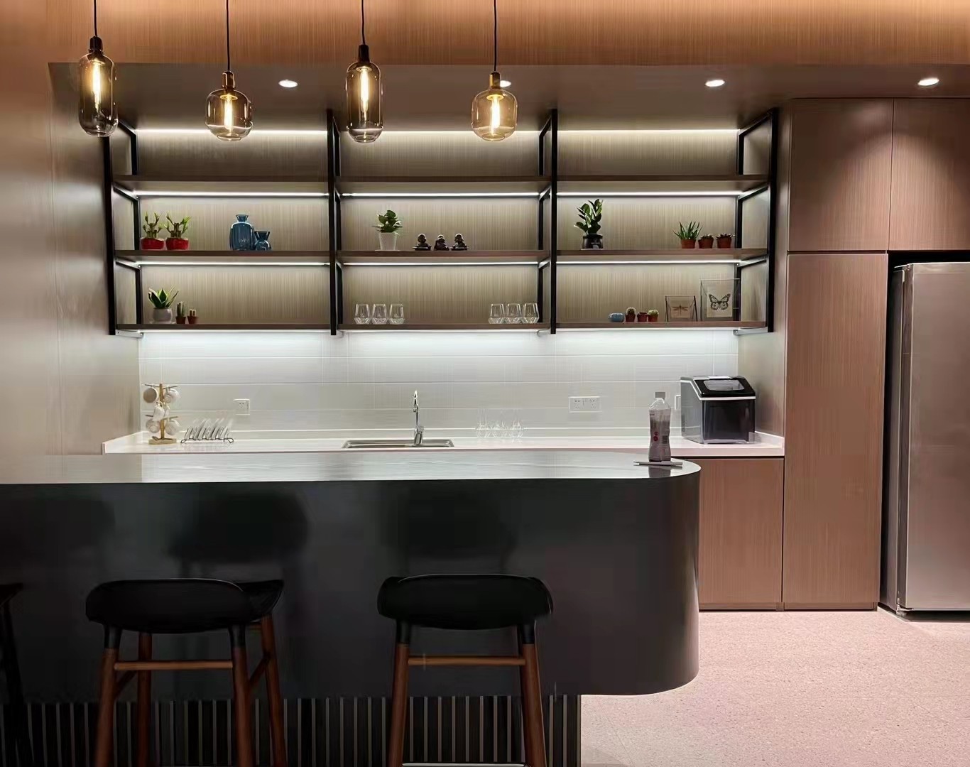 工作室的初始平面呈L型,进门处是一块约20平米的方形区域。我们在这儿立起一道顺应流线的弧墙划分出了过渡空间,也隔绝了工作室内部与门外公共走廊间的相互影响。透过弧墙对门位置破开的条形洞口,可隐约窥探墙后的模型区。洞口下方悬挑出的黄铜板,在内部扩展了模型制作时的操作范围。平日制作的实体模型在此随性摆放与更换,自然成了工作室对外展示的小窗口。