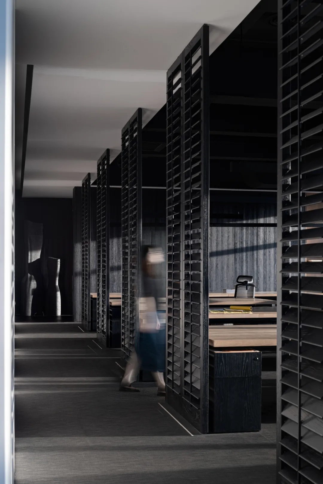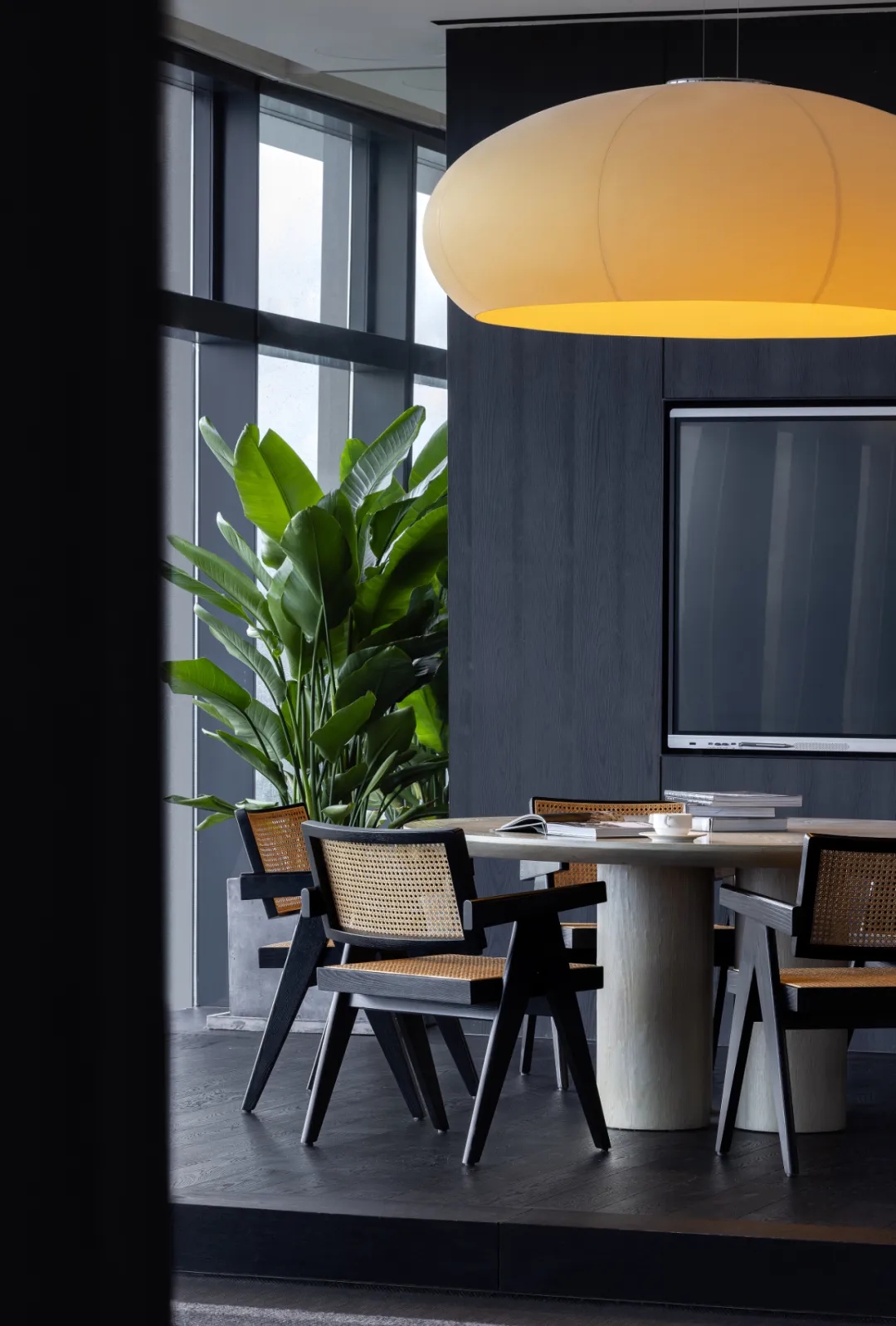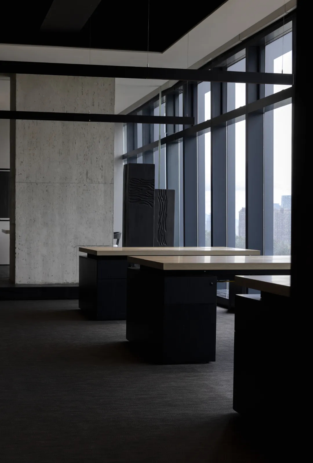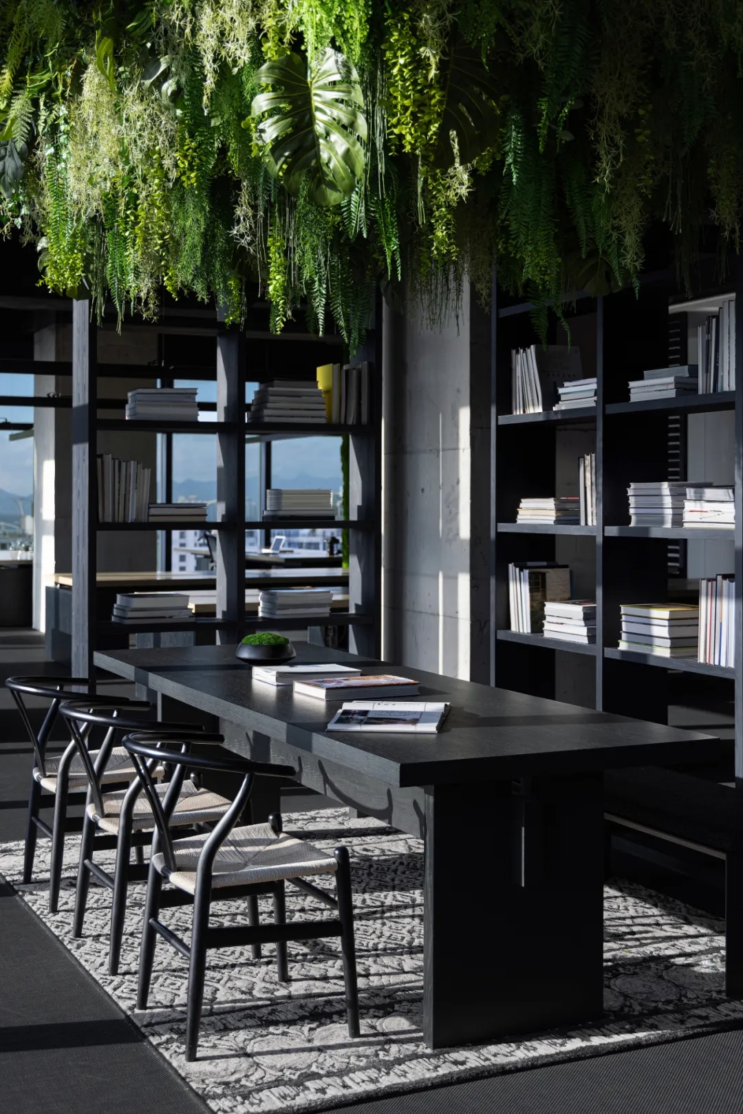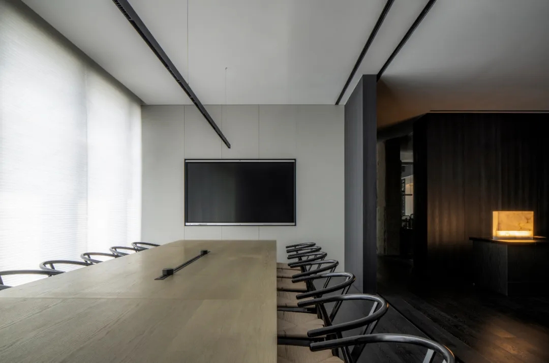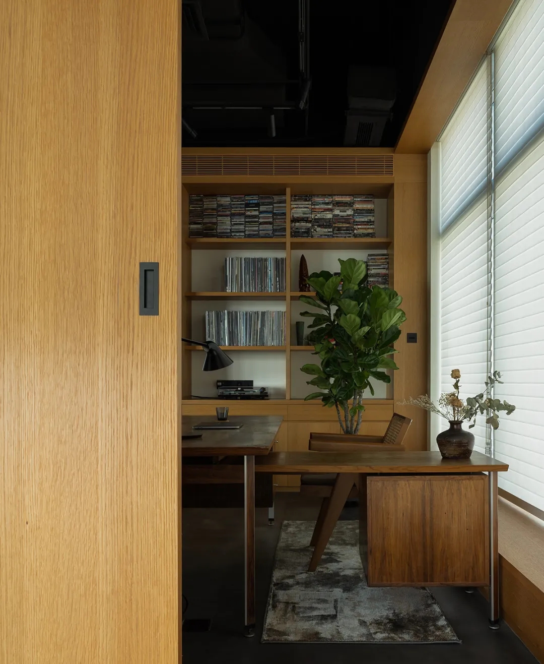 会客区内摆进舒适的中古沙发椅,像家中的小客厅,聊天讨论不必正襟危坐,也满足了喝咖啡、听音乐等日常需求。将工作生活的零碎通过大家具分门别类规整好后,设计的动作便告一段落。而橡木本身的温润质感,也在空间中平衡了与黑色天花、灰色微水泥地面之间的冷暖关系。