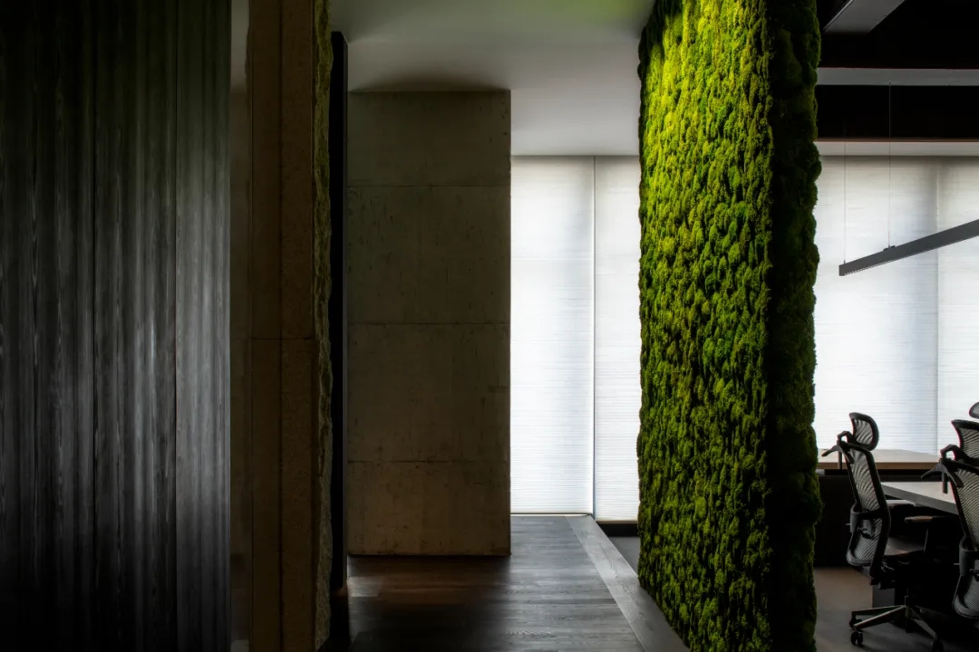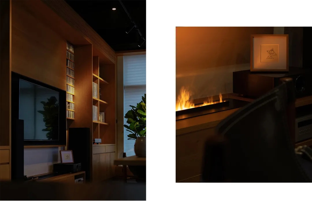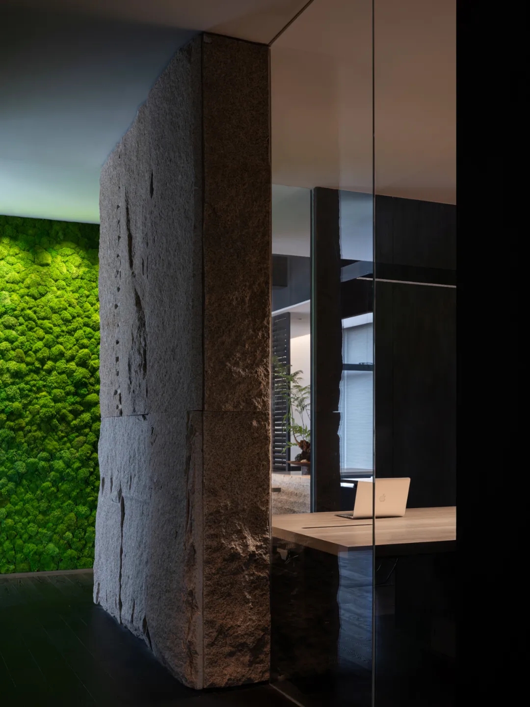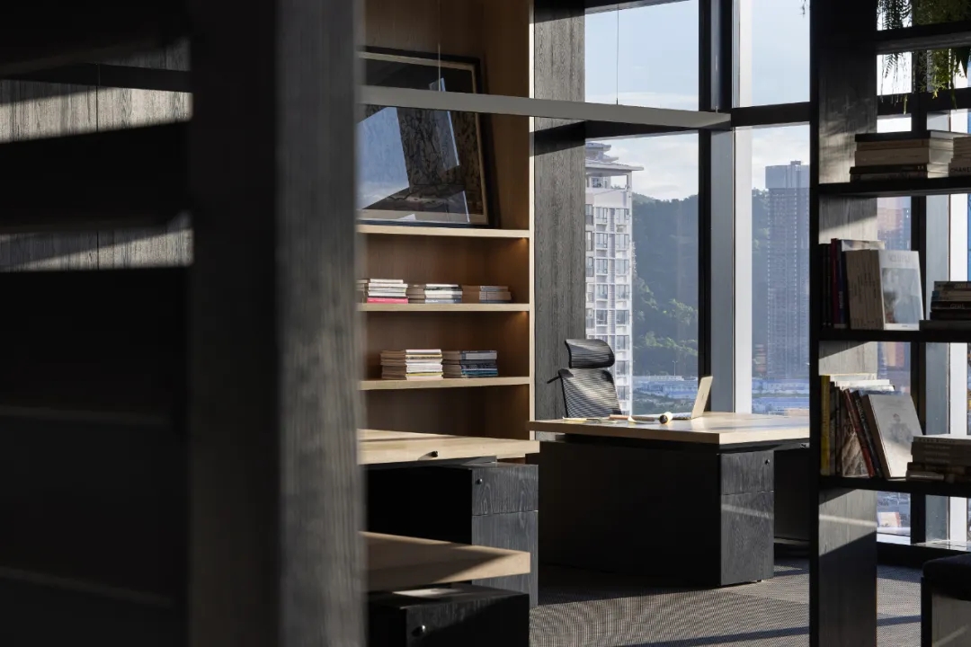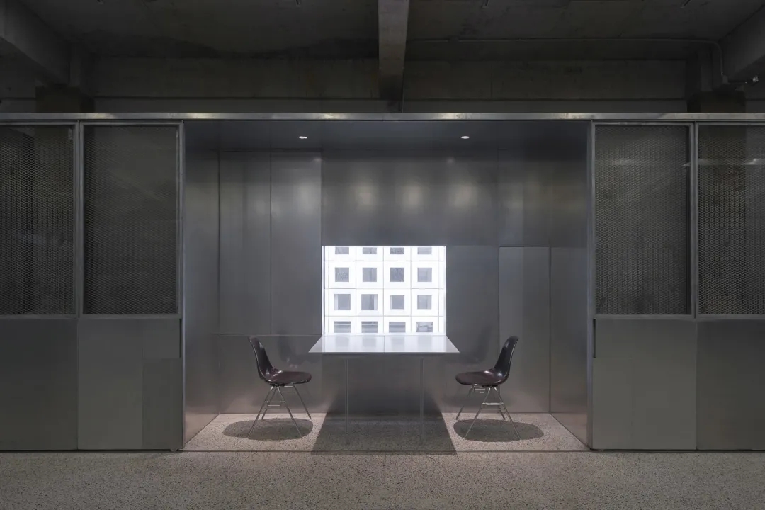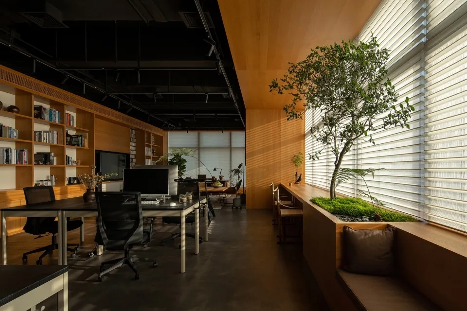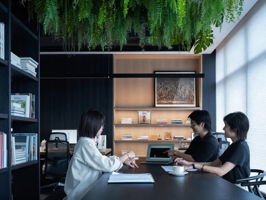 会客区内摆进舒适的中古沙发椅,像家中的小客厅,聊天讨论不必正襟危坐,也满足了喝咖啡、听音乐等日常需求。将工作生活的零碎通过大家具分门别类规整好后,设计的动作便告一段落。而橡木本身的温润质感,也在空间中平衡了与黑色天花、灰色微水泥地面之间的冷暖关系。
