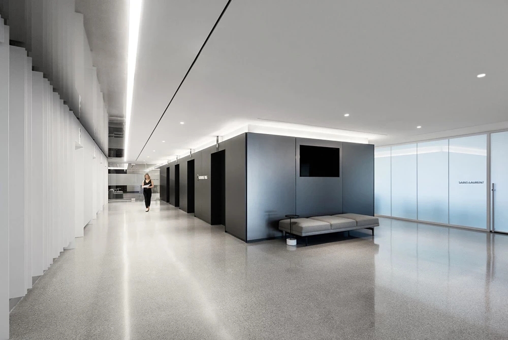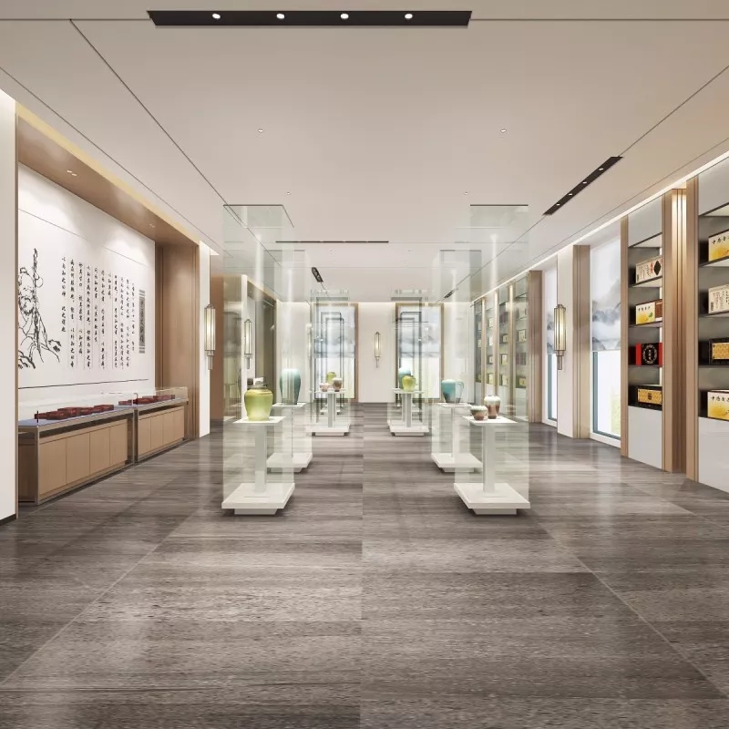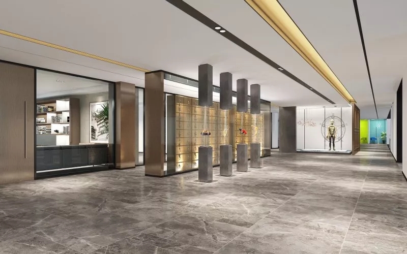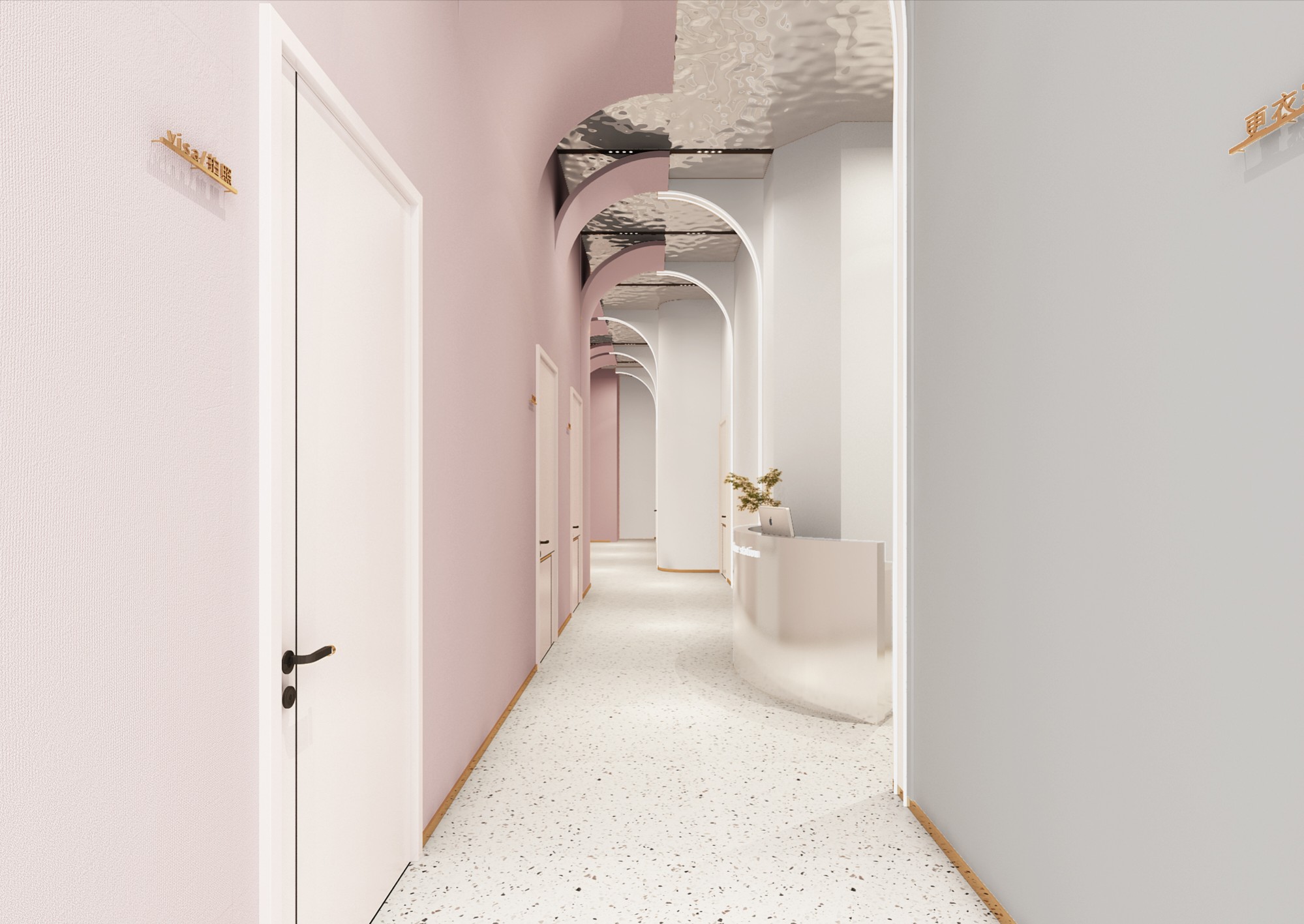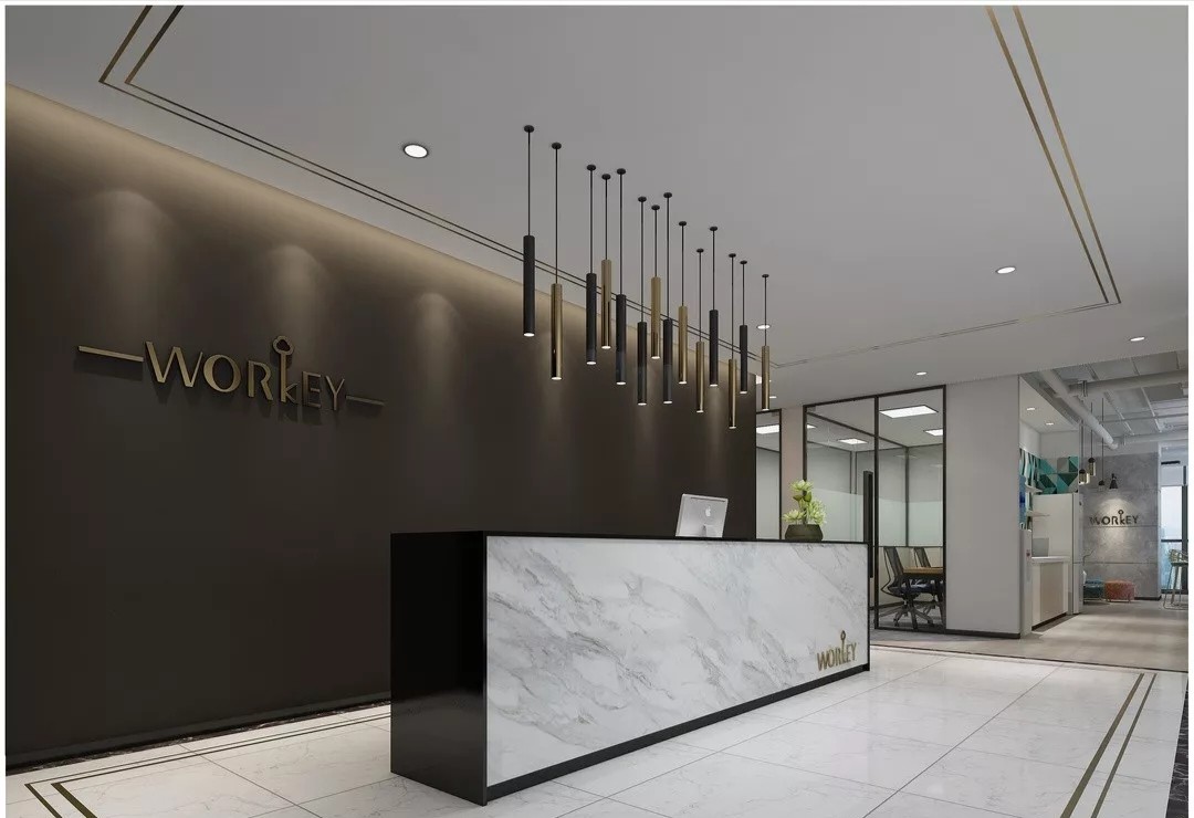 新颖别致,是走进这里的第一感觉。错落有致的吊灯设计,宛若风铃迎客来;天花与地面上下对应的方形线条,则让前台空间更具立体感。背景与前台的金属装饰,从暗色调中凸显品牌,活泼而不失大气。