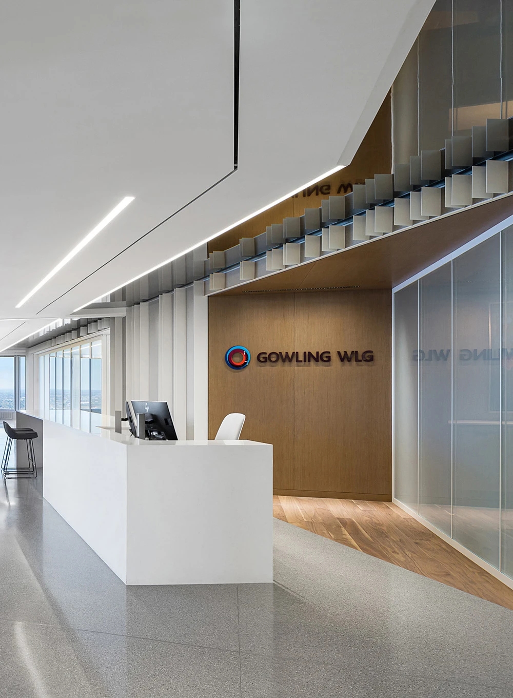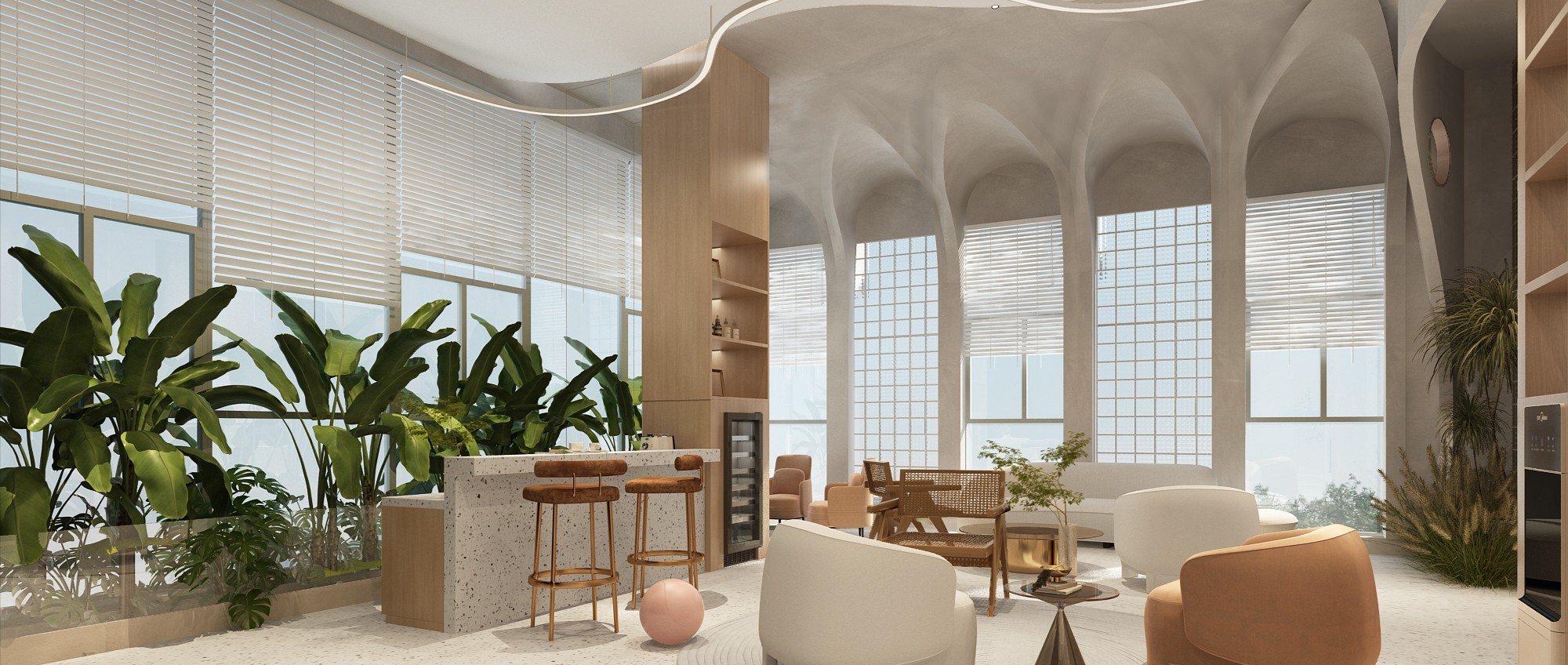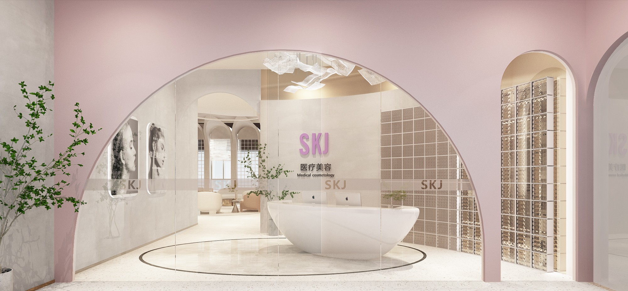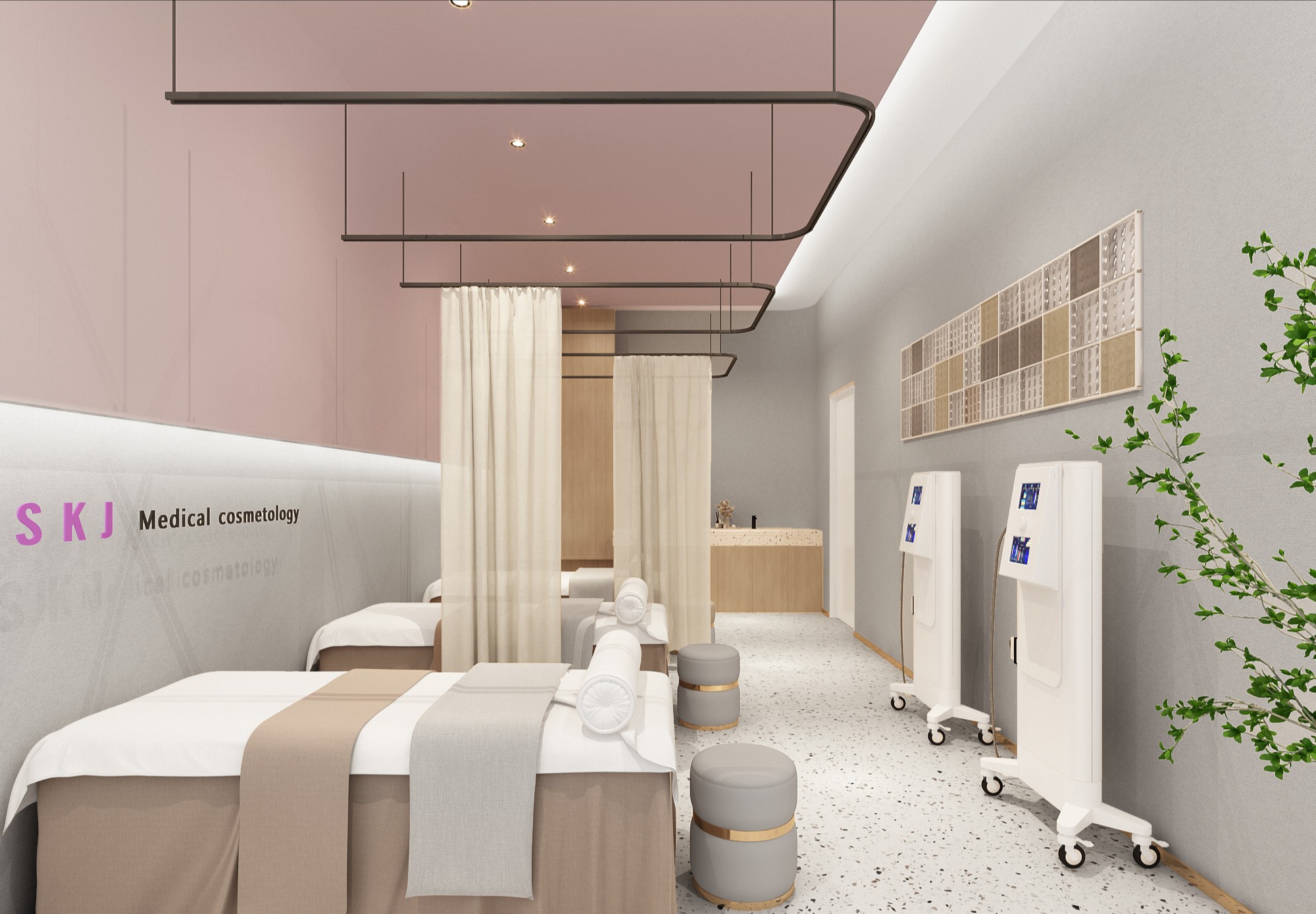 新颖别致,是走进这里的第一感觉。错落有致的吊灯设计,宛若风铃迎客来;天花与地面上下对应的方形线条,则让前台空间更具立体感。背景与前台的金属装饰,从暗色调中凸显品牌,活泼而不失大气。