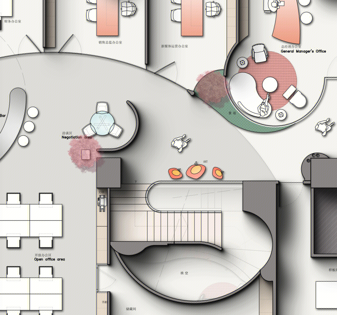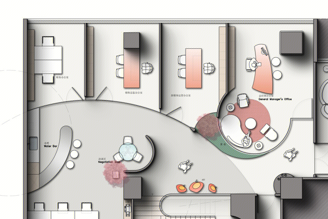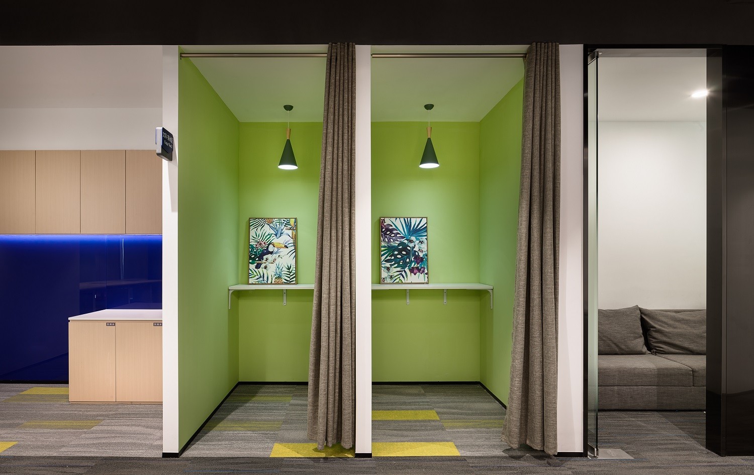 整体空间亦讲求现代化的时尚感与富含自然化的科技感之间的平衡与共融,哪怕每一处不起眼的小细节。任何一处空间都能接触到自然元素和美景风光。宽敞的窗户可以俯瞰楼下的车水马龙,或眺望远方的建筑,对自然光线的充分利用有助于改善员工的身心健康。而且可以随意移动拼接的座椅,有利于员工在进行协助或者进行头脑风暴的时候灵活摆放。