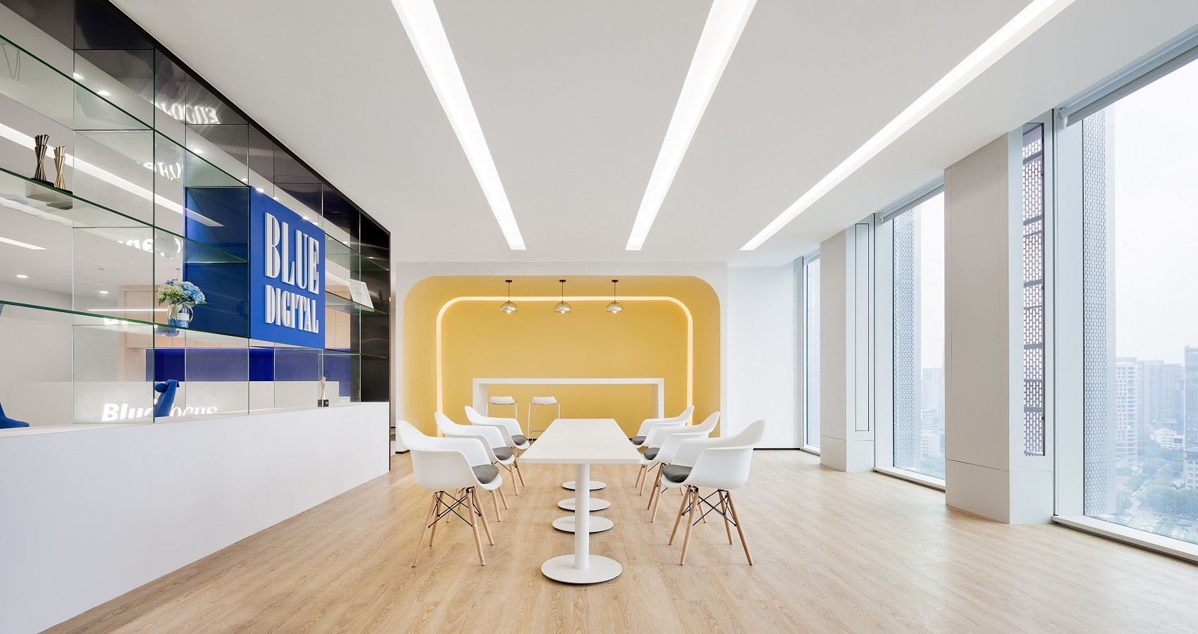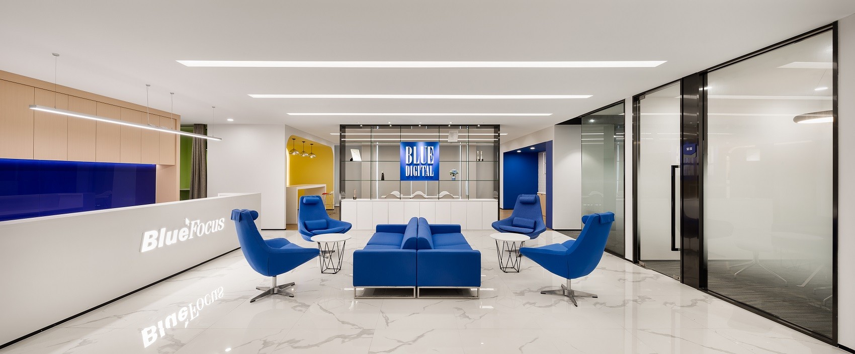 设计以蓝色光标标志性的蓝色为主色调,通过不同色调的蓝组合出丰富的视觉层次,提升空间的活力值与明快度,创造出轻松的办公氛围。鲜明的品牌标识为访客提供了指引,同时强化了品牌体验。时尚风味与自然可持续材料的相互融合,带有白色花纹大理石地板在灯光的照耀下,整体的高端氛围油然而生,完美实现现代摩登气质。