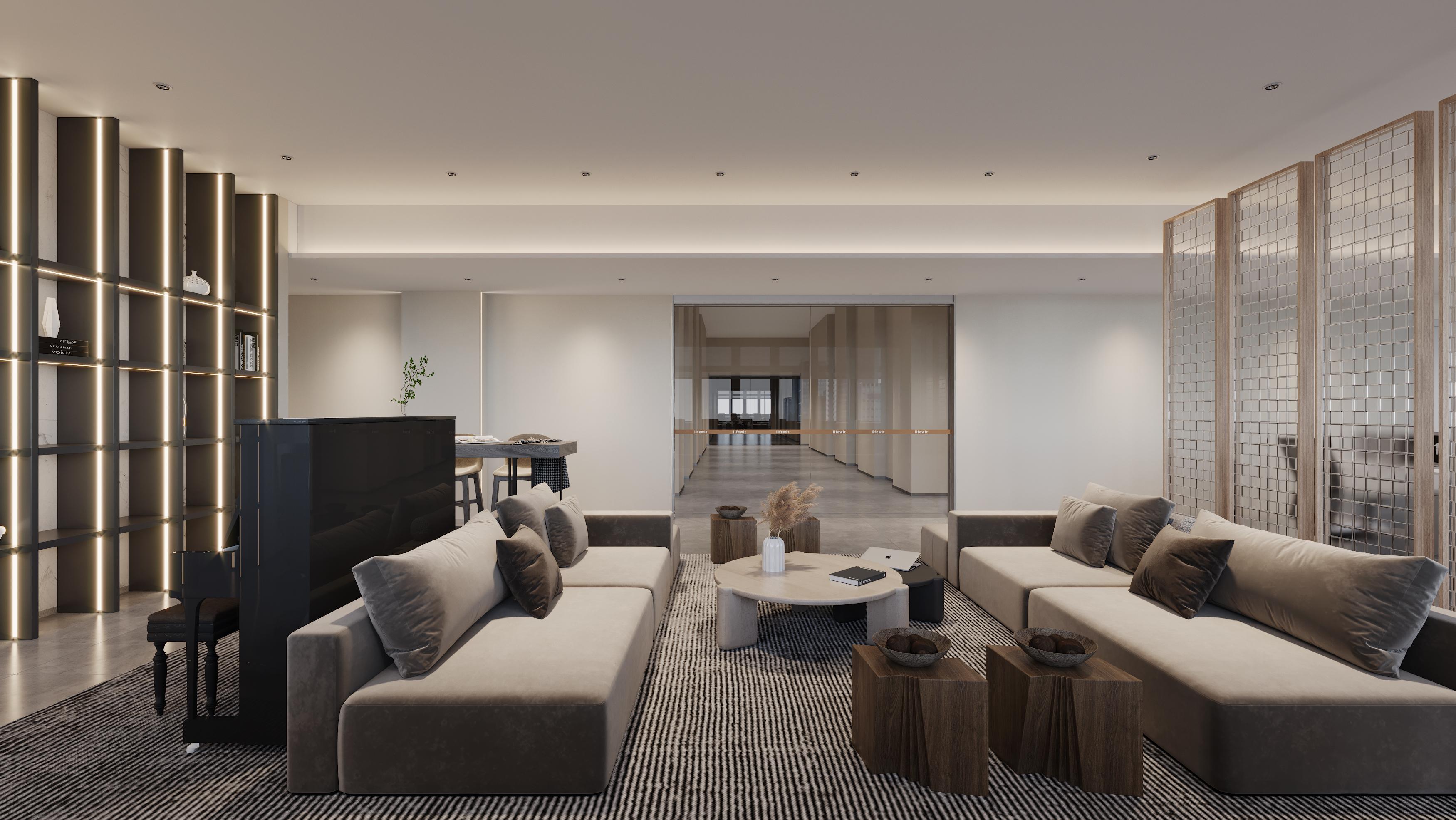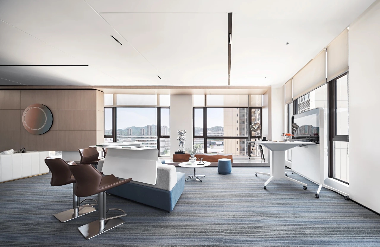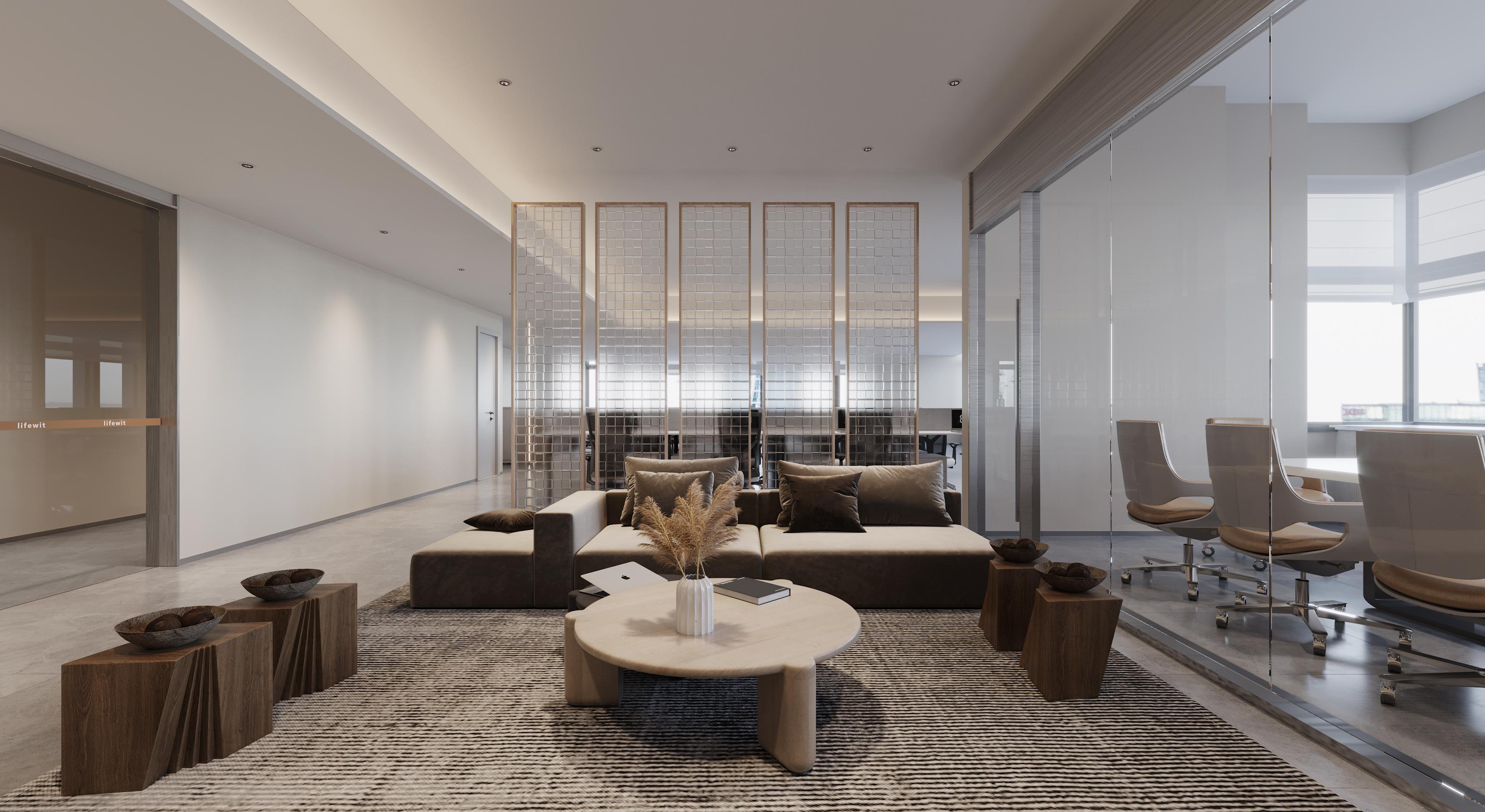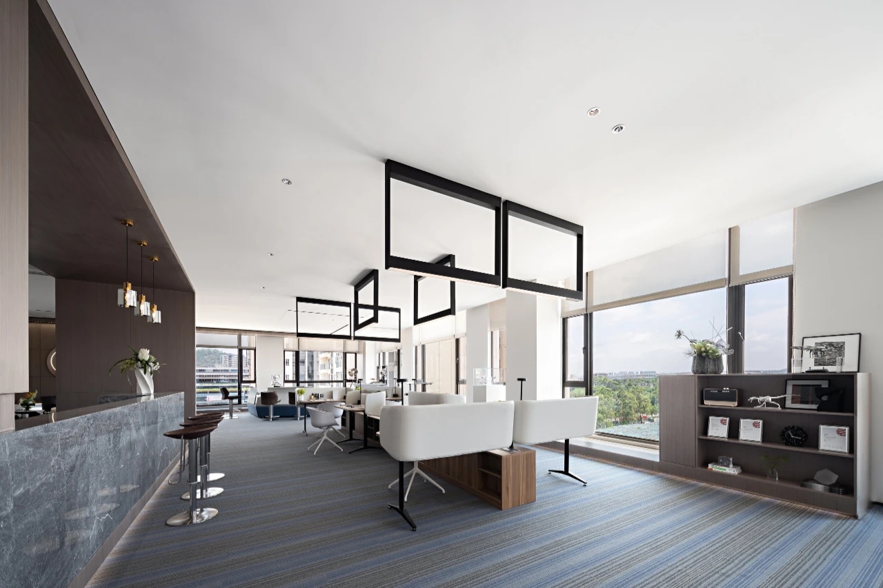 前厅接待区以干净的黑白灰为主色调,加以棕色、蓝色作为点缀,在凸显空间现代质感和精致大气之余,亦增加了空间的色彩层次和休闲格调。自由开放的空间氛围、充满艺术气质的家具和绿植配饰、舒适明亮的光线,营造出一个明快清爽、精致个性而又轻松愉悦的工作形态空间。