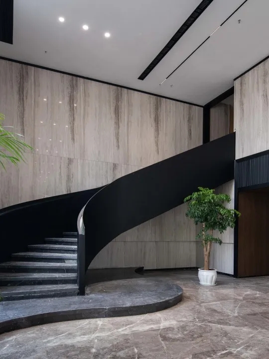 黑色钢结构与墙面石材碰撞出简洁而有力量的美感…