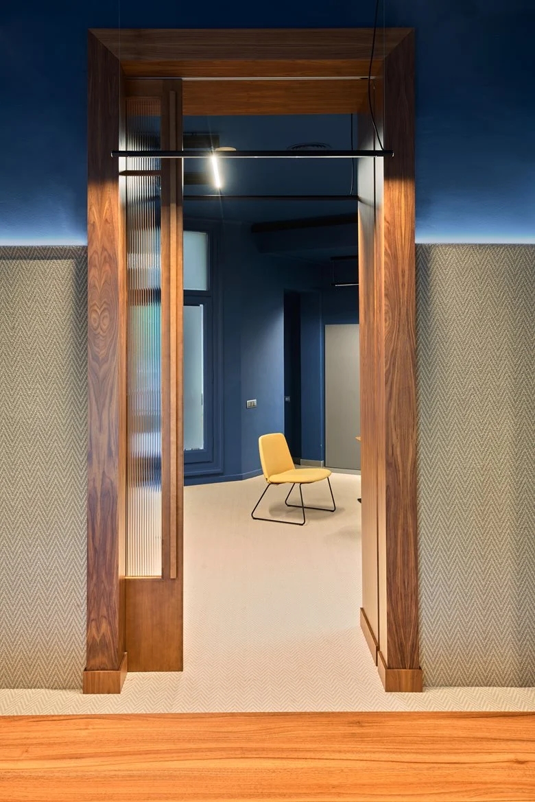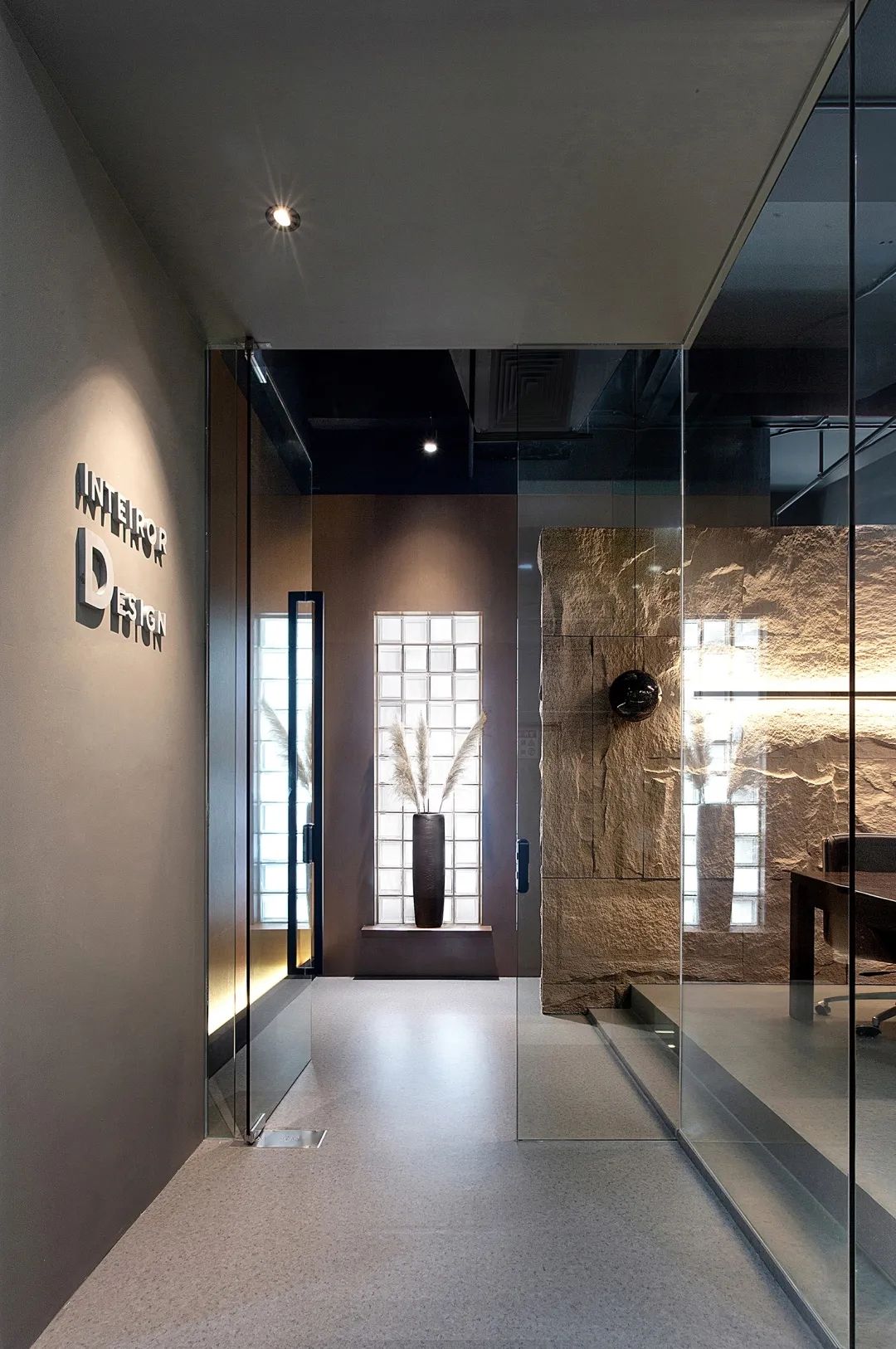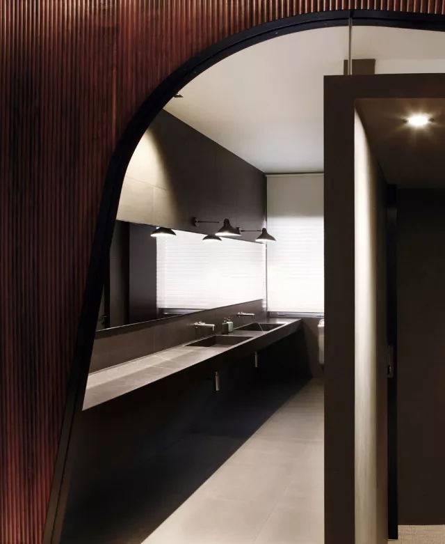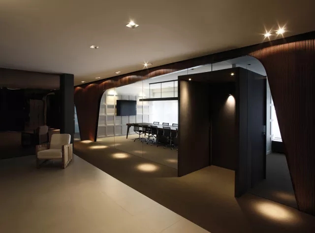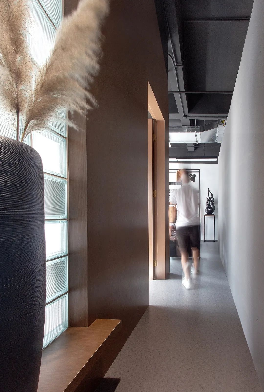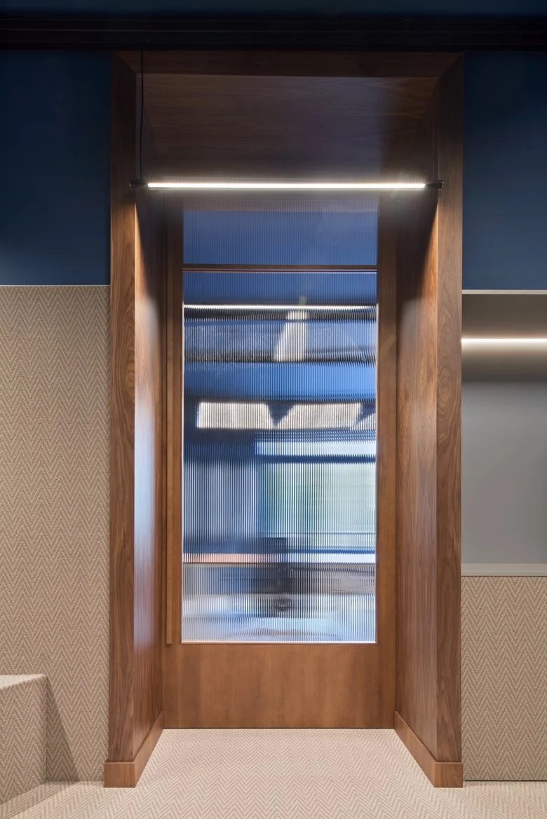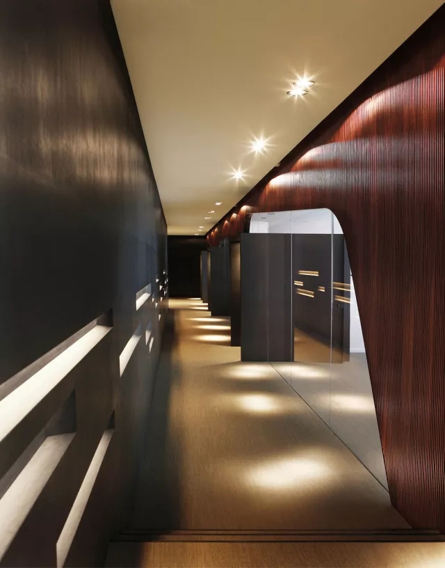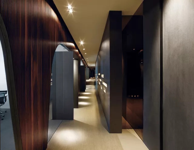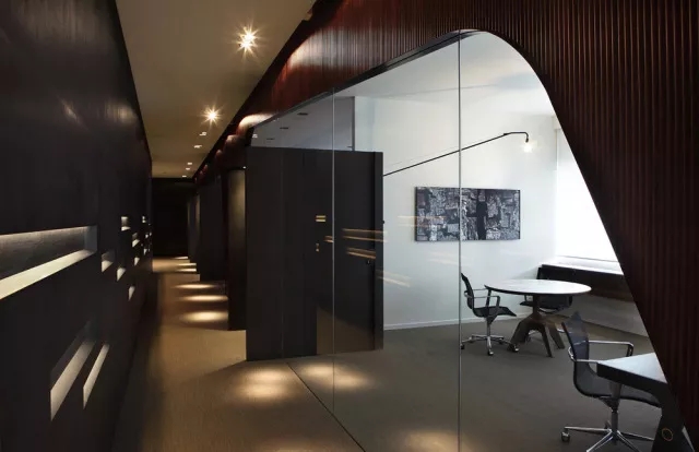 长廊连接会议室和办公室的入口,呈不对称设计。行政办公室和会议室一侧的墙面由美国胡桃木和边缘被切割成弧形的透明落地玻璃组成,内部朴素的标准办公空间一览无余。办公室的门由暗色木材制成,打断玻璃墙面,悬伸在空间之中。