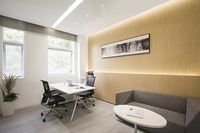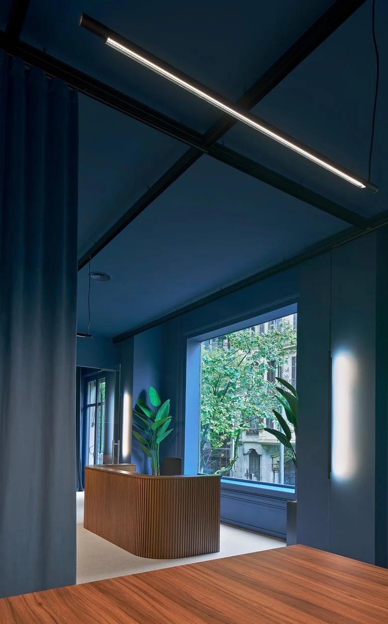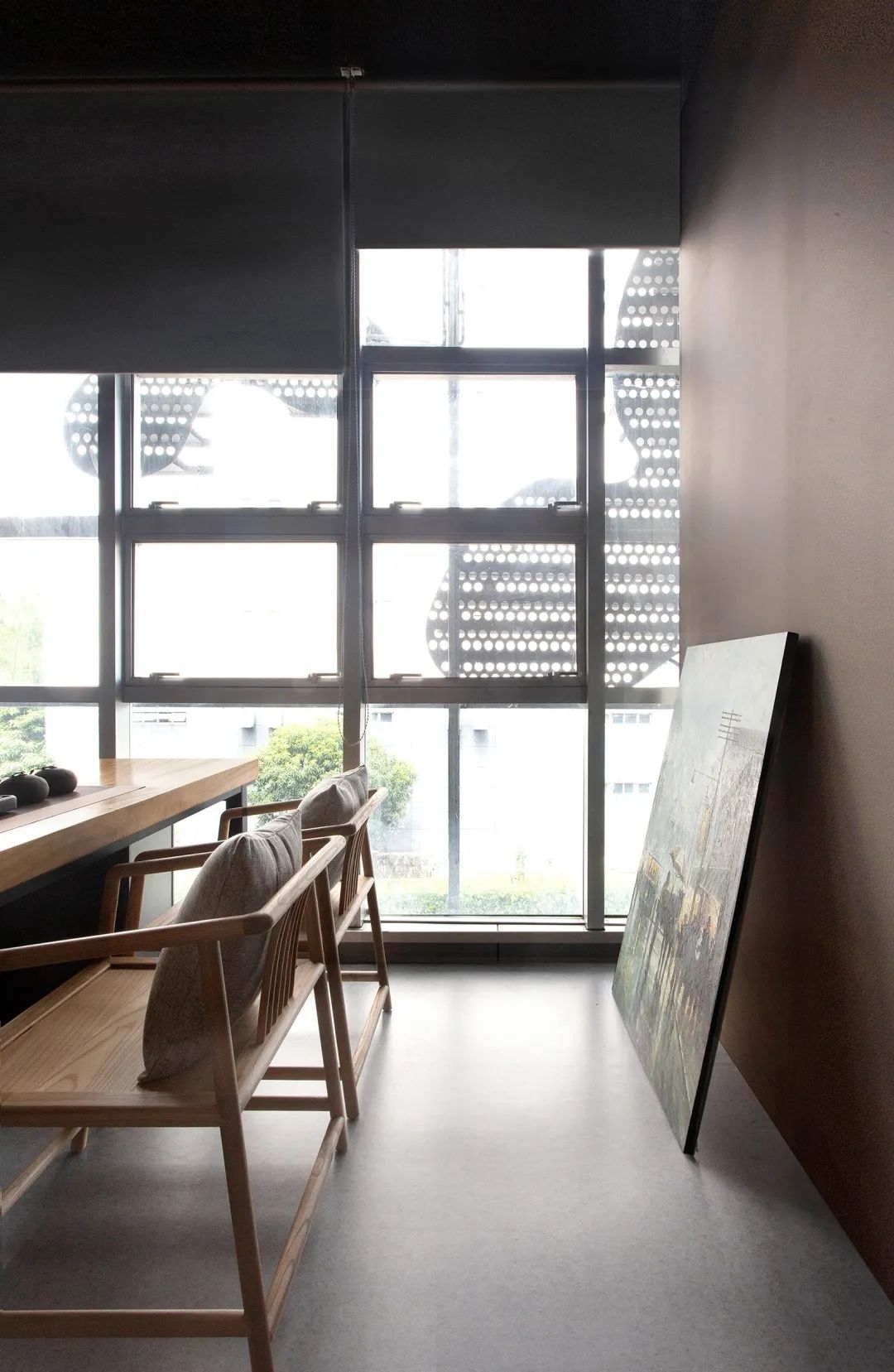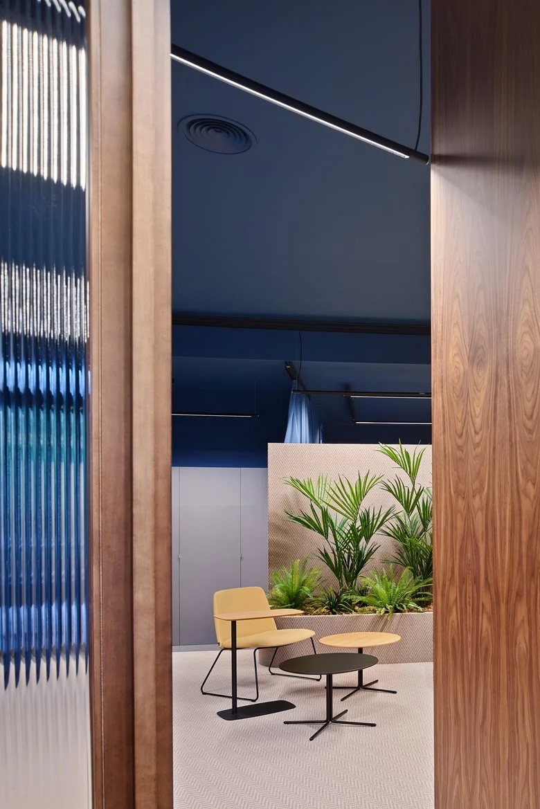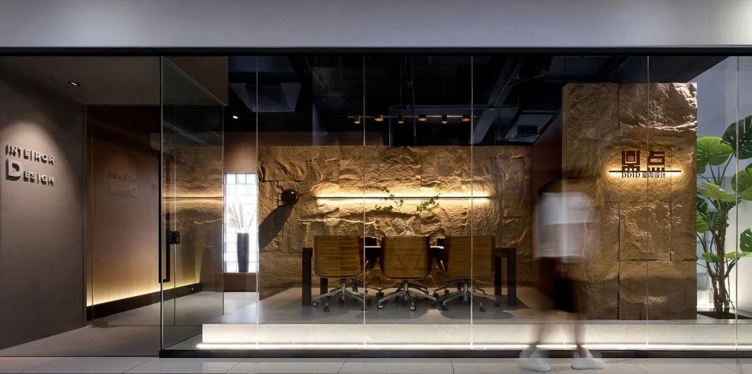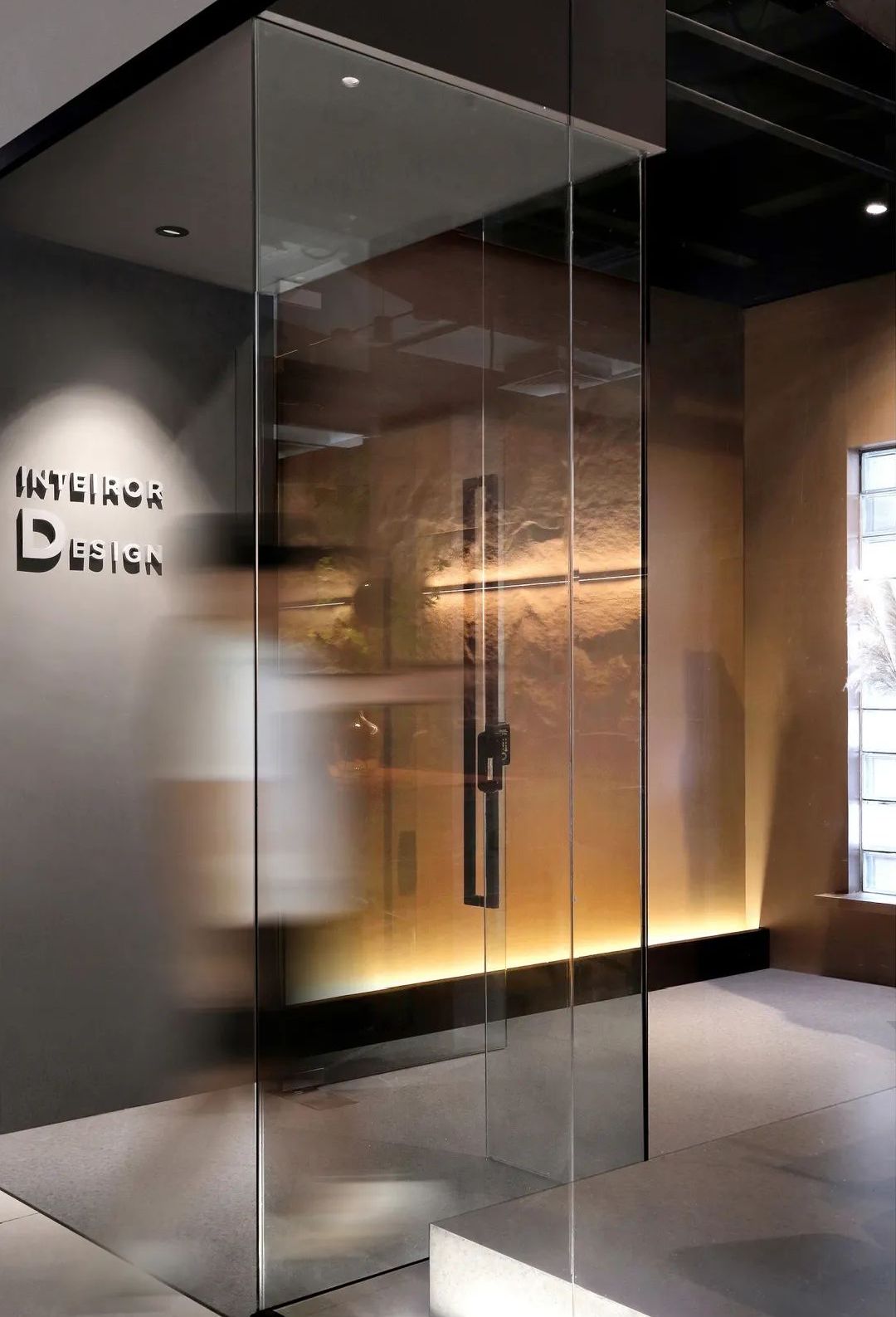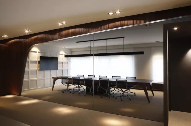 长廊连接会议室和办公室的入口,呈不对称设计。行政办公室和会议室一侧的墙面由美国胡桃木和边缘被切割成弧形的透明落地玻璃组成,内部朴素的标准办公空间一览无余。办公室的门由暗色木材制成,打断玻璃墙面,悬伸在空间之中。