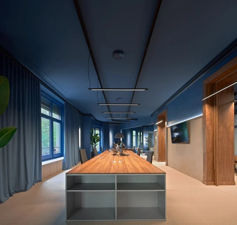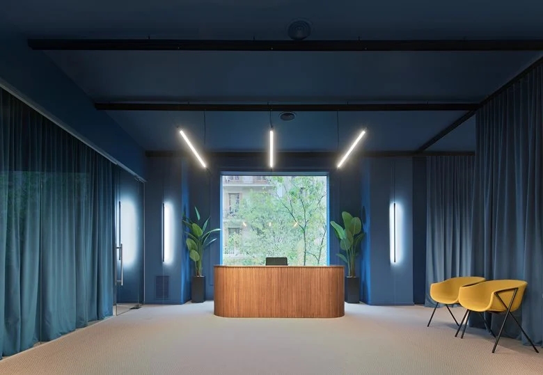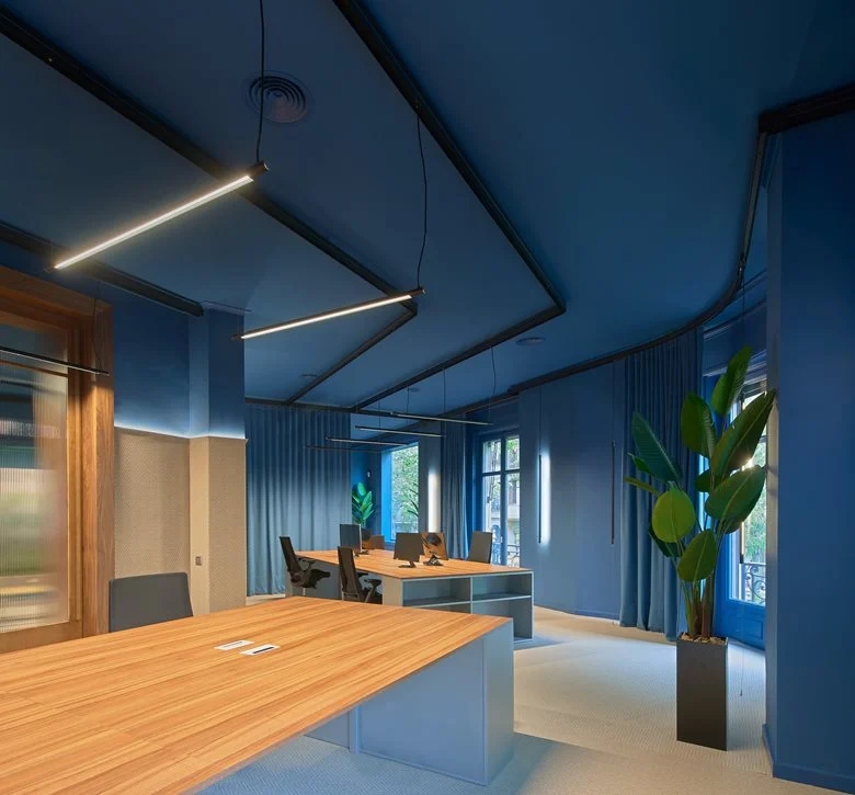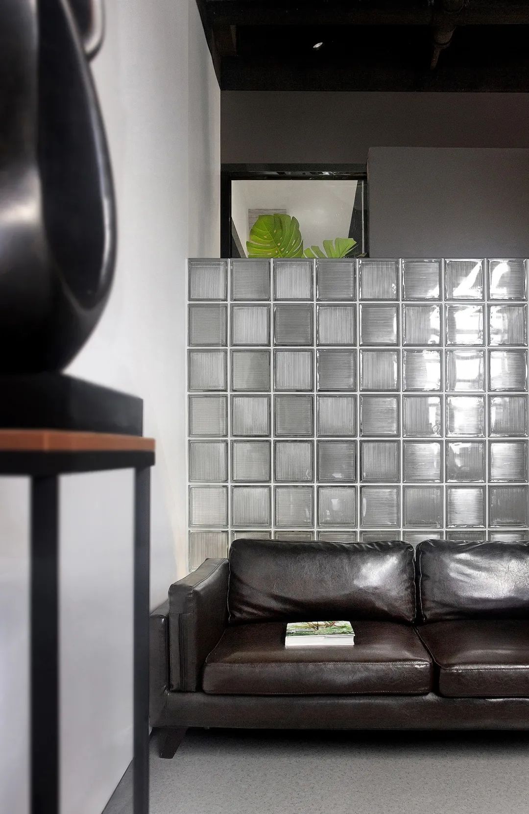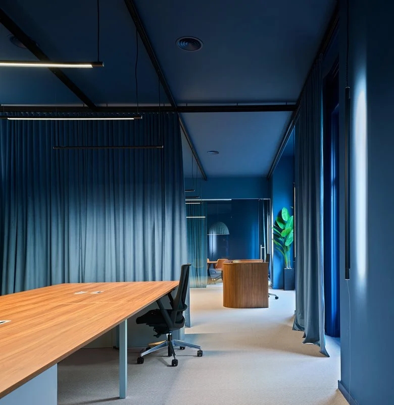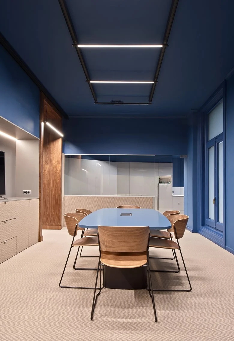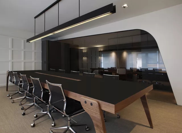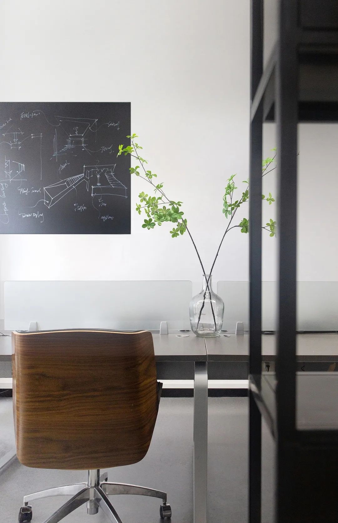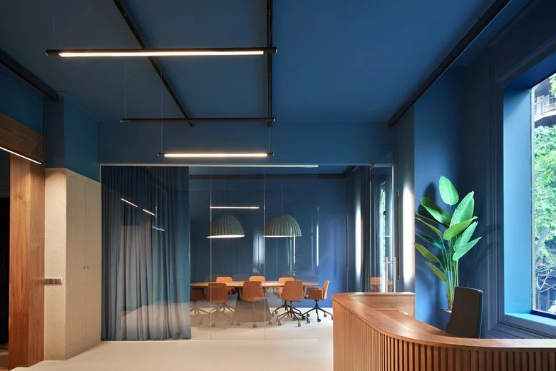 长廊连接会议室和办公室的入口,呈不对称设计。行政办公室和会议室一侧的墙面由美国胡桃木和边缘被切割成弧形的透明落地玻璃组成,内部朴素的标准办公空间一览无余。办公室的门由暗色木材制成,打断玻璃墙面,悬伸在空间之中。